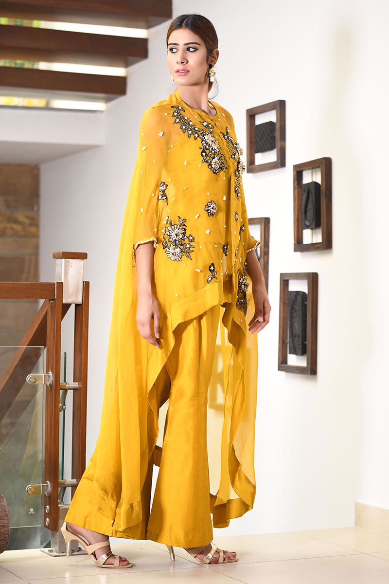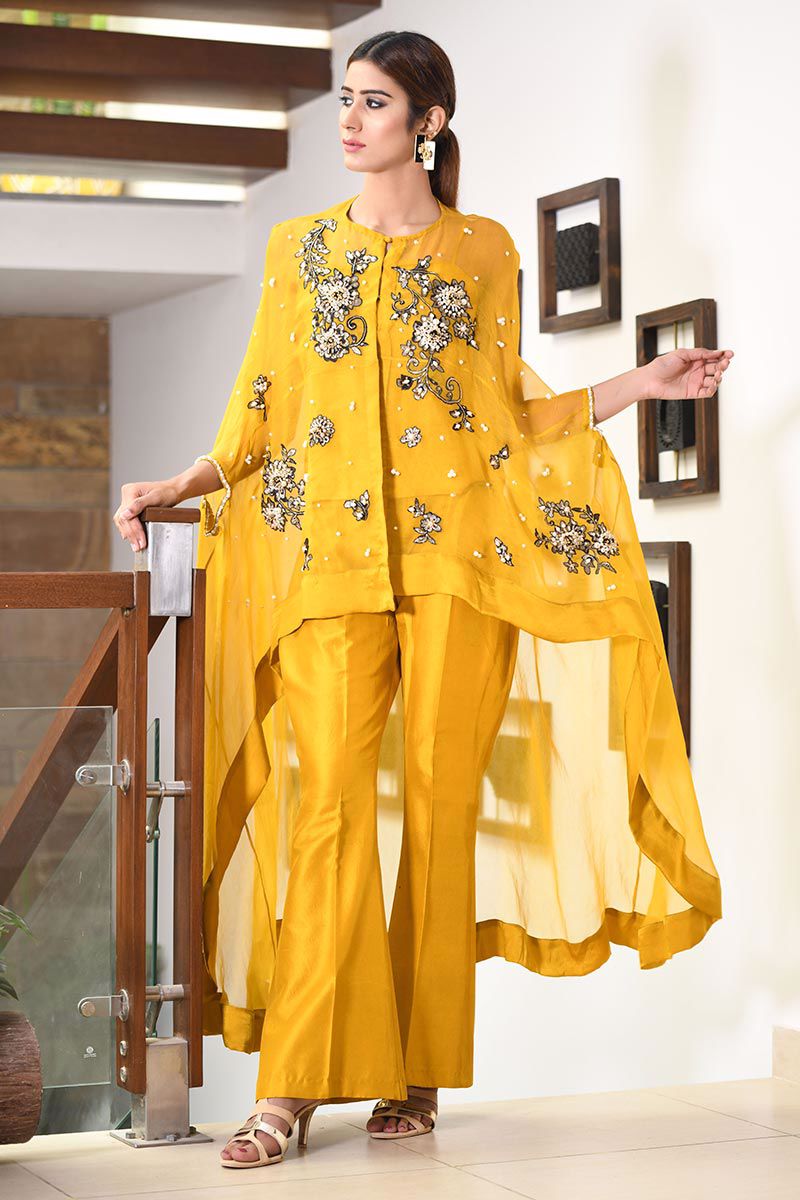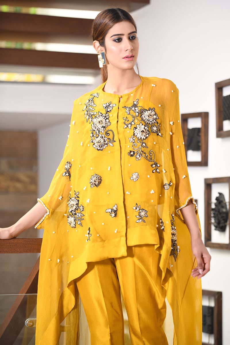 The vivacious crimson Mustard pure organza asymmetrical Cape features floral motifs with accents of pearls, cutdana, stones, crystals, sequins and beads. Slip included. Bootlegs can be bought separately.