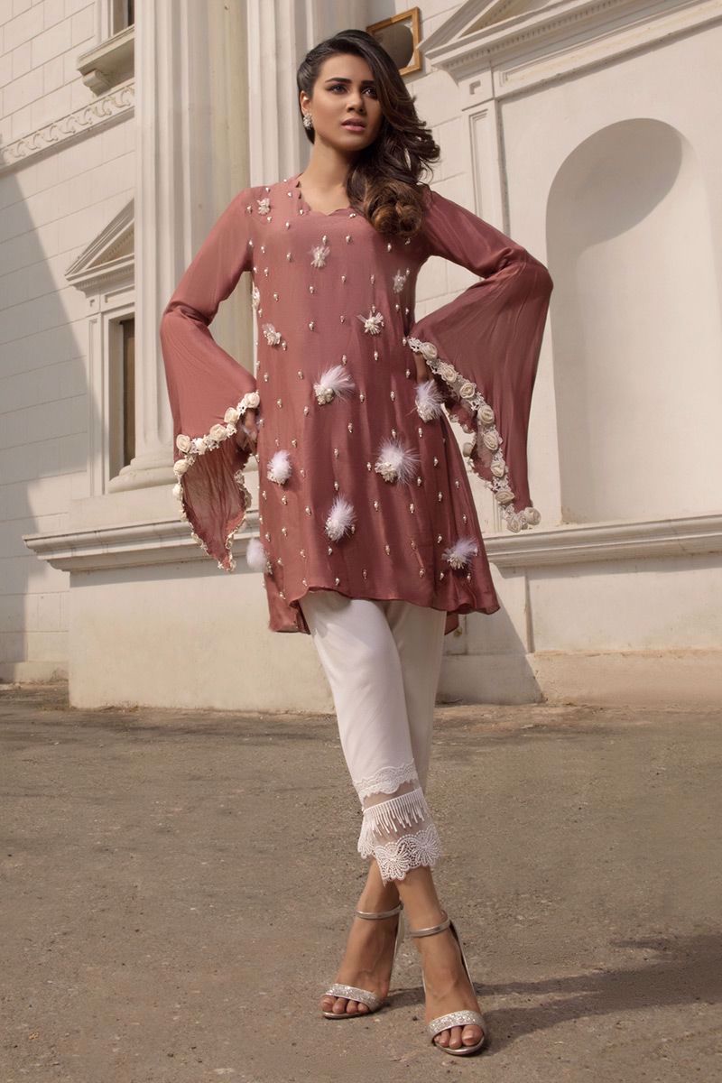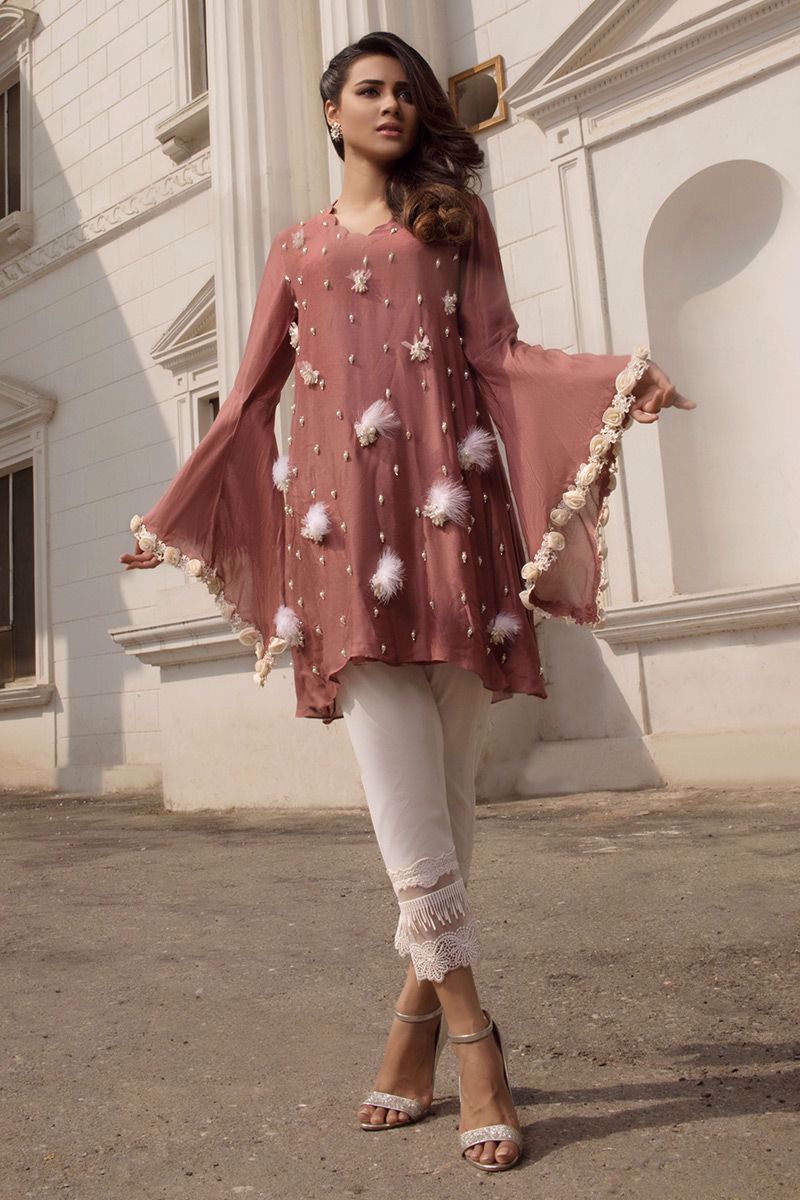 Dusty Pink khadi net Shirt hand worked with pearls, feathers and crystals etc.