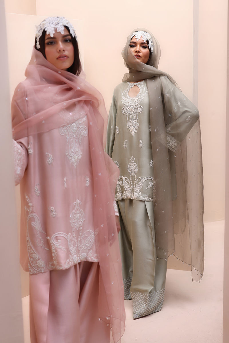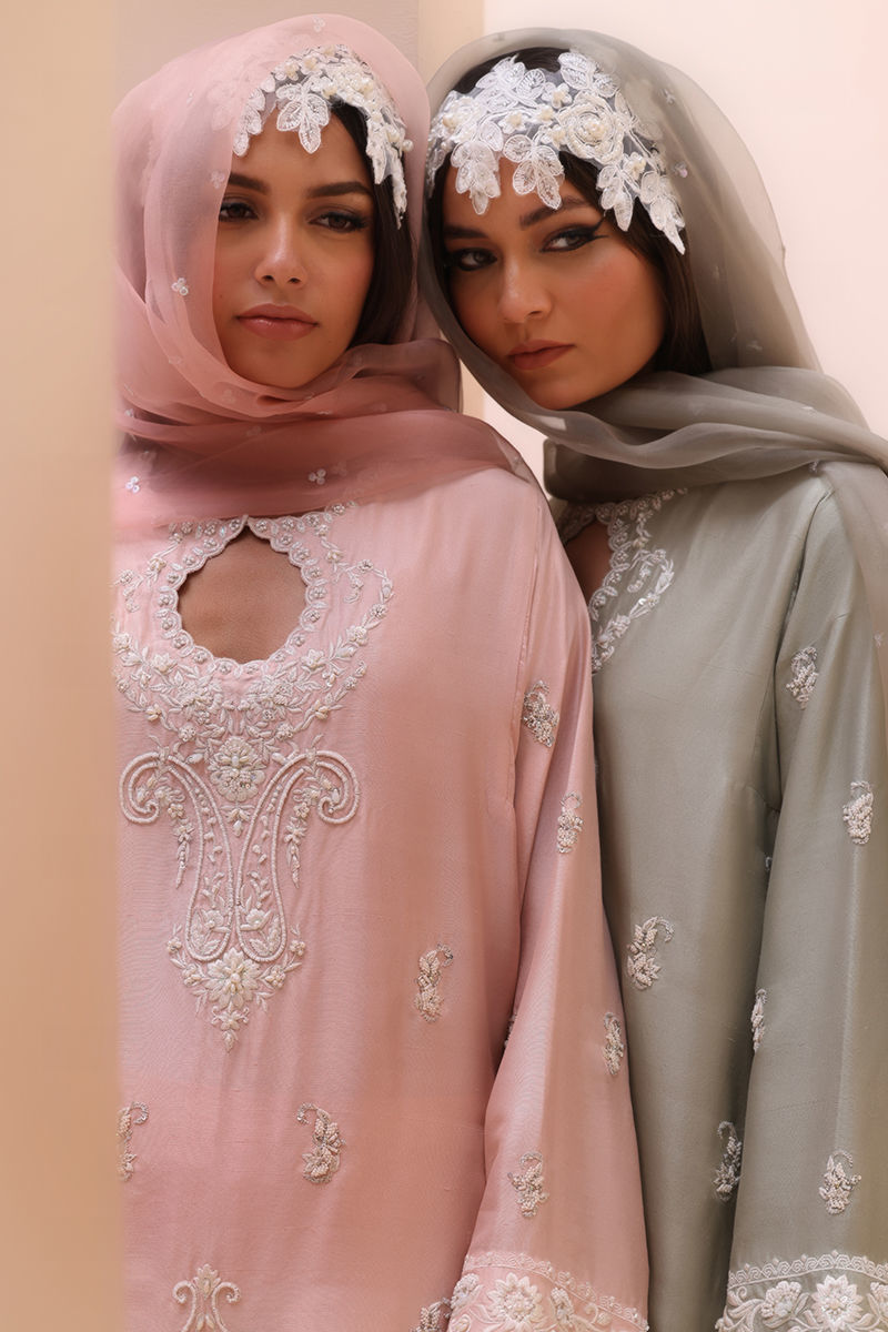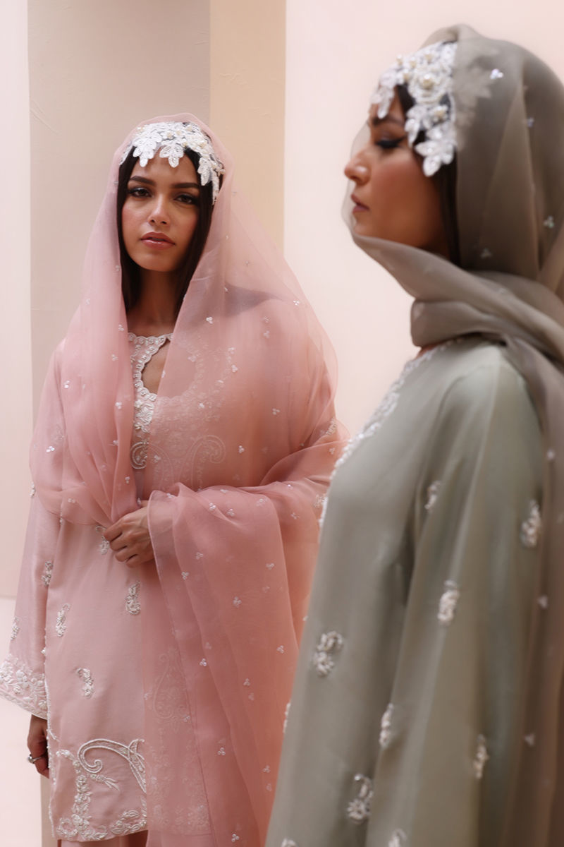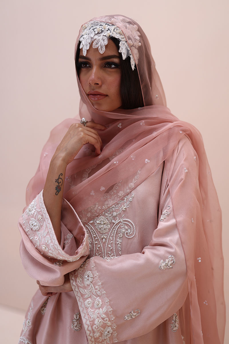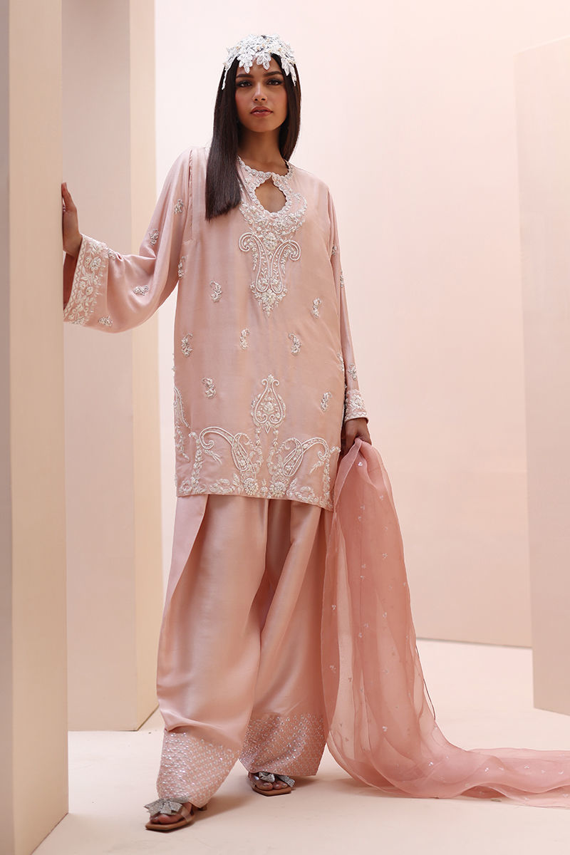 Graceful Soft Pink Ensemble – Crafted from Pure Raw Silk for the Shirt and Shalwar and delicate Pure Organza for the Dupatta, this exquisite outfit features all-over Ivory Resham and Lorix embroidery. Enhanced with intricate handwork using Moti, Crystals, Tikki Stones, Sequins, Cutdana, and Pearls, it boasts a stunning sequins handwork border. The dupatta is adorned with all-over sequins chan and crystal hangings on the pallu, adding a touch of ethereal elegance.