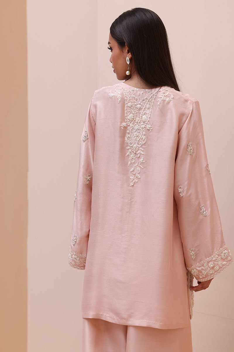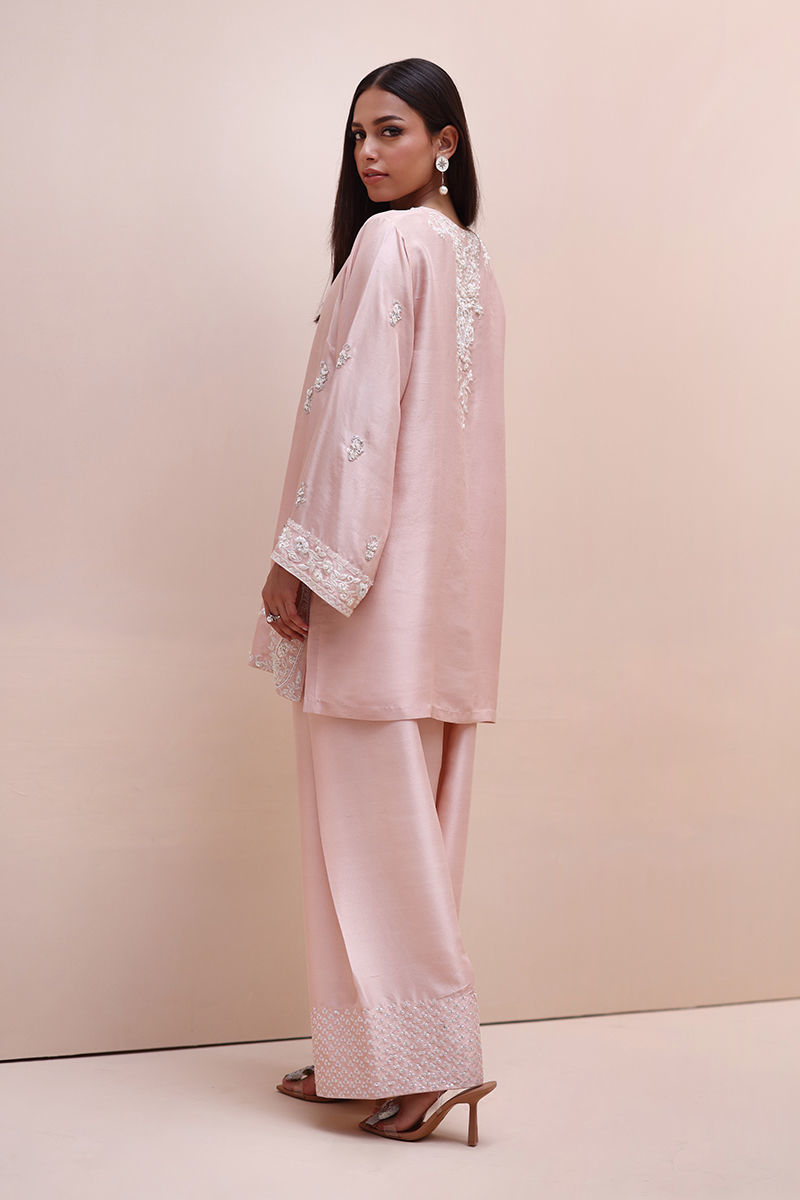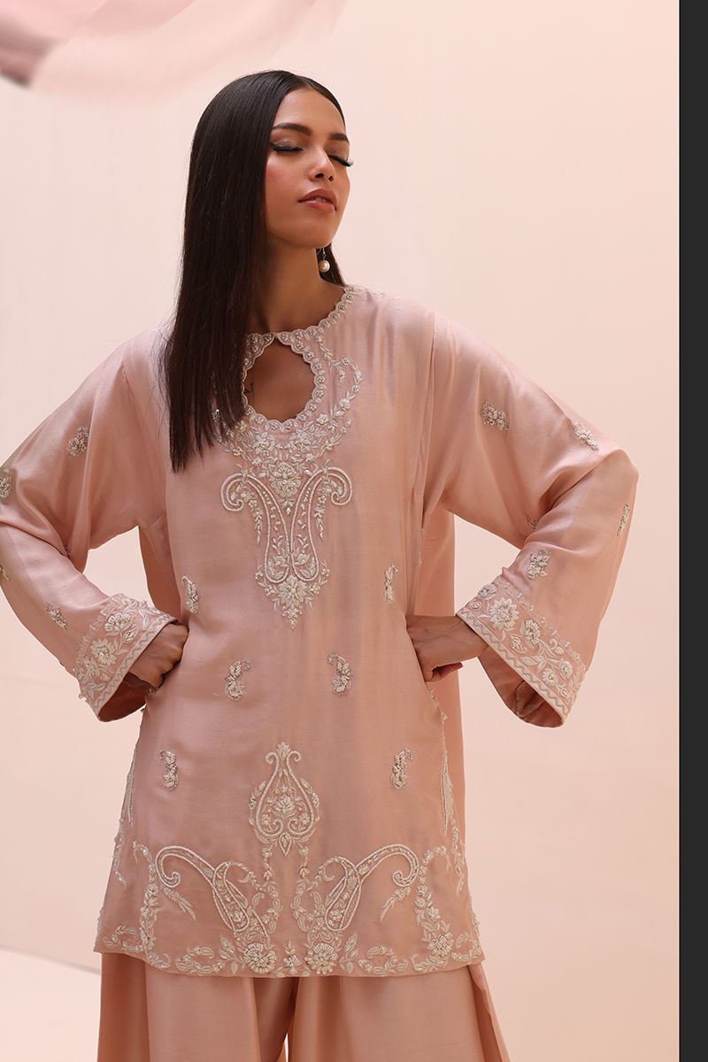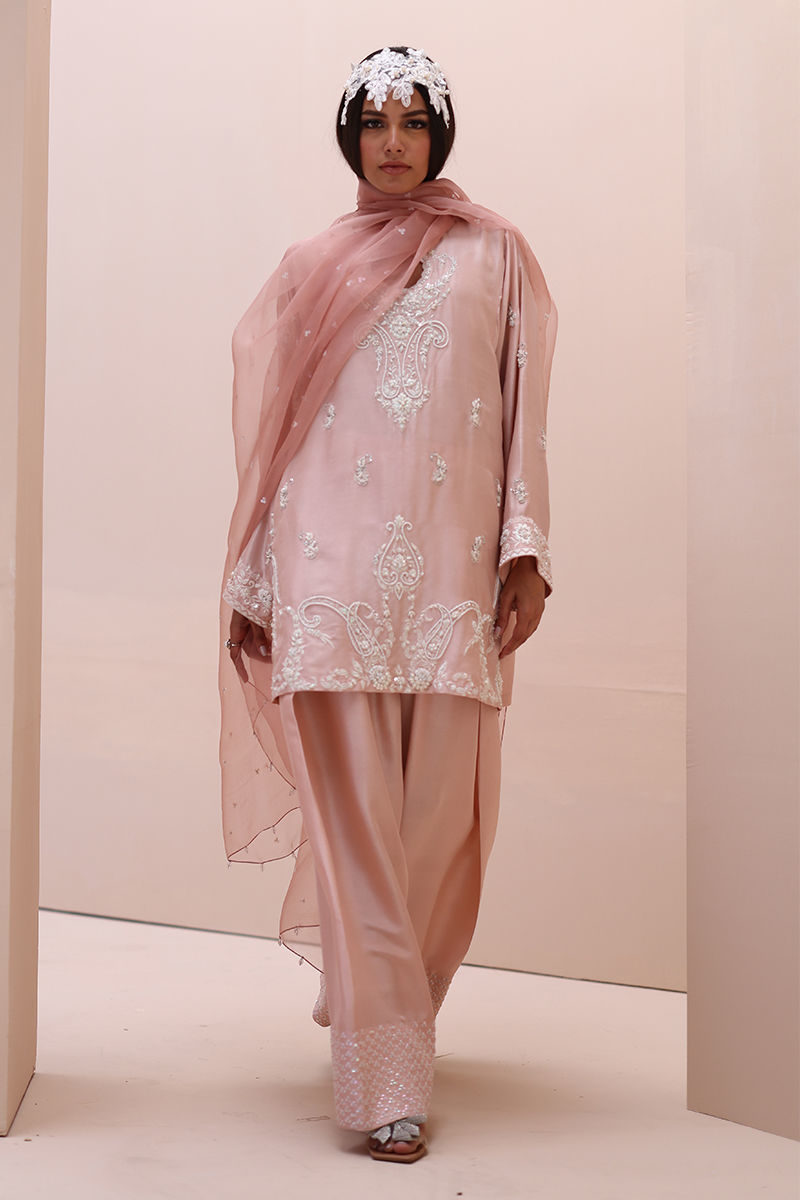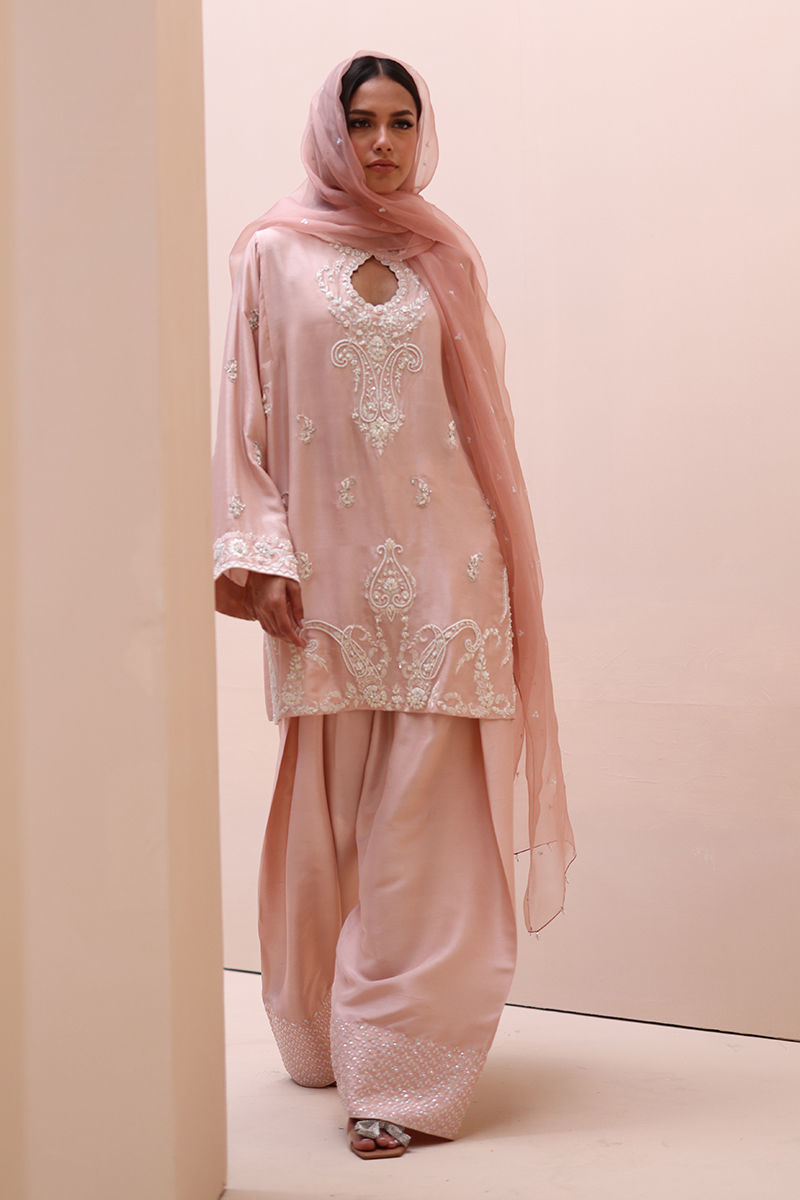 Graceful Soft Pink Ensemble – Crafted from Pure Raw Silk for the Shirt and Shalwar and delicate Pure Organza for the Dupatta, this exquisite outfit features all-over Ivory Resham and Lorix embroidery. Enhanced with intricate handwork using Moti, Crystals, Tikki Stones, Sequins, Cutdana, and Pearls, it boasts a stunning sequins handwork border. The dupatta is adorned with all-over sequins chan and crystal hangings on the pallu, adding a touch of ethereal elegance.