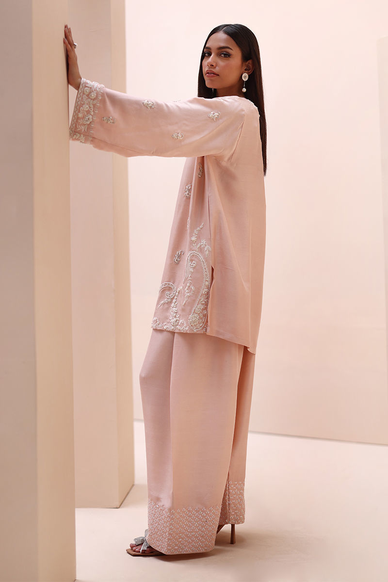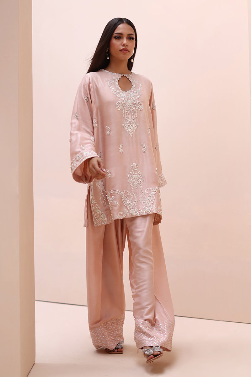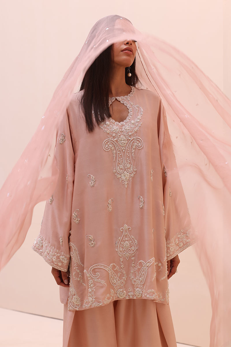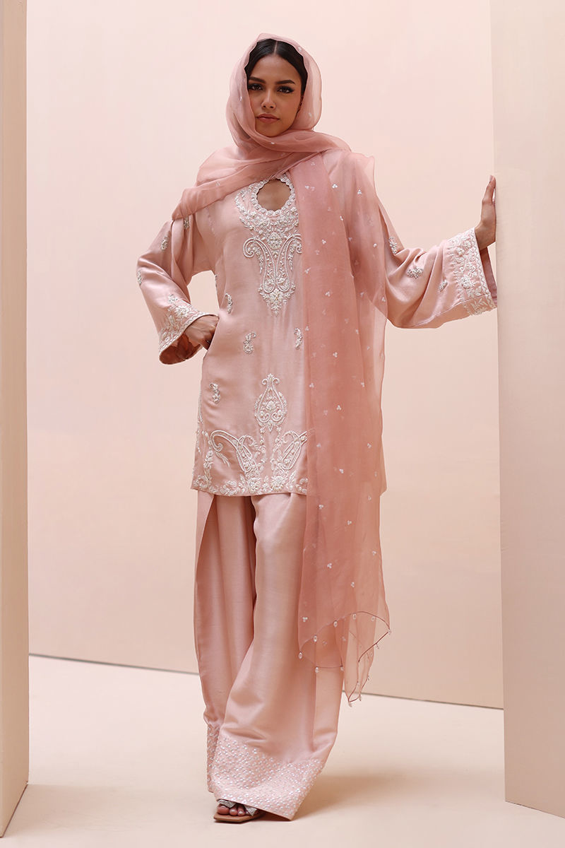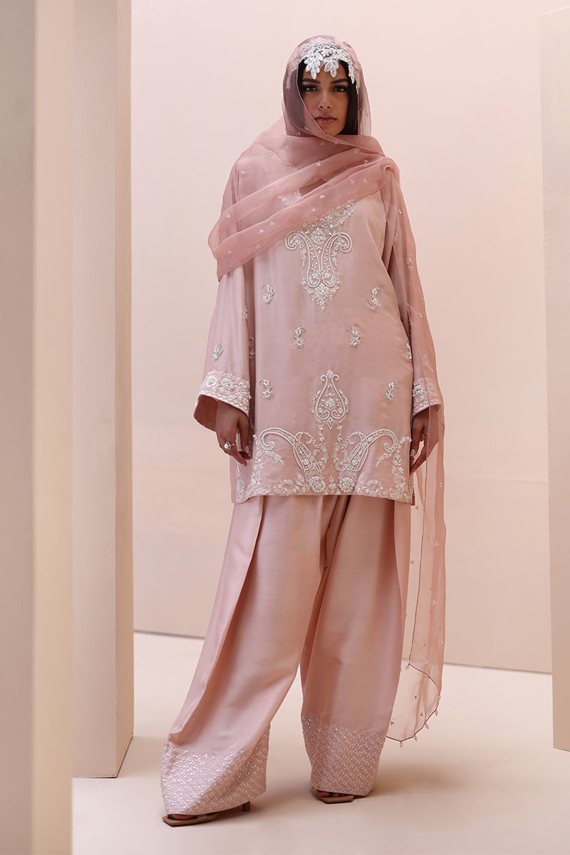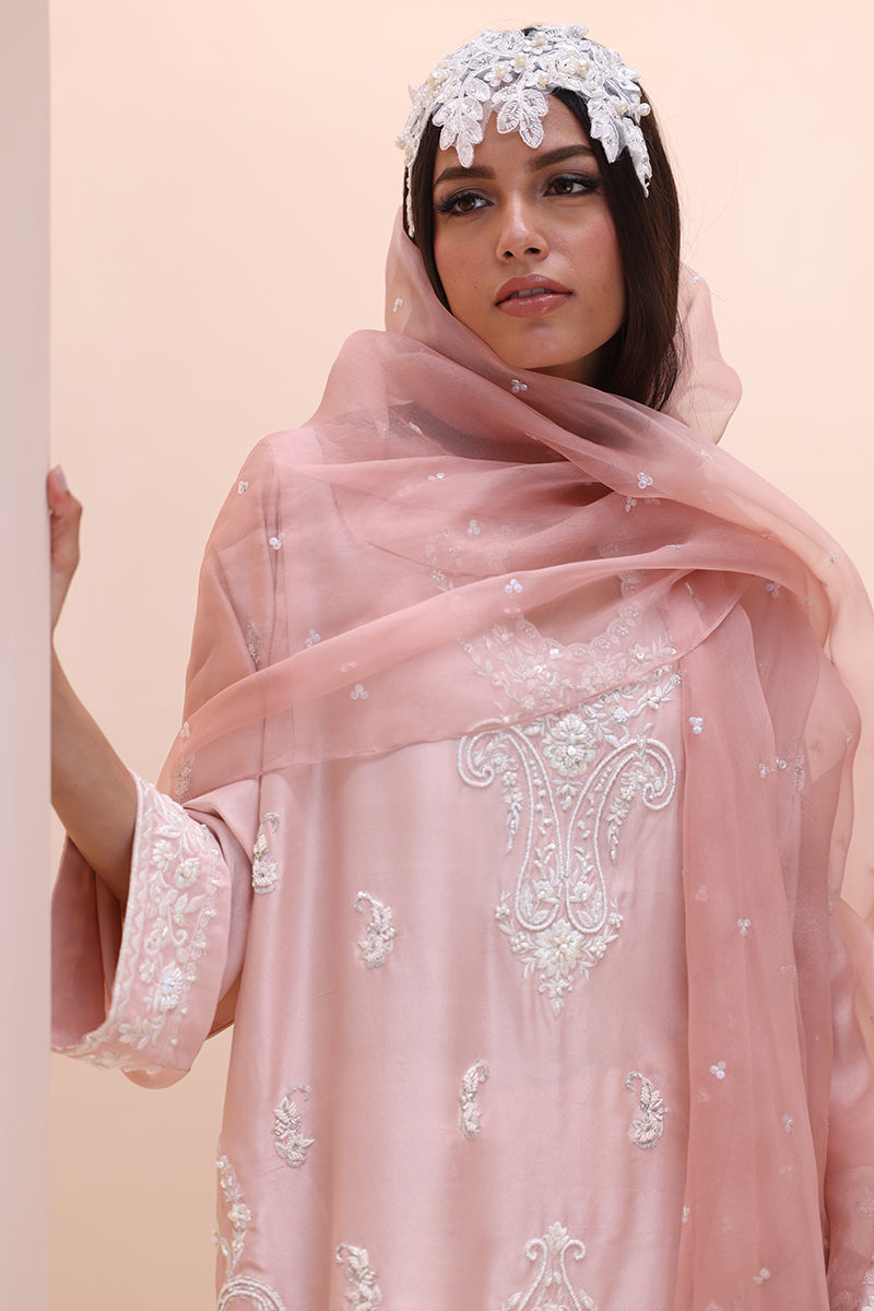 Graceful Soft Pink Ensemble – Crafted from Pure Raw Silk for the Shirt and Shalwar and delicate Pure Organza for the Dupatta, this exquisite outfit features all-over Ivory Resham and Lorix embroidery. Enhanced with intricate handwork using Moti, Crystals, Tikki Stones, Sequins, Cutdana, and Pearls, it boasts a stunning sequins handwork border. The dupatta is adorned with all-over sequins chan and crystal hangings on the pallu, adding a touch of ethereal elegance.
