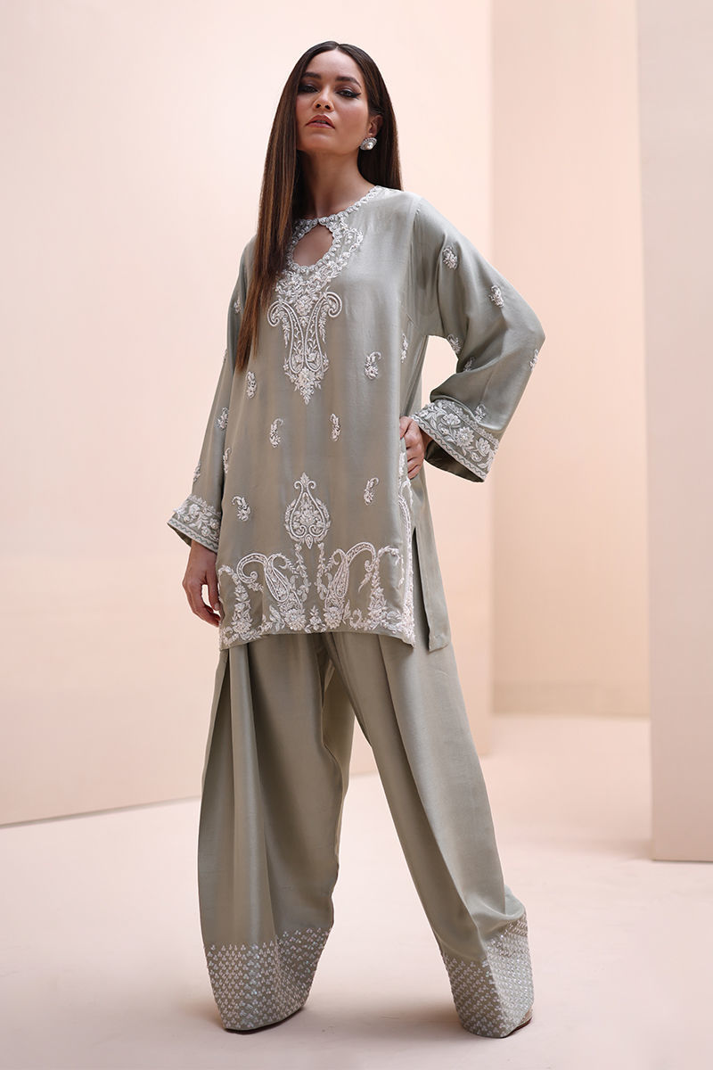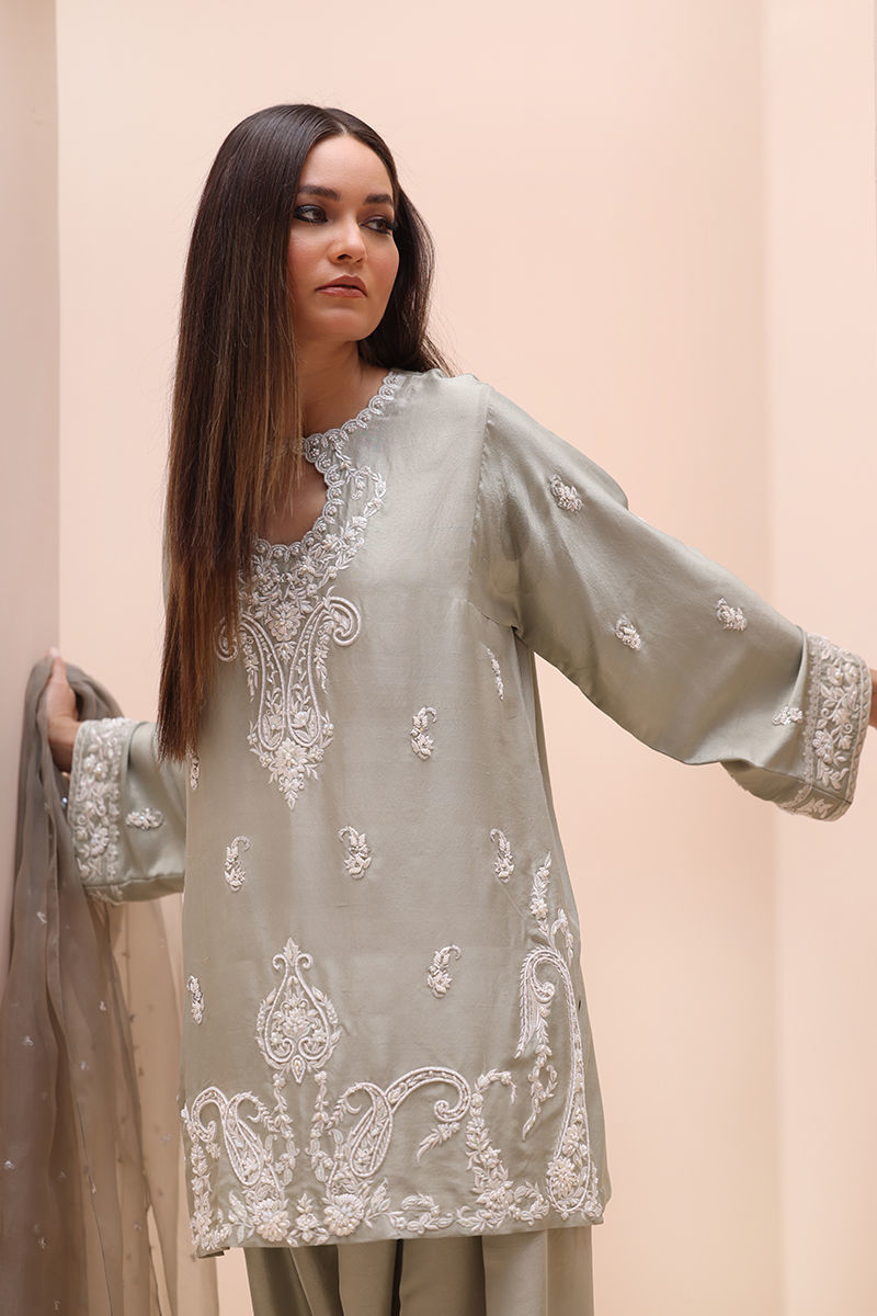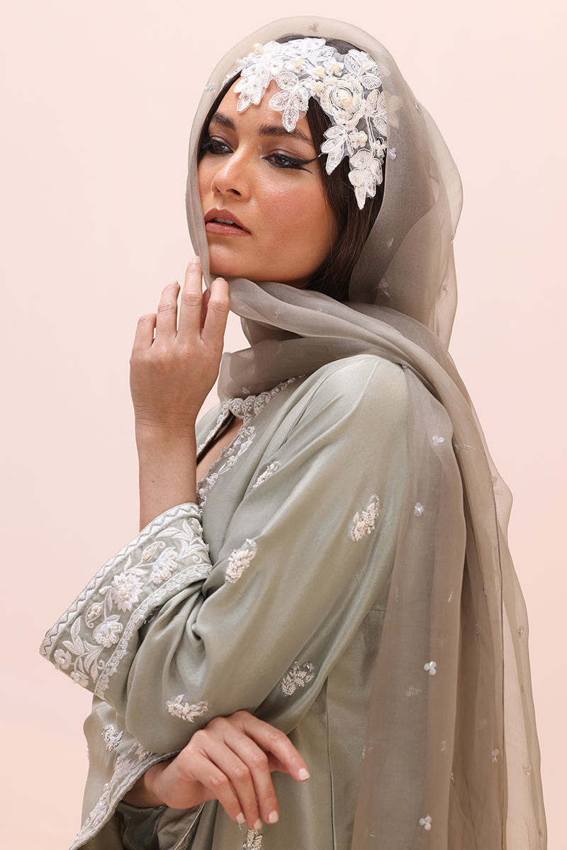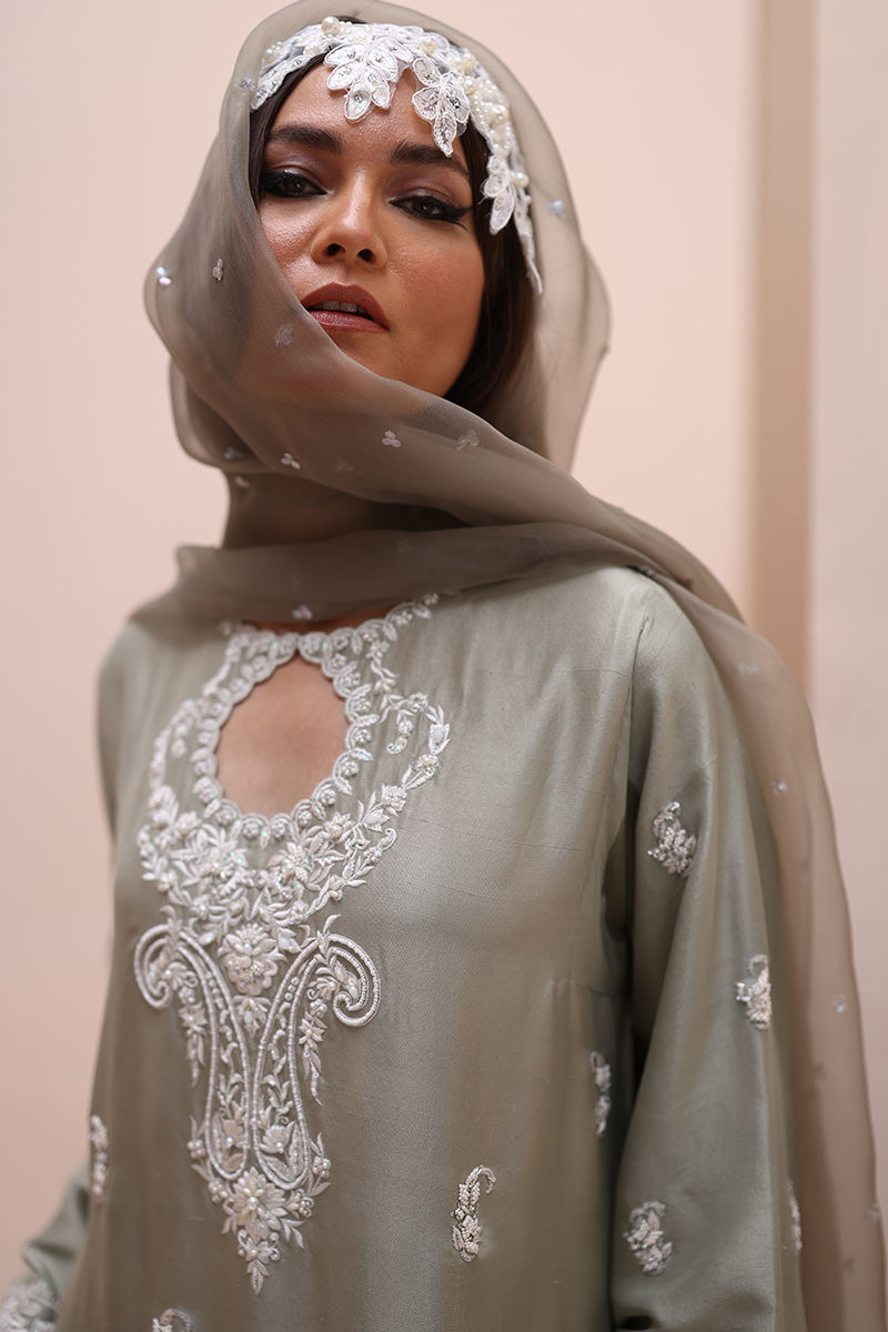 Timeless Elegance in Desert Sage – This luxurious ensemble is crafted from Pure Raw Silk for the Shirt and Shalwar, complemented by a delicate Pure Organza Dupatta. Adorned with intricate all-over Ivory Resham and Lorix embroidery, it features exquisite handwork detailing with Moti, Crystals, Tikki Stones, Sequins, Cutdana, and Pearls. The ensemble is further enhanced with a sequins handwork border, while the dupatta showcases all-over sequins chan with crystal hangings on the pallu, exuding sophistication and charm.