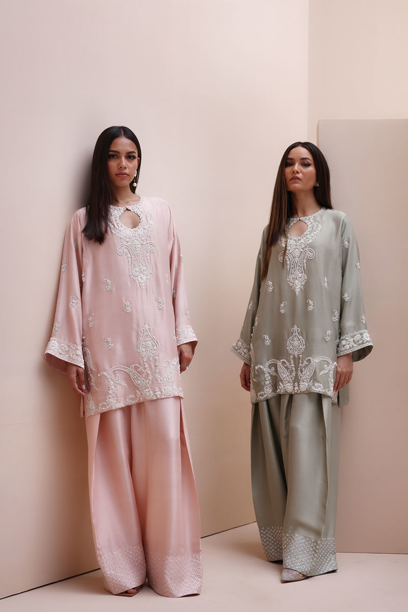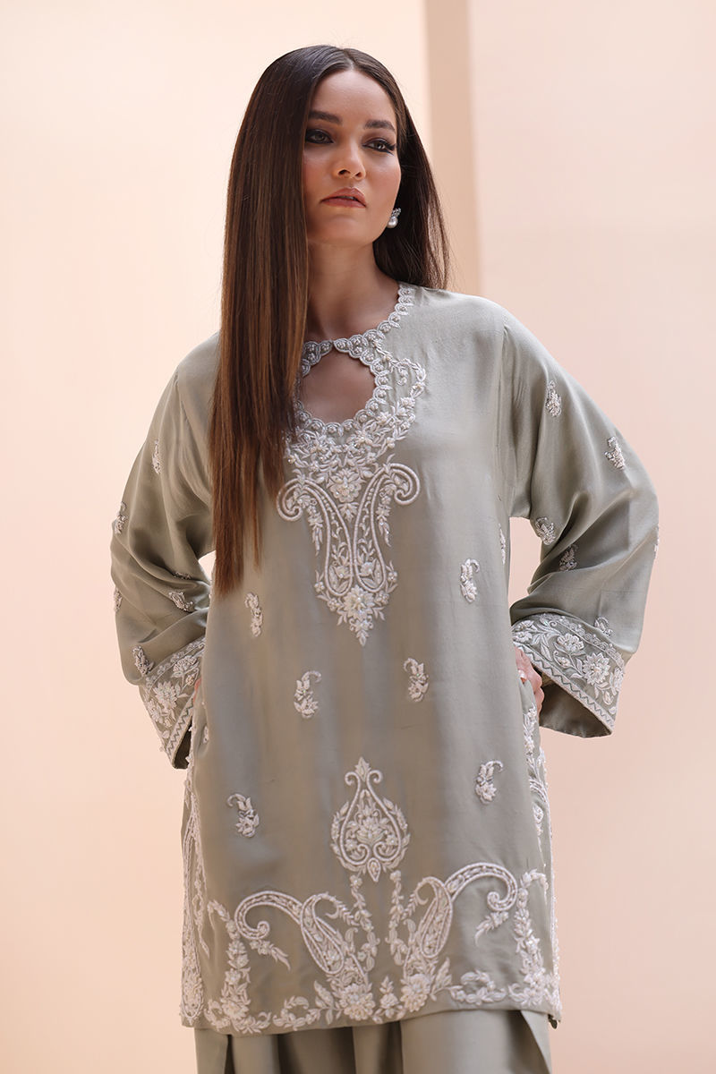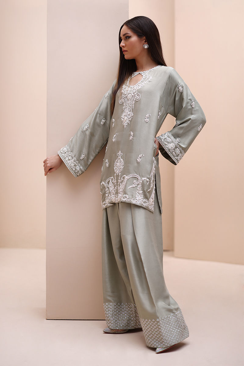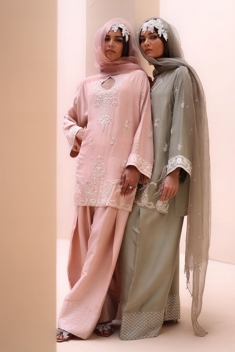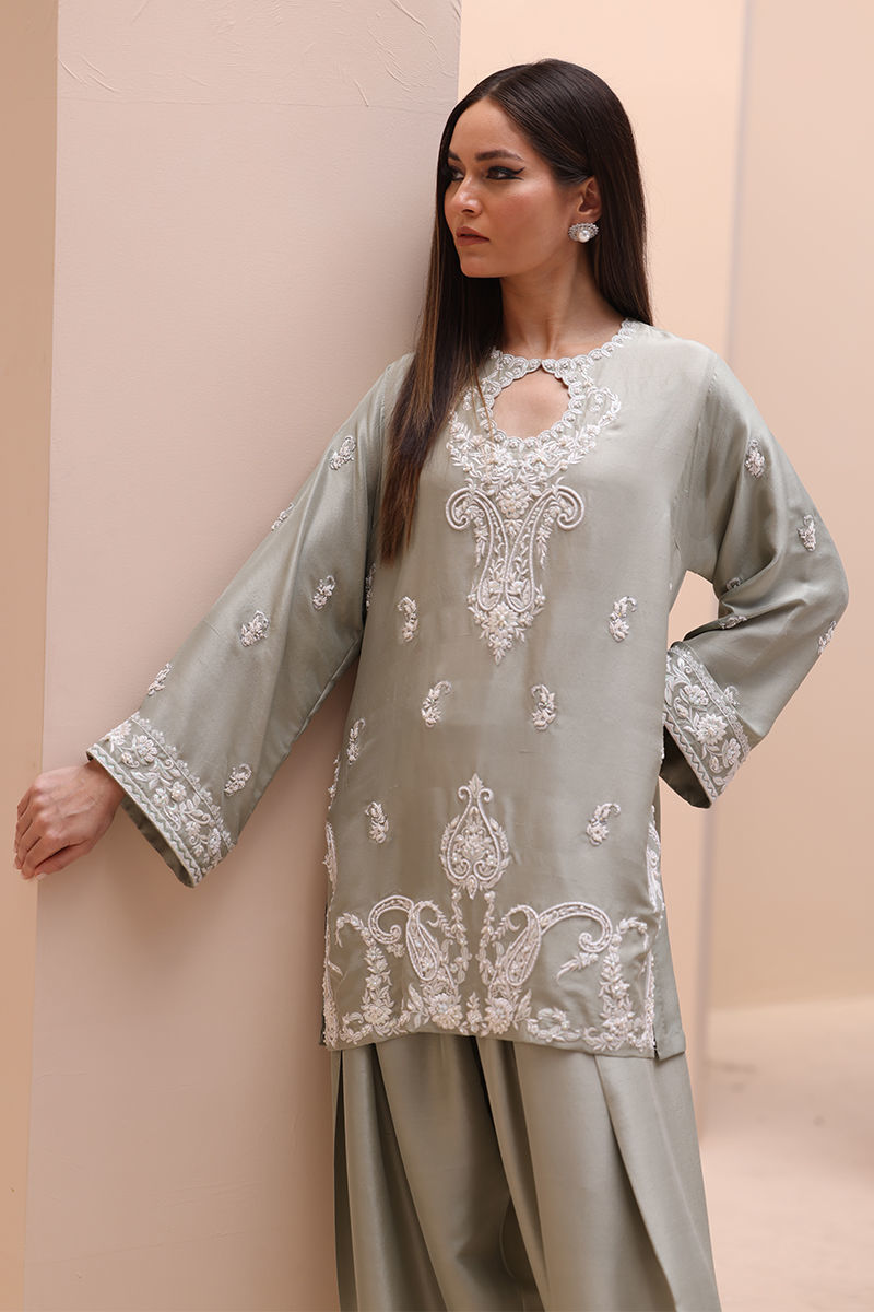 Timeless Elegance in Desert Sage – This luxurious ensemble is crafted from Pure Raw Silk for the Shirt and Shalwar, complemented by a delicate Pure Organza Dupatta. Adorned with intricate all-over Ivory Resham and Lorix embroidery, it features exquisite handwork detailing with Moti, Crystals, Tikki Stones, Sequins, Cutdana, and Pearls. The ensemble is further enhanced with a sequins handwork border, while the dupatta showcases all-over sequins chan with crystal hangings on the pallu, exuding sophistication and charm.