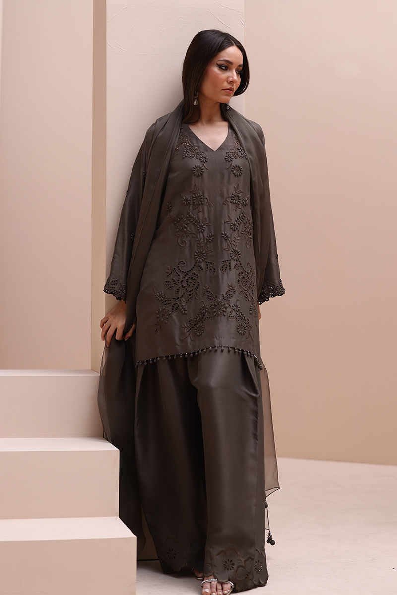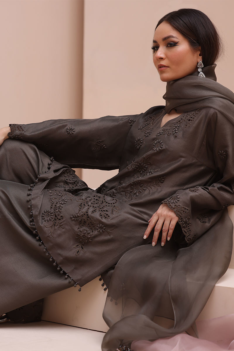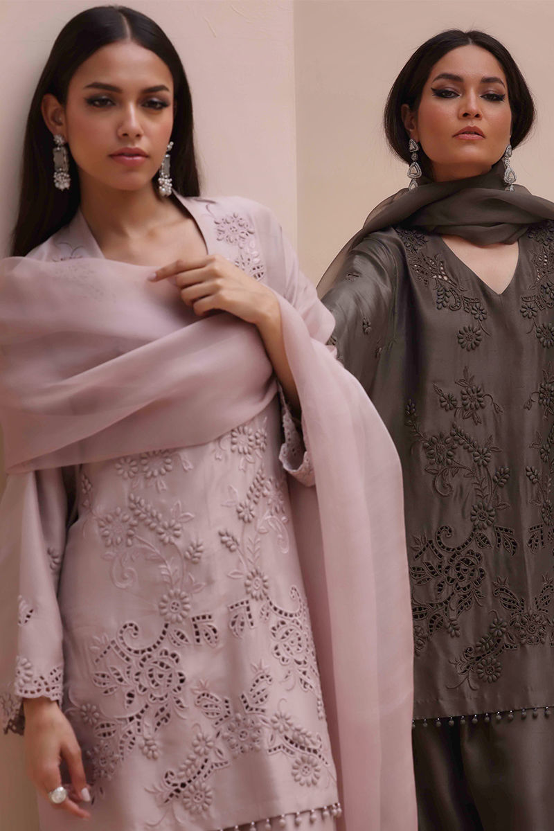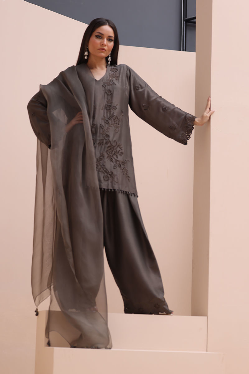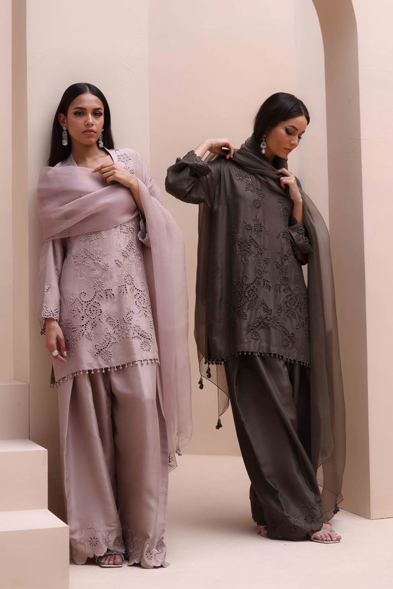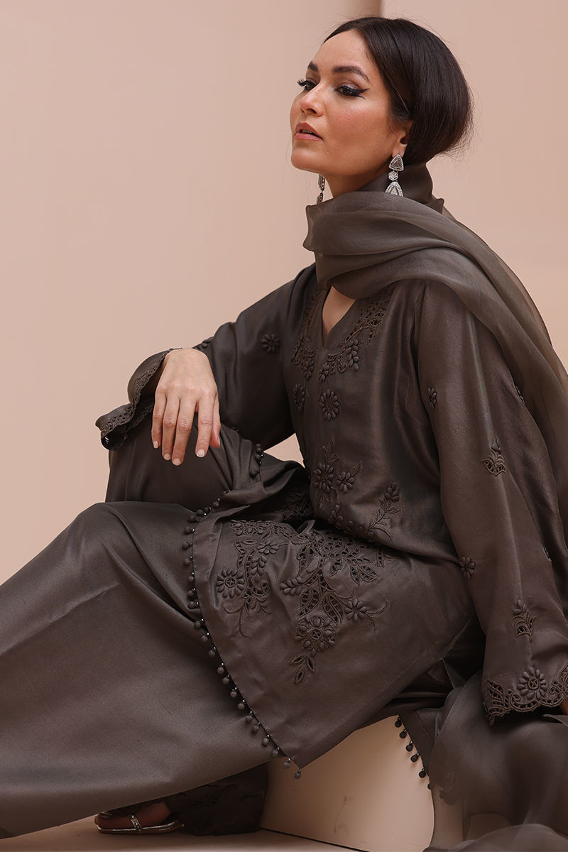 Sophisticated Charm in Rock Ridge – This exquisite ensemble is crafted from Pure Raw Silk for the Shirt and Shalwar, paired with a delicate Pure Organza Dupatta. Featuring all-over self-Resham embroidery with intricate cutwork, it is further enhanced with handcrafted patels and handmade hangings on the daman. The shalwar showcases elegant Resham embroidery on the bottom, while the dupatta is adorned with handcrafted tassels on the pallu, creating a perfect fusion of elegance and artisanal craftsmanship.