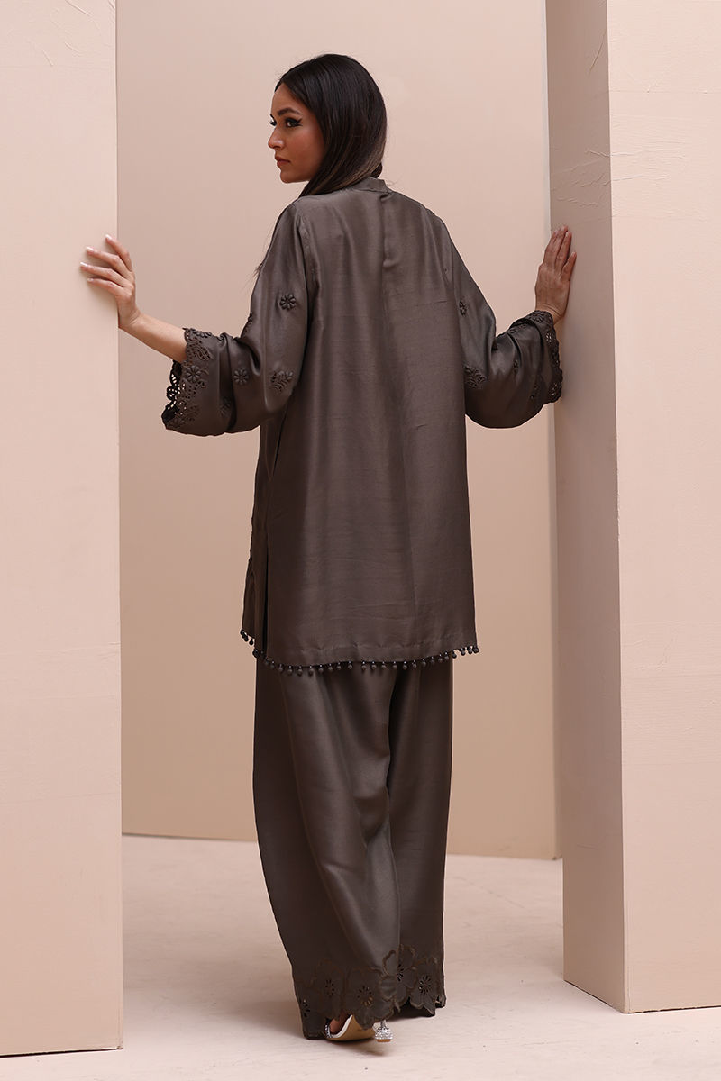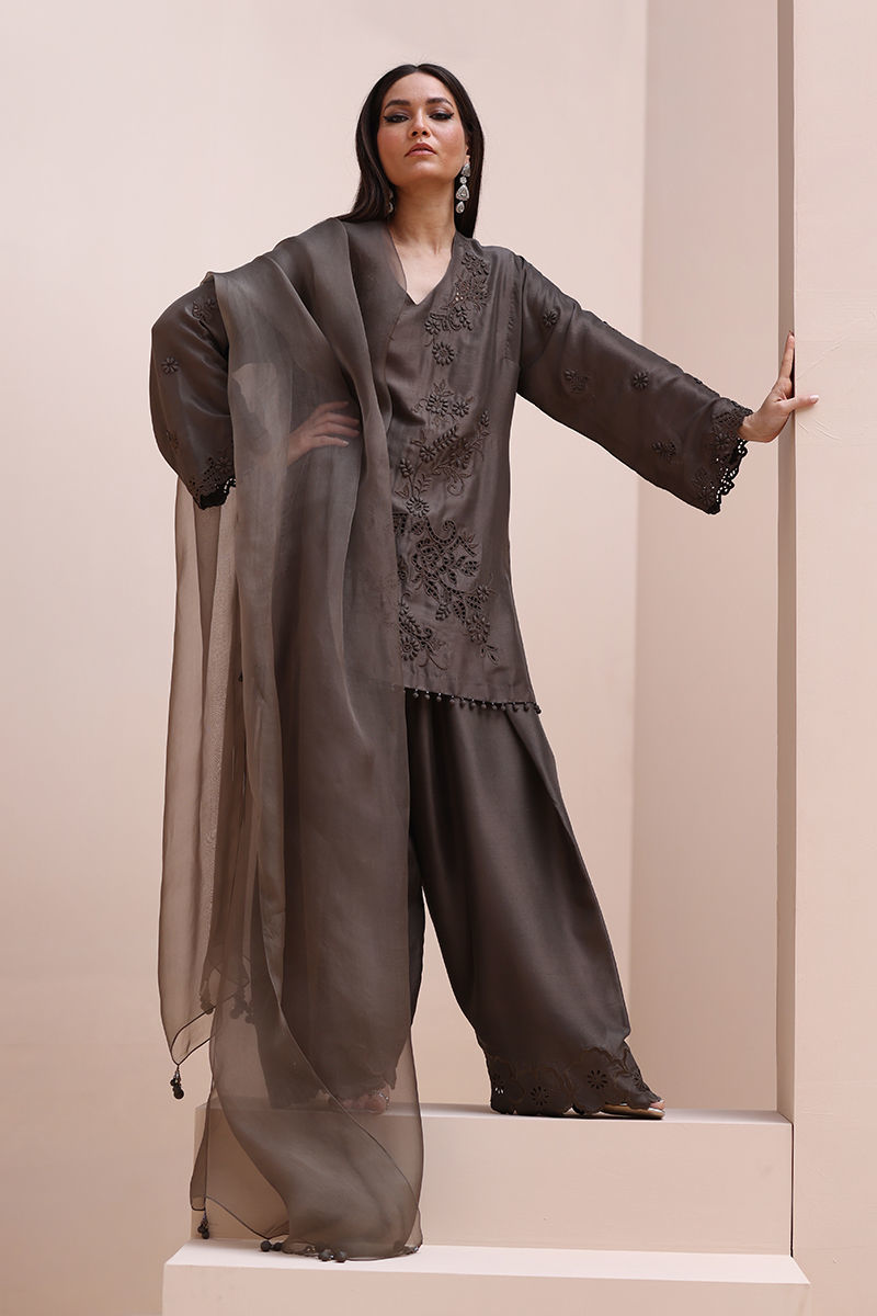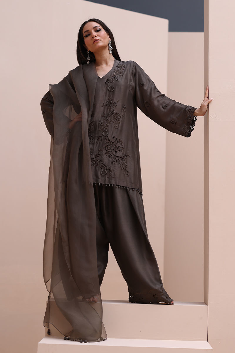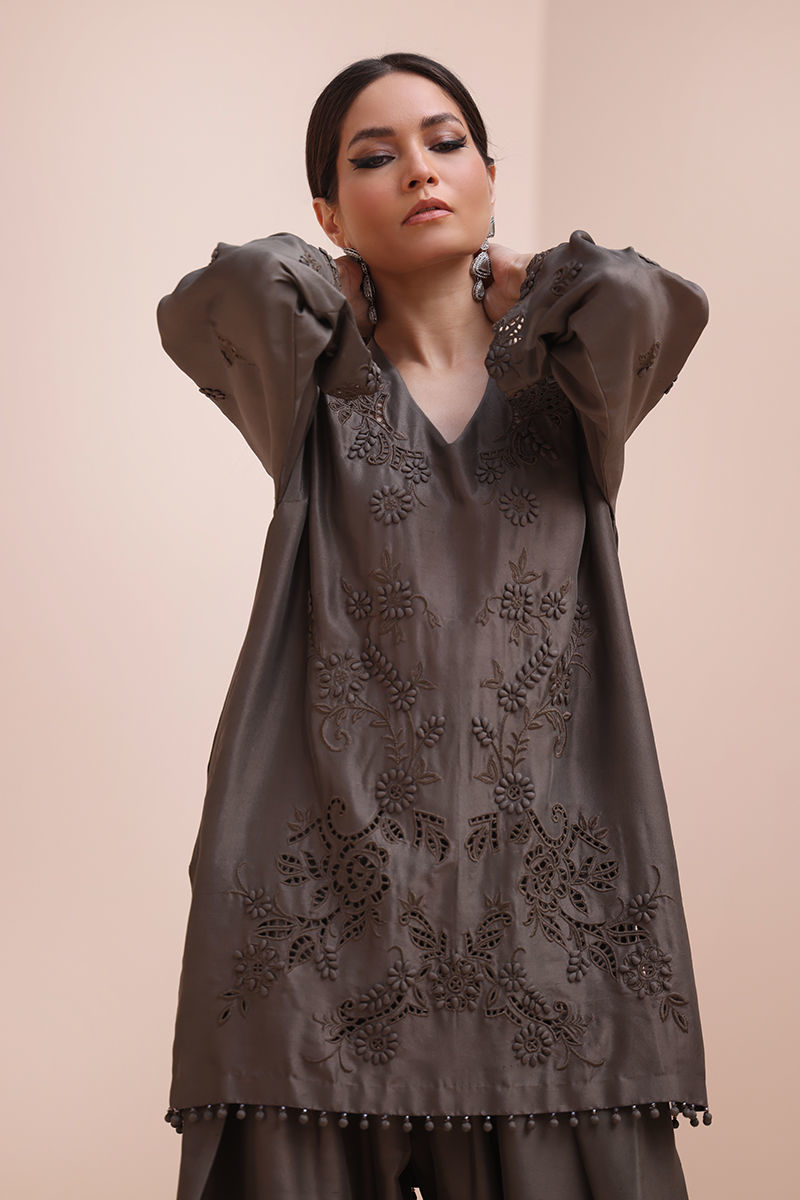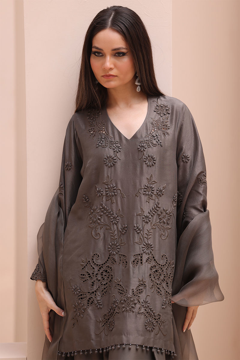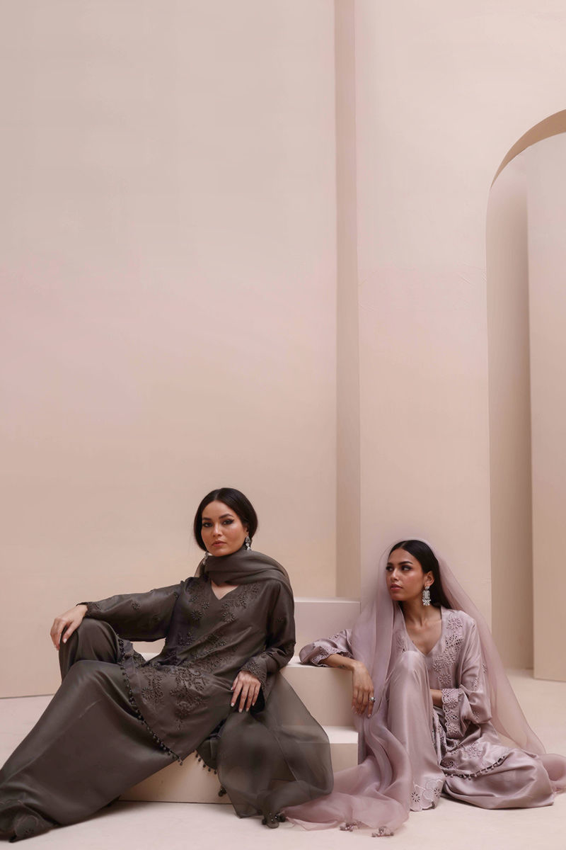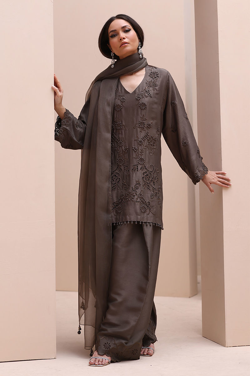 Sophisticated Charm in Rock Ridge – This exquisite ensemble is crafted from Pure Raw Silk for the Shirt and Shalwar, paired with a delicate Pure Organza Dupatta. Featuring all-over self-Resham embroidery with intricate cutwork, it is further enhanced with handcrafted patels and handmade hangings on the daman. The shalwar showcases elegant Resham embroidery on the bottom, while the dupatta is adorned with handcrafted tassels on the pallu, creating a perfect fusion of elegance and artisanal craftsmanship.