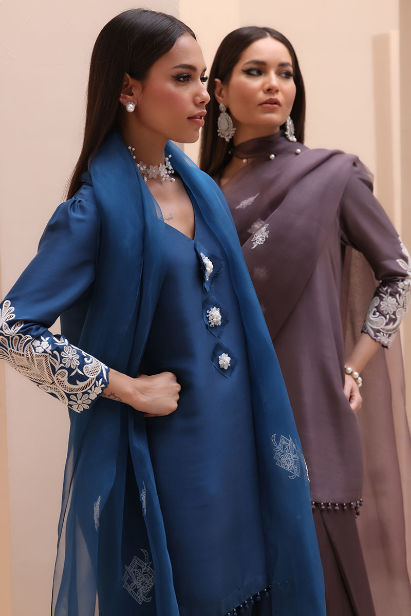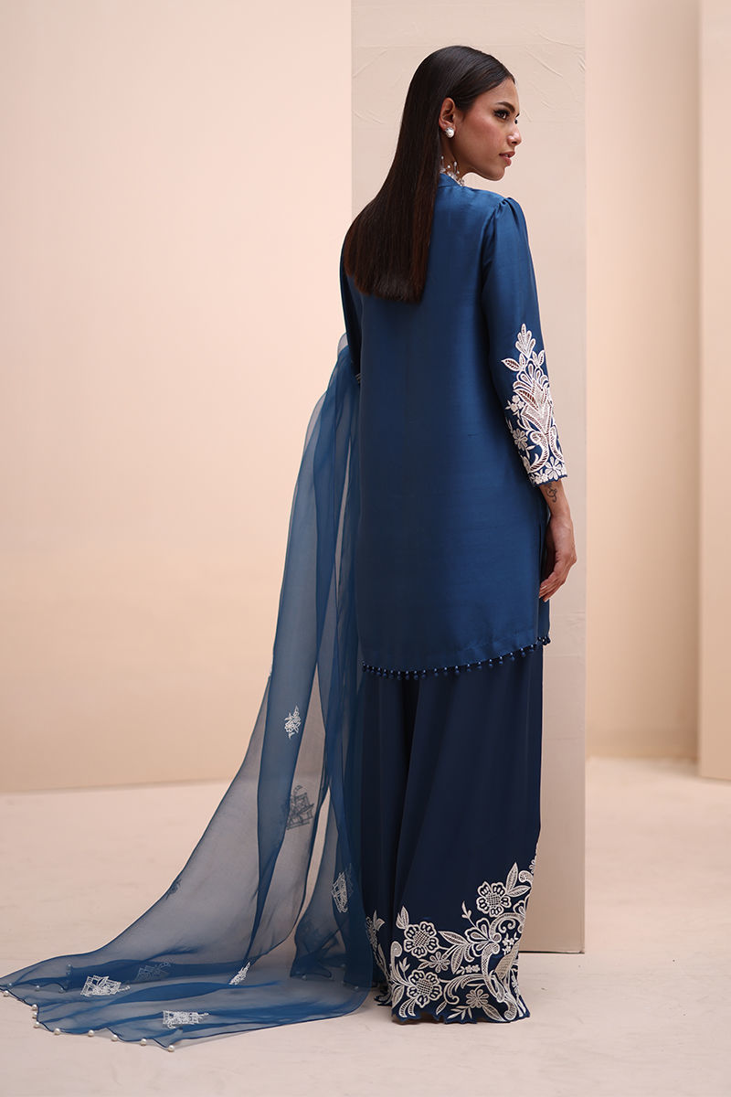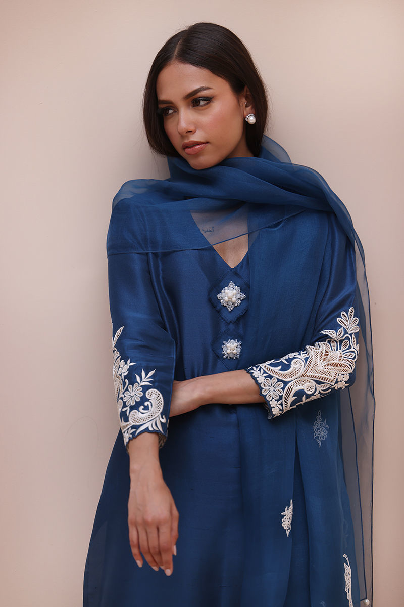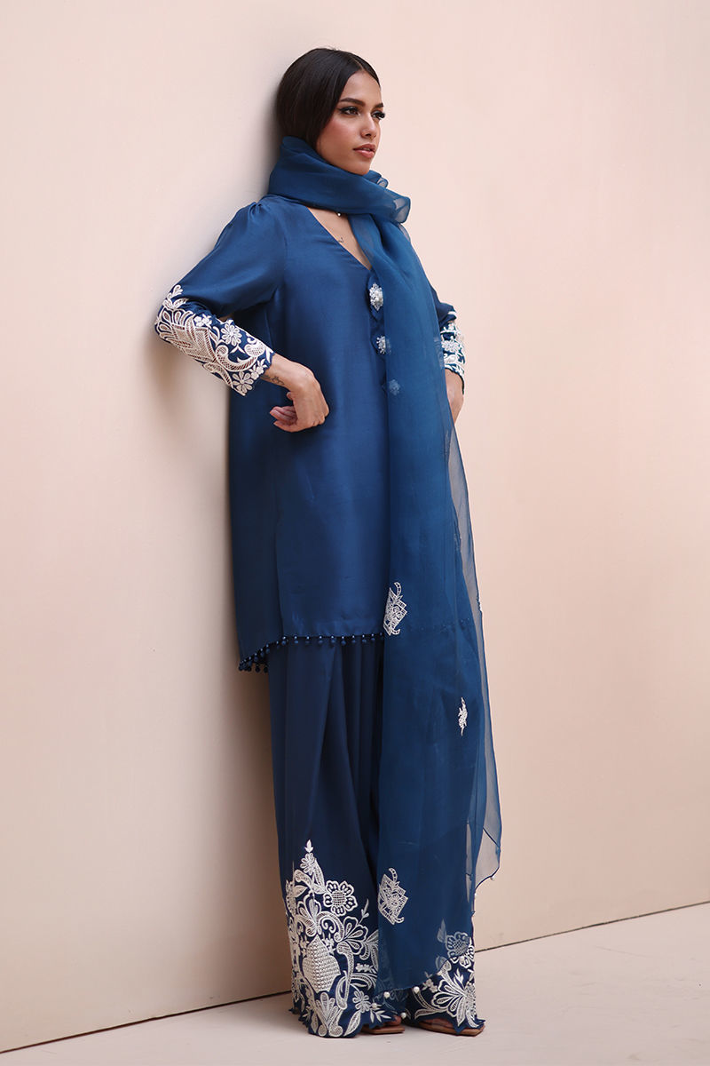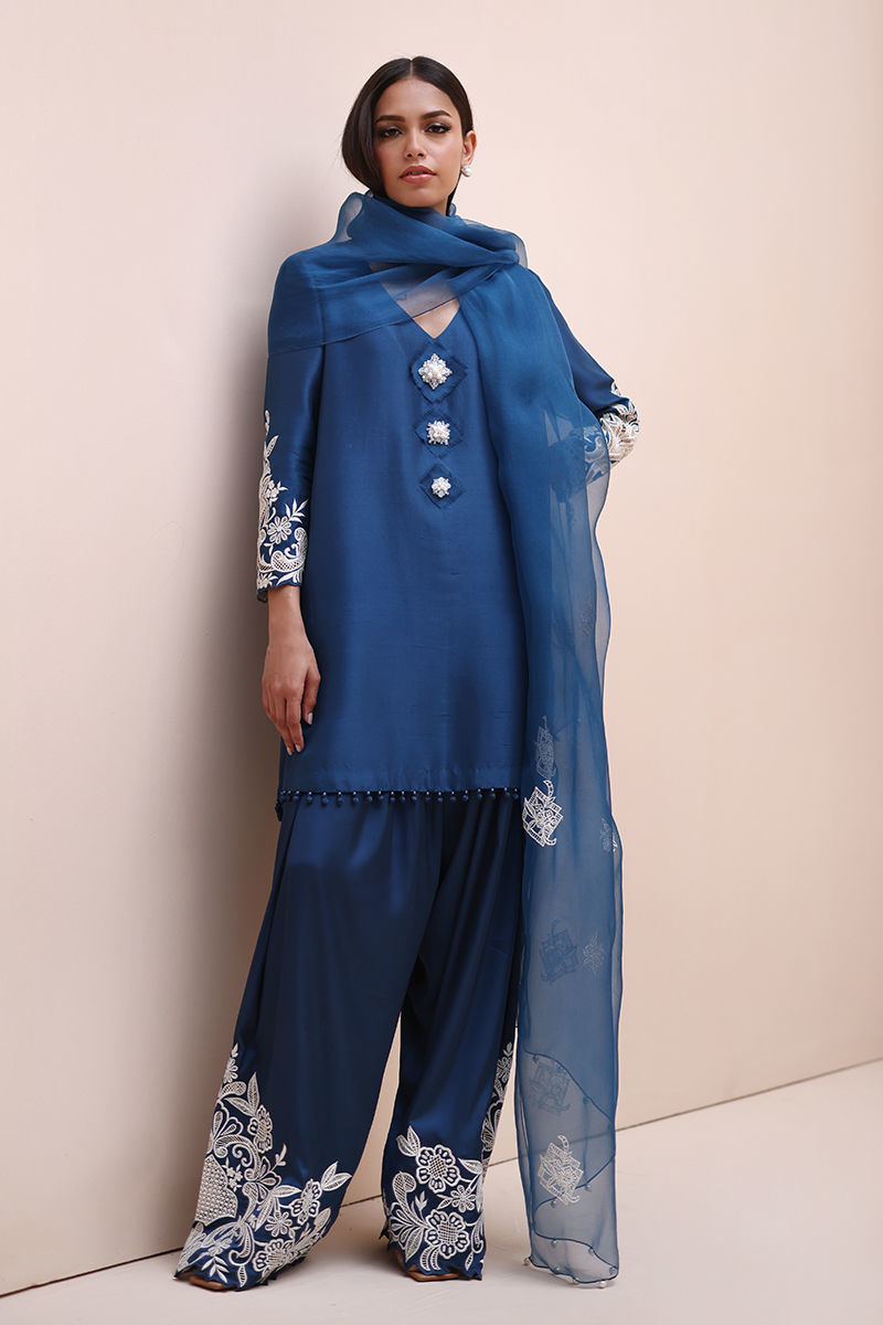Timeless Elegance in Moroccan Blue – Crafted from luxurious Pure Raw Silk for the Shirt, Shine Silk for the Shalwar, and delicate Pure Organza for the Dupatta, this ensemble is a true masterpiece. Adorned with intricate Ivory Resham Tarkashi embroidery on the sleeves, it is further enhanced with handcrafted bunches on the neckline and delicate handmade hangings on the daman. The shalwar features refined Resham Tarkashi embroidery on the bottom, while the dupatta is finished with handcrafted tassels on the pallu, adding a touch of artisanal charm and sophistication.