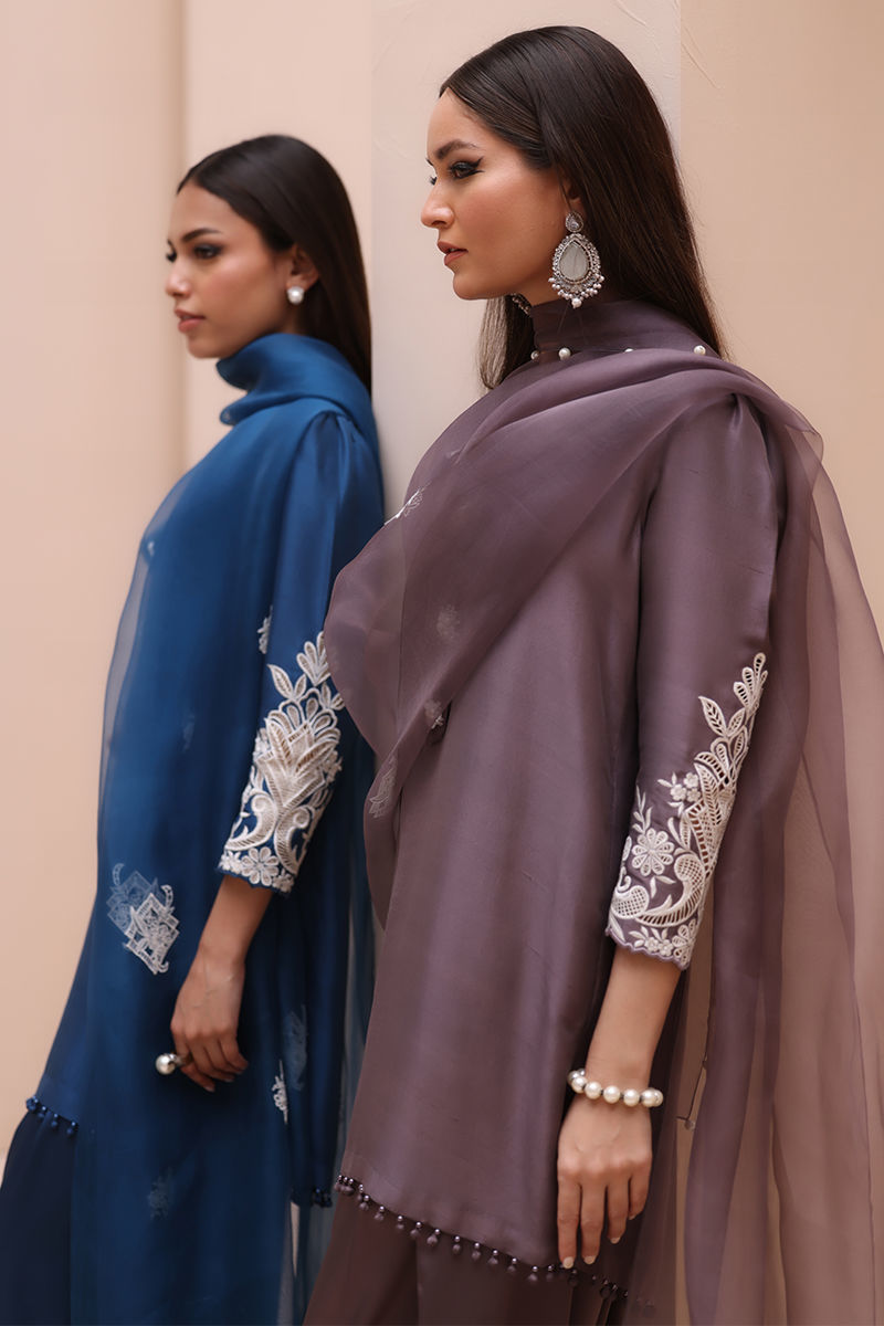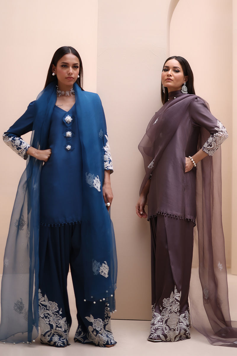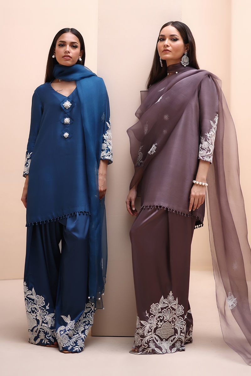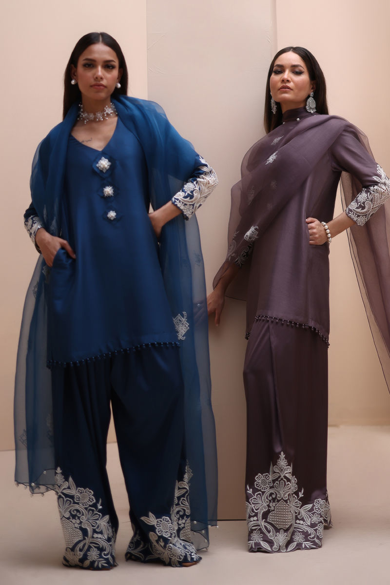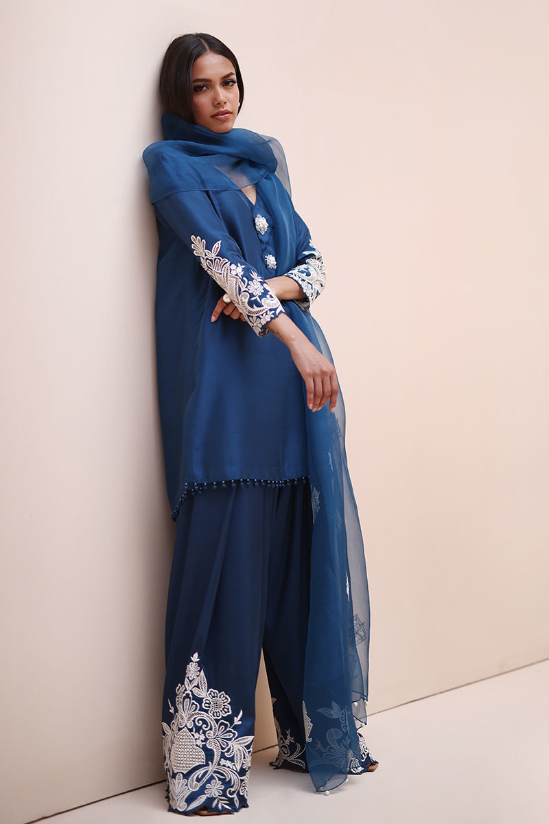 Timeless Elegance in Moroccan Blue – Crafted from luxurious Pure Raw Silk for the Shirt, Shine Silk for the Shalwar, and delicate Pure Organza for the Dupatta, this ensemble is a true masterpiece. Adorned with intricate Ivory Resham Tarkashi embroidery on the sleeves, it is further enhanced with handcrafted bunches on the neckline and delicate handmade hangings on the daman. The shalwar features refined Resham Tarkashi embroidery on the bottom, while the dupatta is finished with handcrafted tassels on the pallu, adding a touch of artisanal charm and sophistication.
