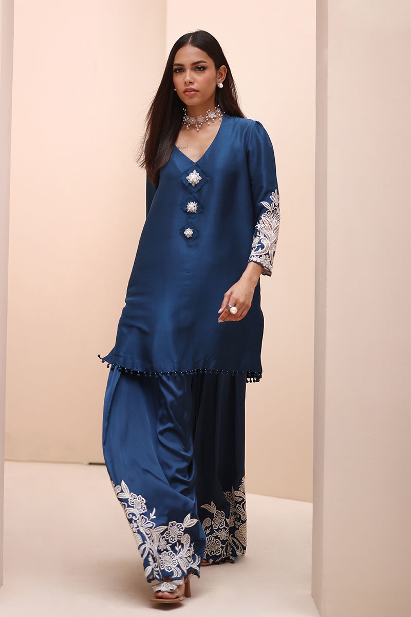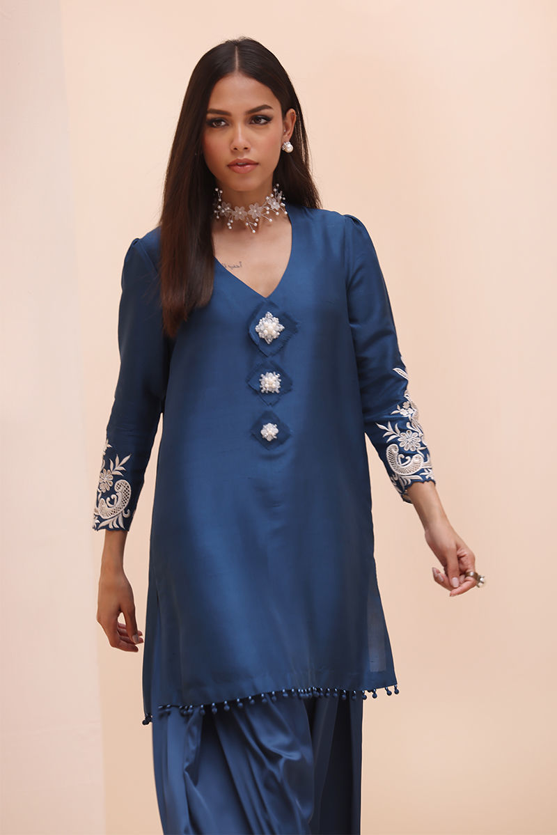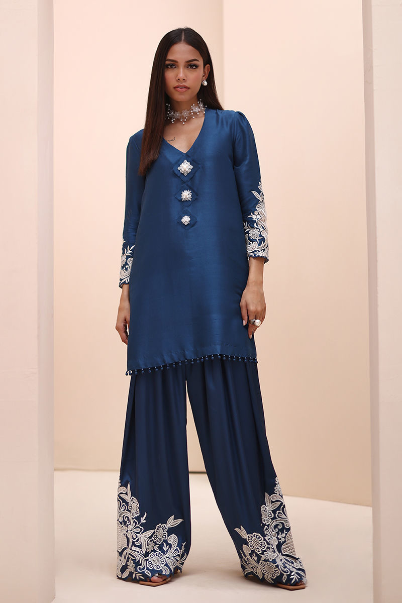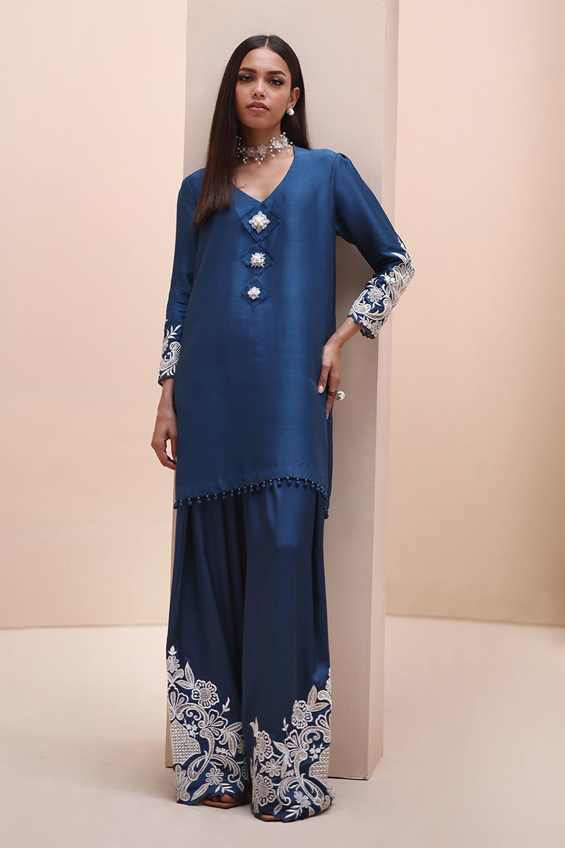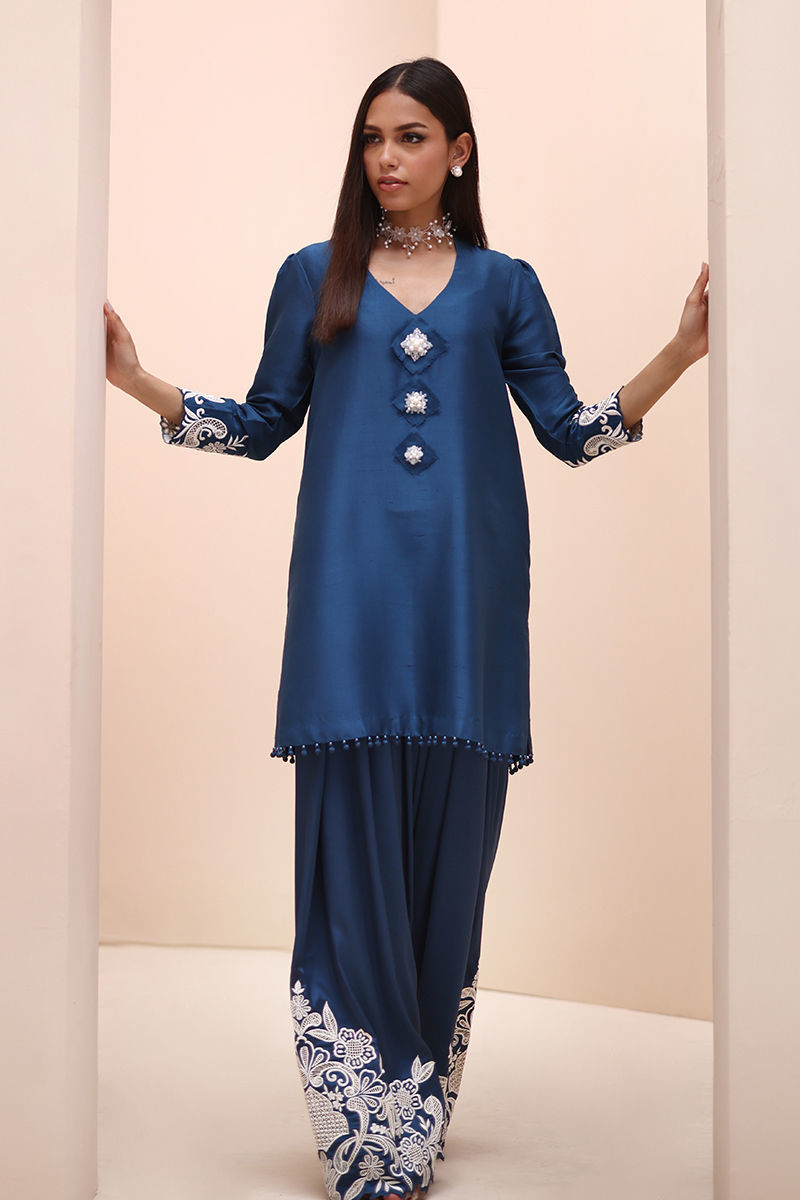 Timeless Elegance in Moroccan Blue – Crafted from luxurious Pure Raw Silk for the Shirt, Shine Silk for the Shalwar, and delicate Pure Organza for the Dupatta, this ensemble is a true masterpiece. Adorned with intricate Ivory Resham Tarkashi embroidery on the sleeves, it is further enhanced with handcrafted bunches on the neckline and delicate handmade hangings on the daman. The shalwar features refined Resham Tarkashi embroidery on the bottom, while the dupatta is finished with handcrafted tassels on the pallu, adding a touch of artisanal charm and sophistication.