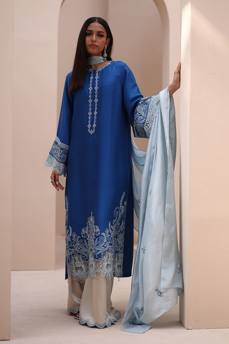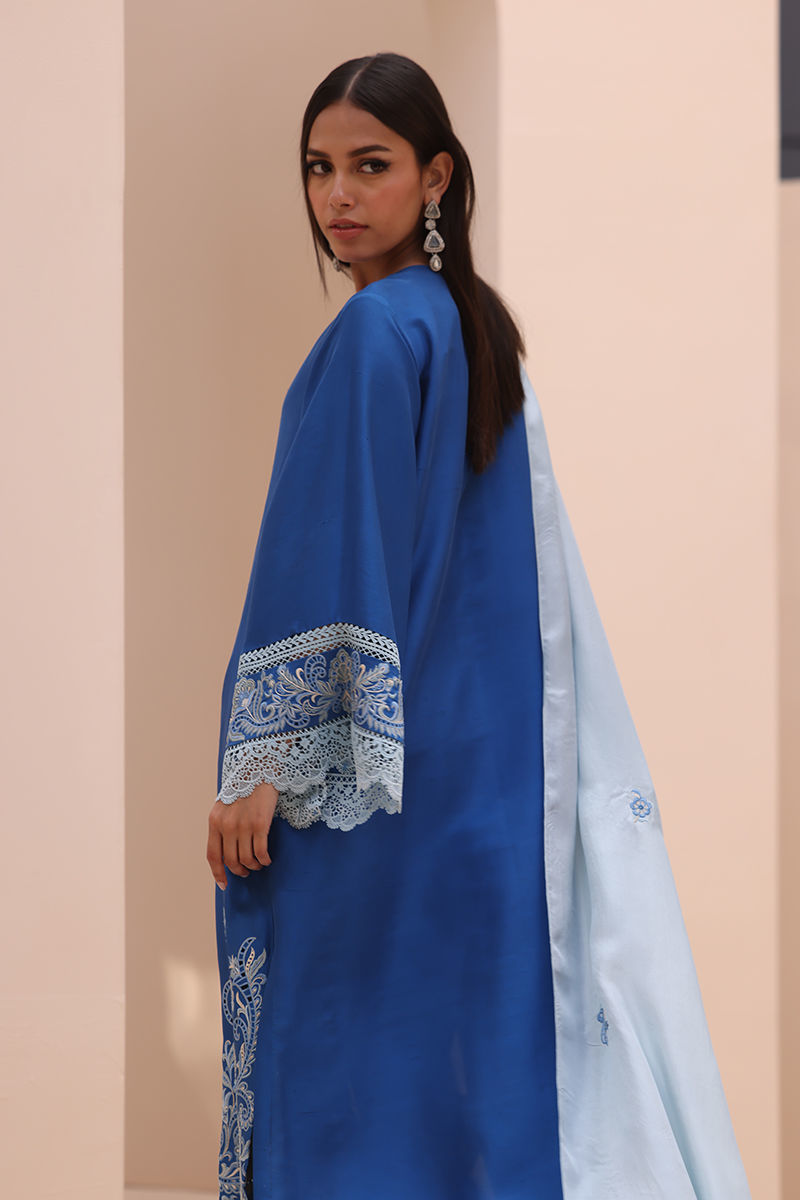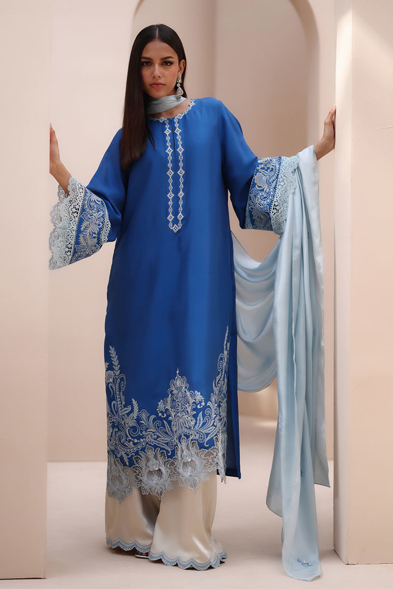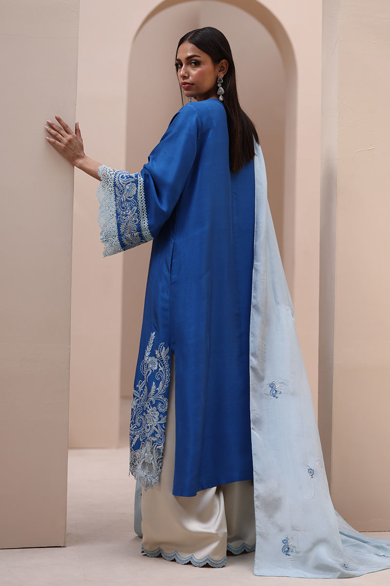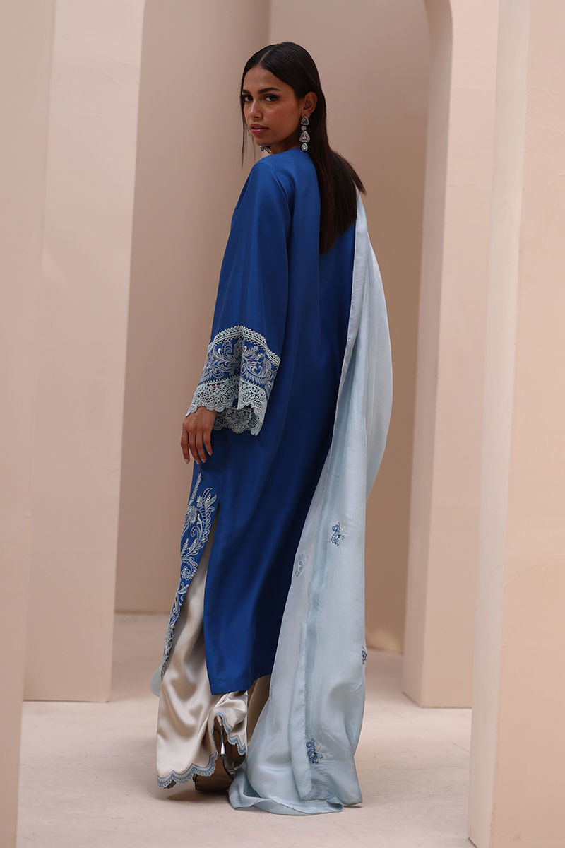 Ethereal Elegance in Turkish Blue – This luxurious ensemble features a Pure Raw Silk Shirt, Shine Crepe Silk Culottes, and a delicate Pure Medium Silk Dupatta. The shirt is adorned with intricate Resham embroidery, enhanced with exquisite cutwork on the neckline, sleeves, and daman. The culottes showcase beautifully embroidered Resham scallops on the bottom, while the dupatta is gracefully detailed with Resham embroidery boti on the pallu, making this ensemble a perfect blend of sophistication and craftsmanship.