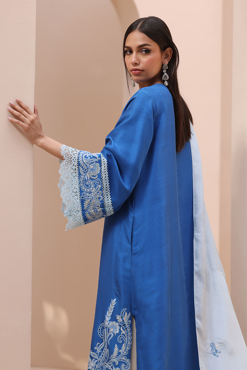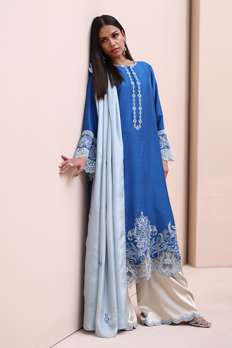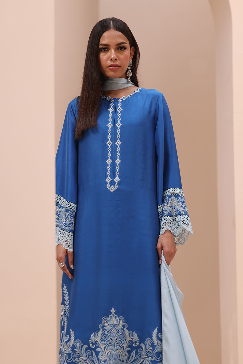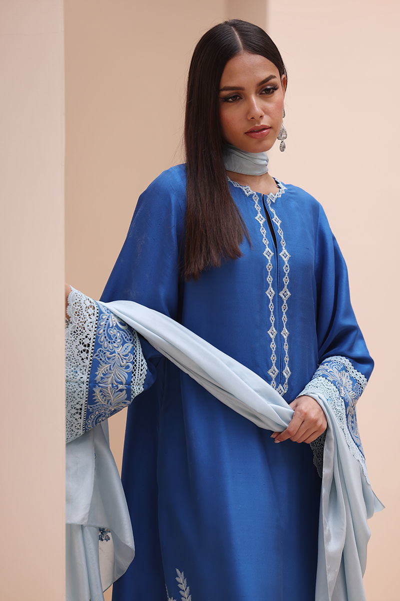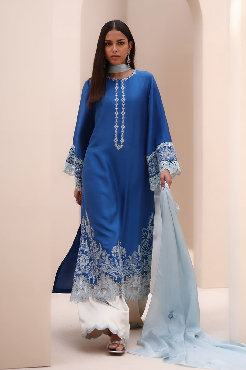 Ethereal Elegance in Turkish Blue – This luxurious ensemble features a Pure Raw Silk Shirt, Shine Crepe Silk Culottes, and a delicate Pure Medium Silk Dupatta. The shirt is adorned with intricate Resham embroidery, enhanced with exquisite cutwork on the neckline, sleeves, and daman. The culottes showcase beautifully embroidered Resham scallops on the bottom, while the dupatta is gracefully detailed with Resham embroidery boti on the pallu, making this ensemble a perfect blend of sophistication and craftsmanship.