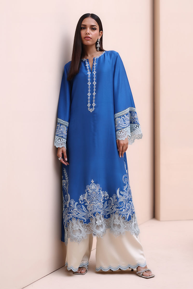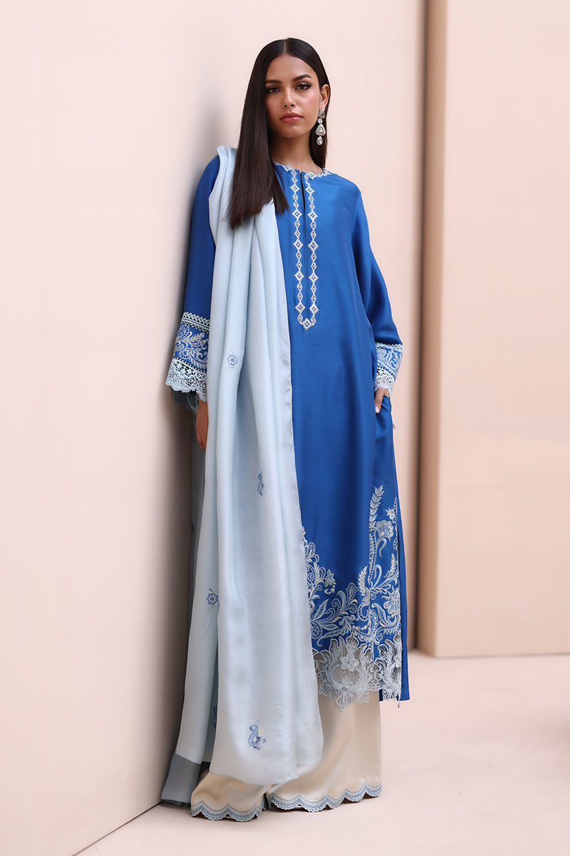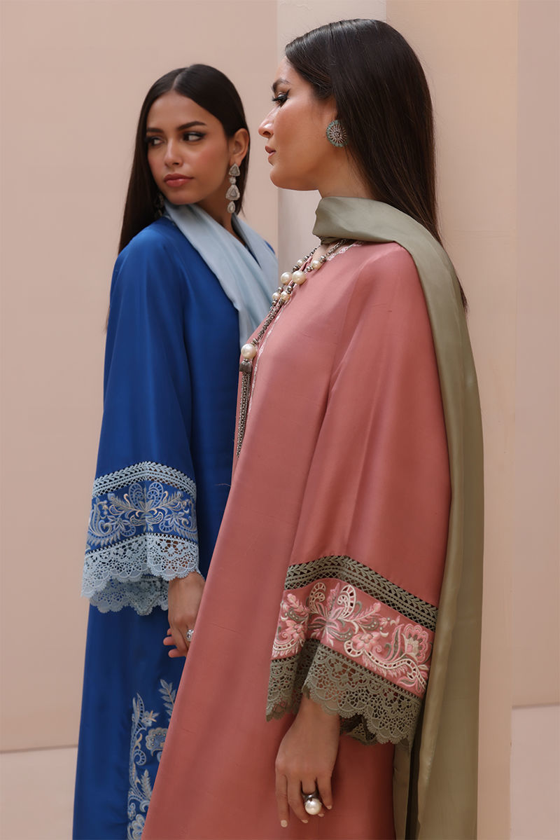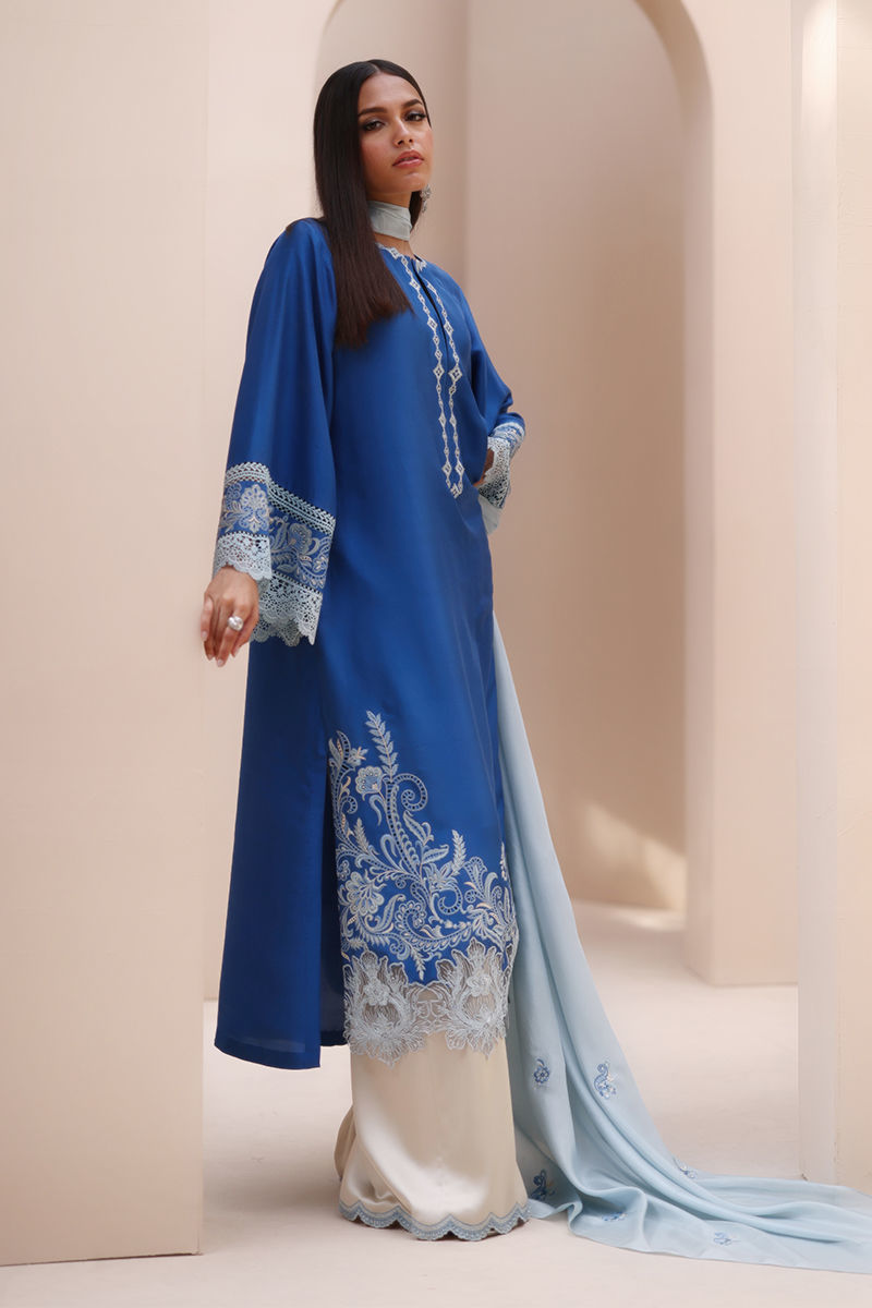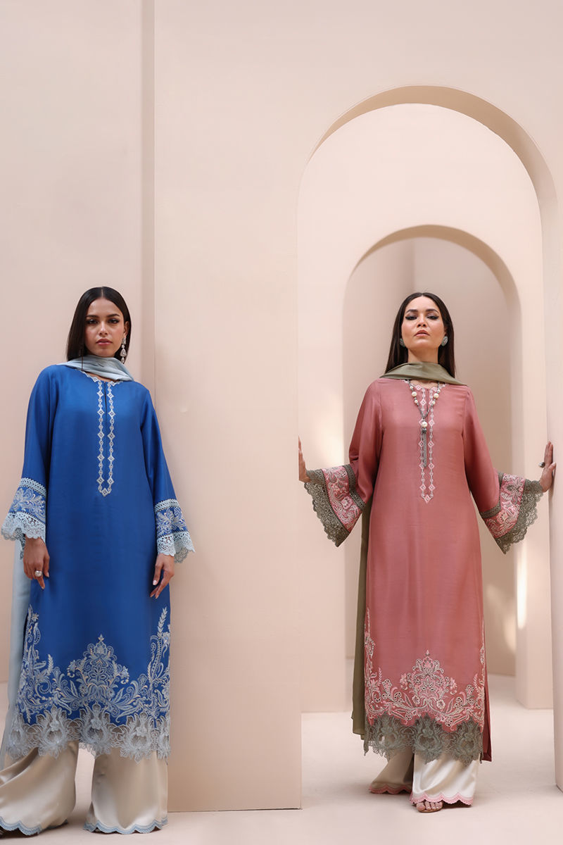 Ethereal Elegance in Turkish Blue – This luxurious ensemble features a Pure Raw Silk Shirt, Shine Crepe Silk Culottes, and a delicate Pure Medium Silk Dupatta. The shirt is adorned with intricate Resham embroidery, enhanced with exquisite cutwork on the neckline, sleeves, and daman. The culottes showcase beautifully embroidered Resham scallops on the bottom, while the dupatta is gracefully detailed with Resham embroidery boti on the pallu, making this ensemble a perfect blend of sophistication and craftsmanship.