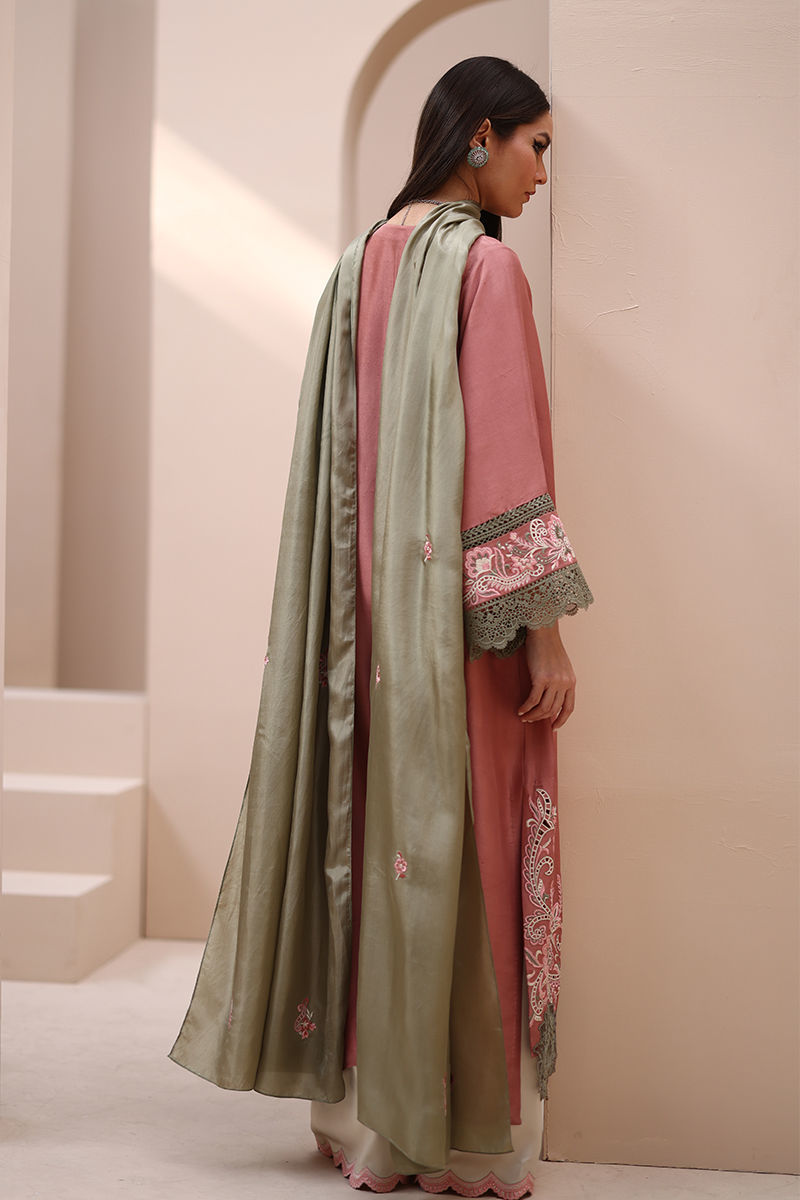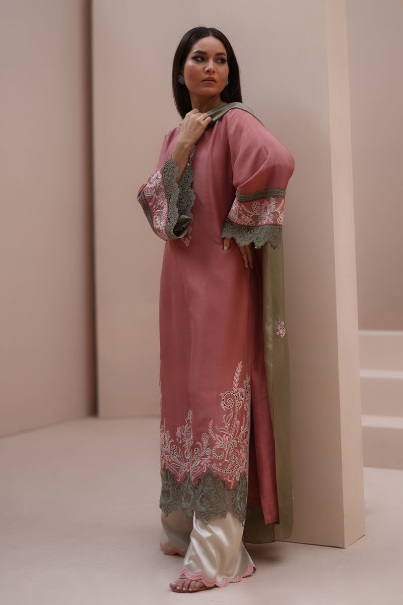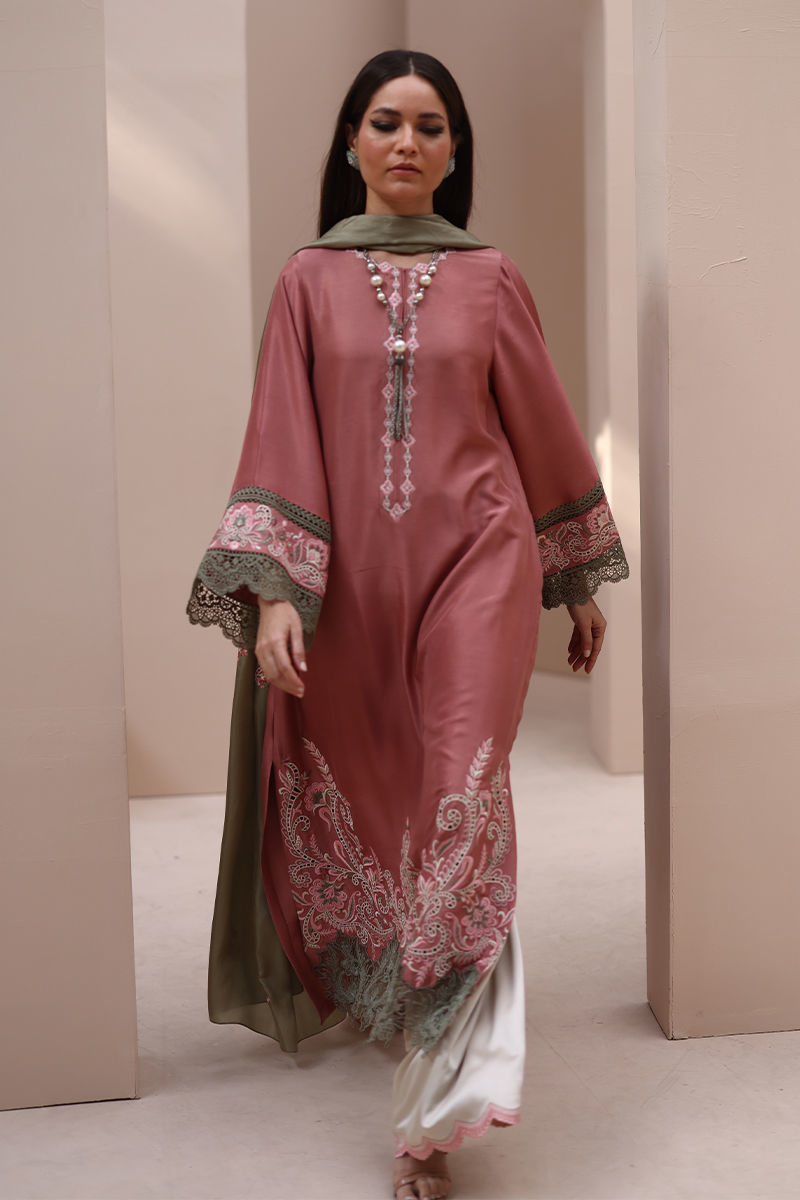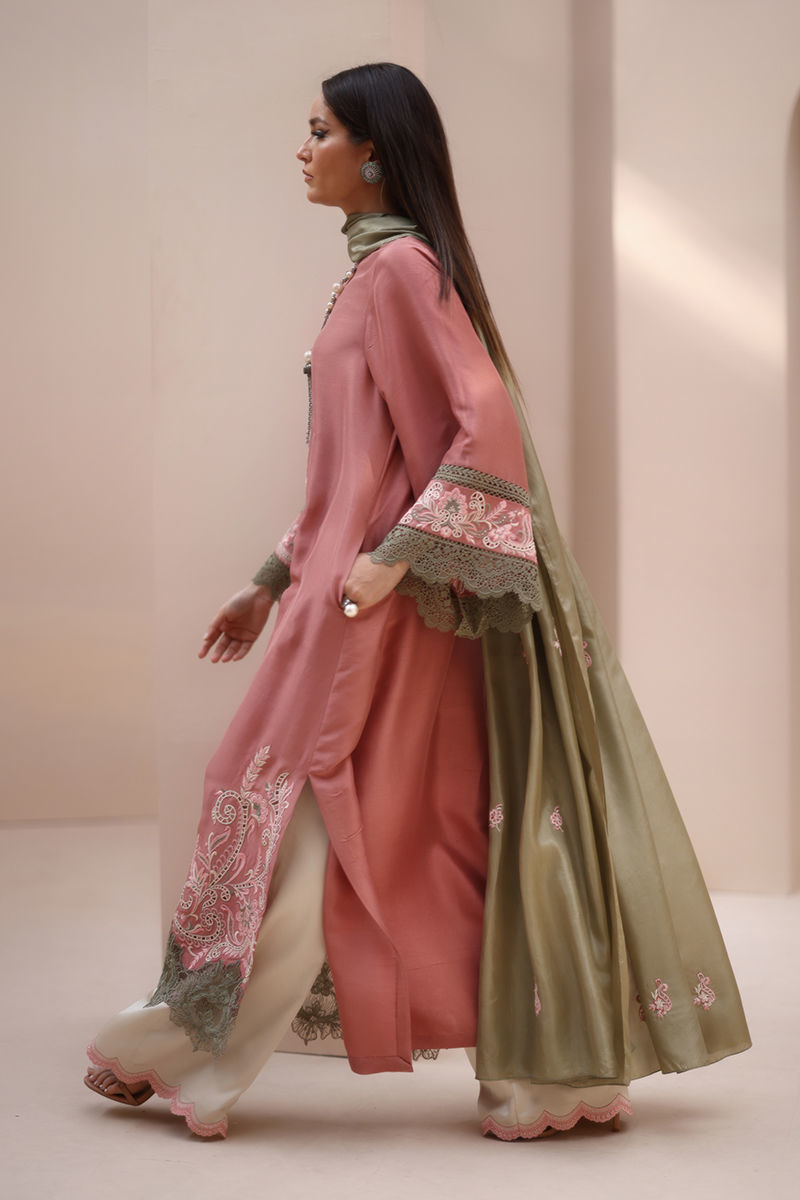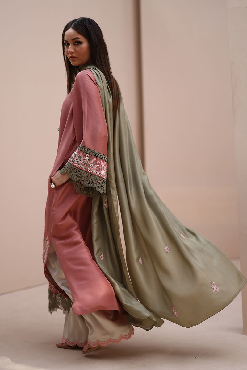 Refined Grace in Light Mahogany – Crafted from Pure Raw Silk for the Shirt, Shine Crepe Silk for the Culottes, and Pure Medium Silk for the Dupatta, this exquisite ensemble exudes timeless sophistication. Featuring delicate Resham embroidery with intricate cutwork on the neckline, sleeves, and daman, it is further enhanced with elegant Resham embroidery scallops on the culottes. The dupatta is adorned with Resham embroidery boti on the pallu, adding a touch of effortless charm and artisanal craftsmanship.