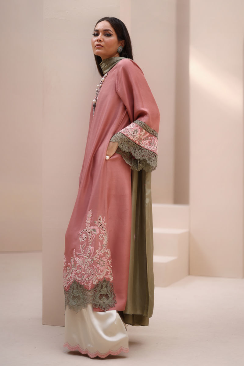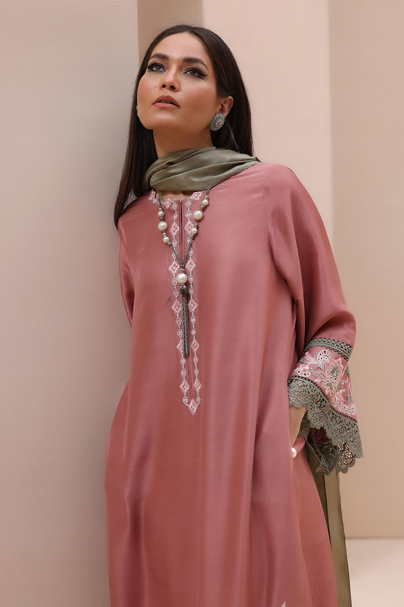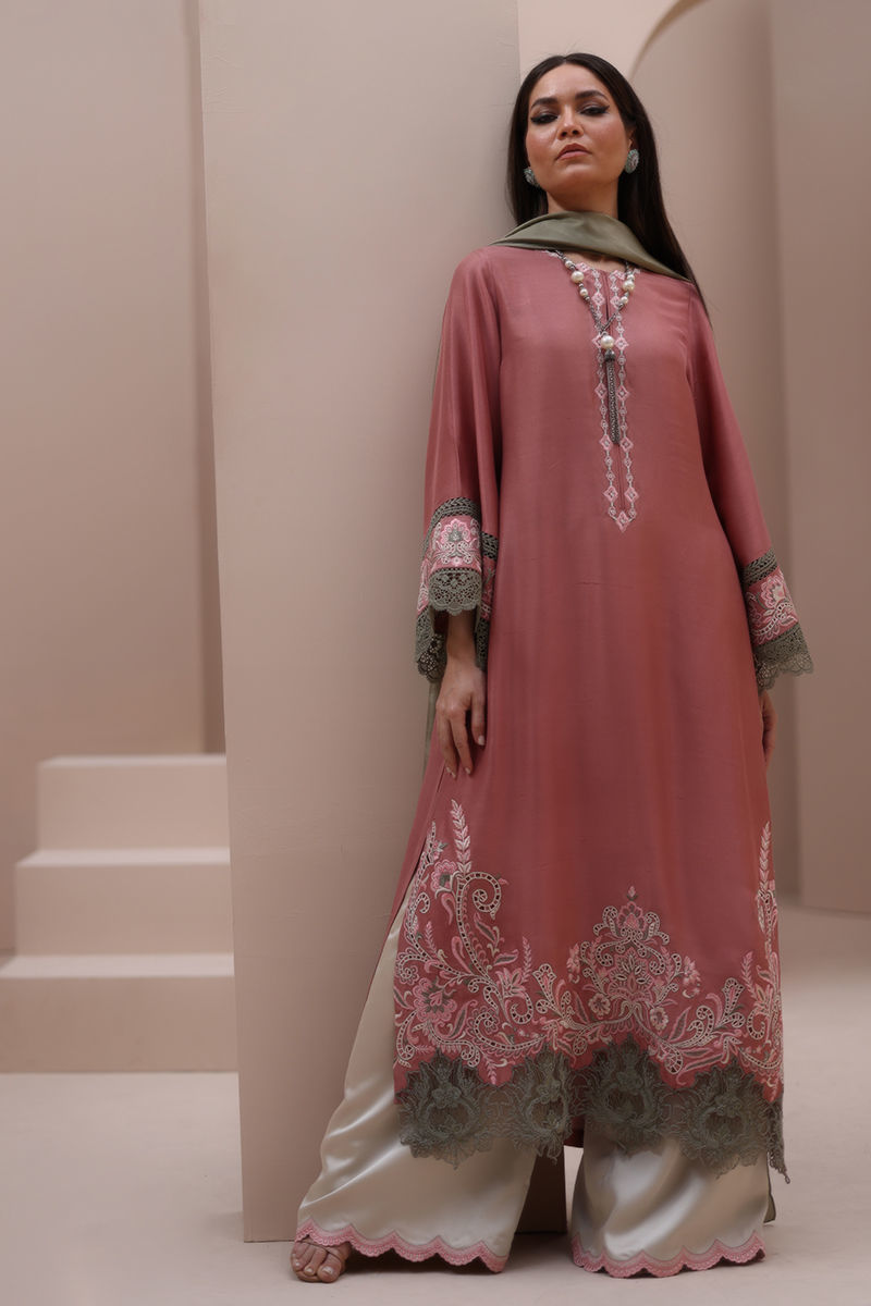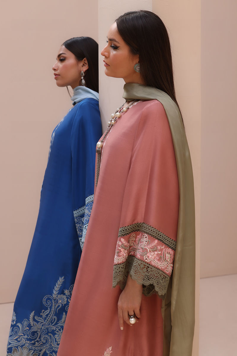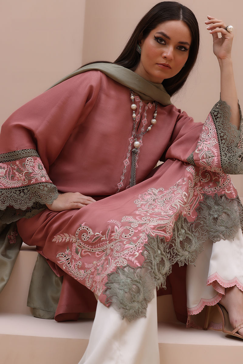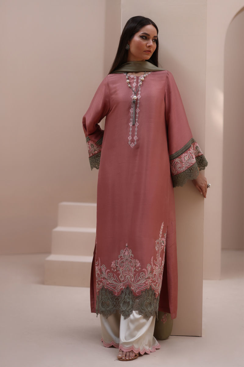 Refined Grace in Light Mahogany – Crafted from Pure Raw Silk for the Shirt, Shine Crepe Silk for the Culottes, and Pure Medium Silk for the Dupatta, this exquisite ensemble exudes timeless sophistication. Featuring delicate Resham embroidery with intricate cutwork on the neckline, sleeves, and daman, it is further enhanced with elegant Resham embroidery scallops on the culottes. The dupatta is adorned with Resham embroidery boti on the pallu, adding a touch of effortless charm and artisanal craftsmanship.