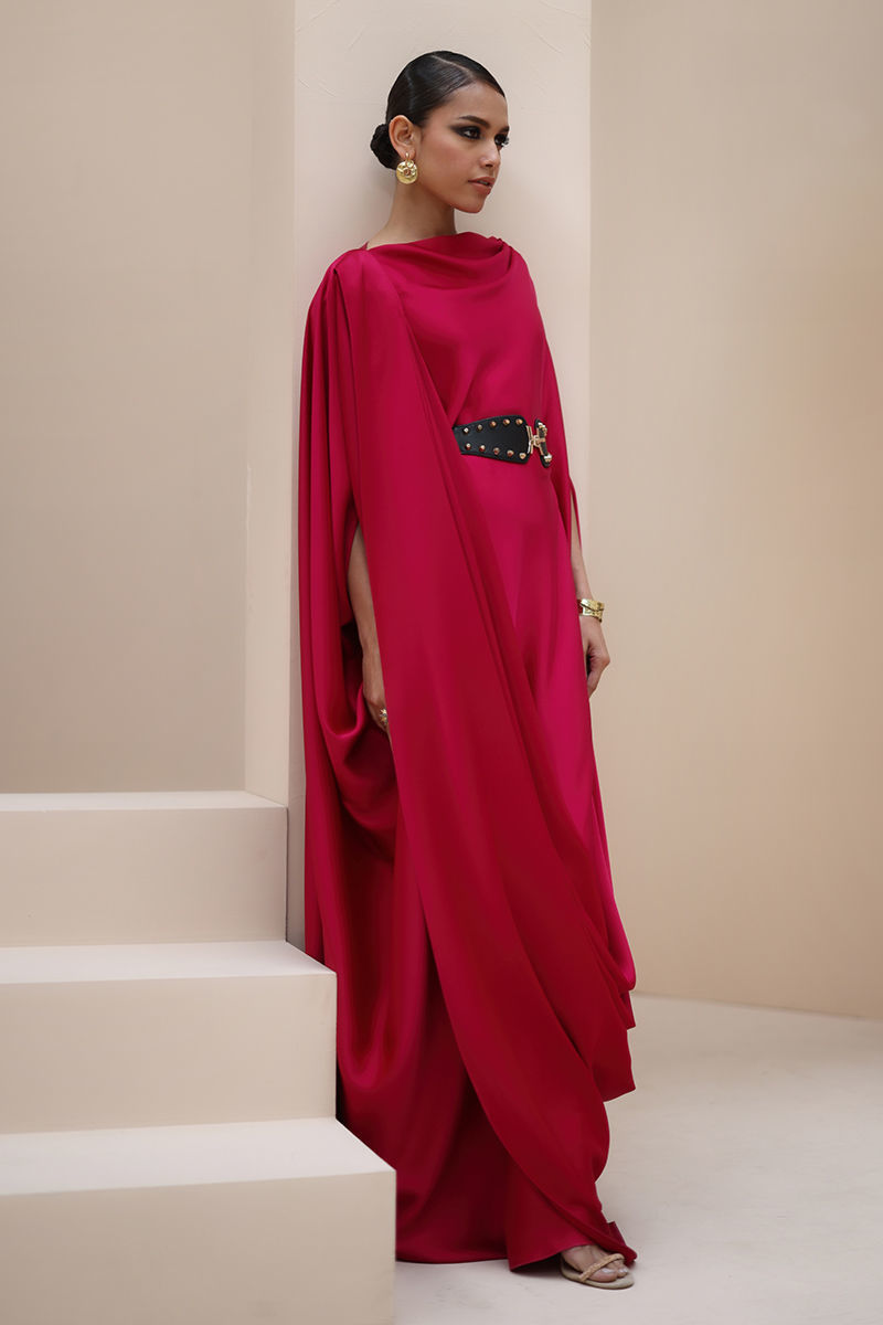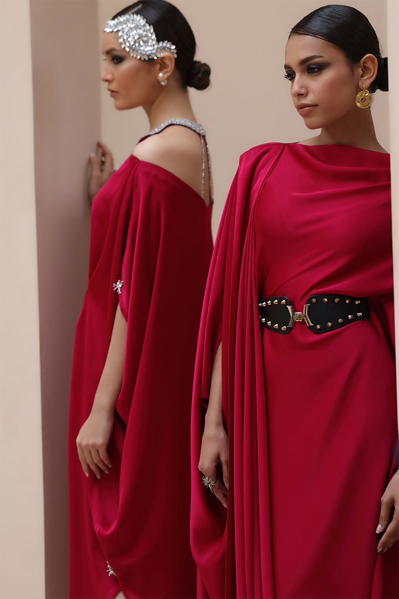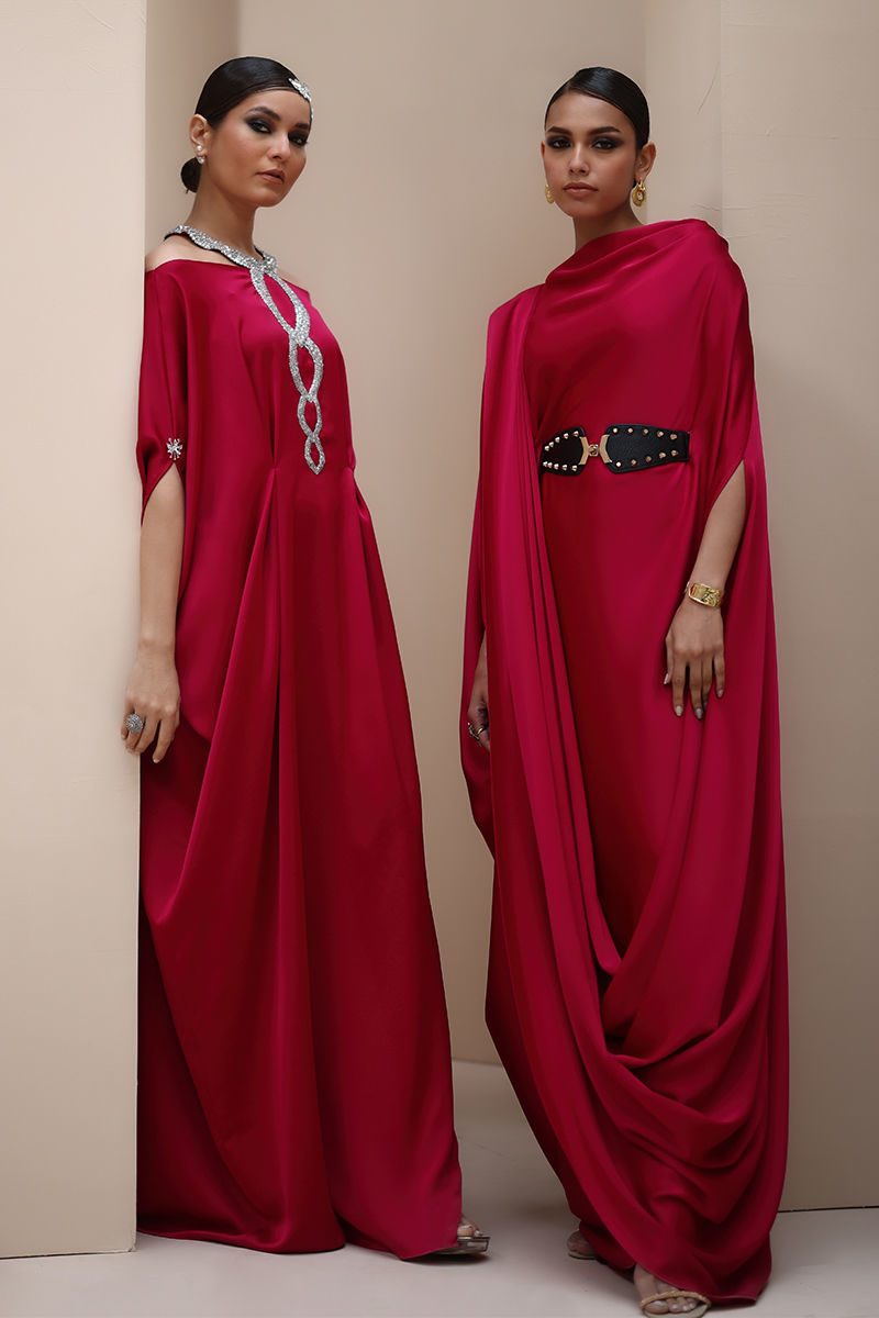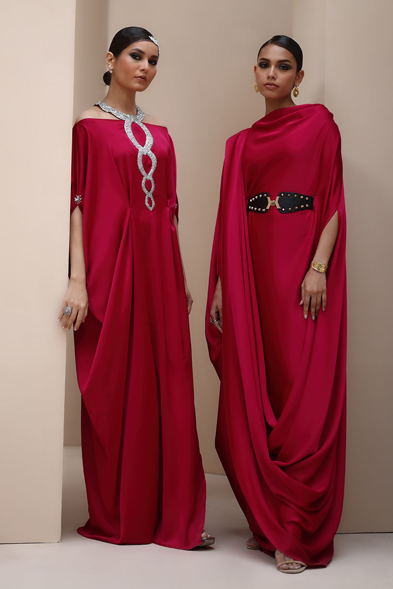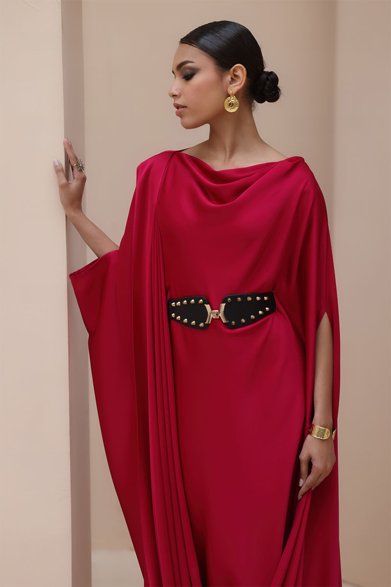 Bold Sophistication in Persian Red – This stunning kaftan, crafted from luxurious Textured Silk, is designed to make a statement. It is elegantly cinched at the waist with a chic belt, creating a graceful silhouette that blends effortless glamour with timeless charm.