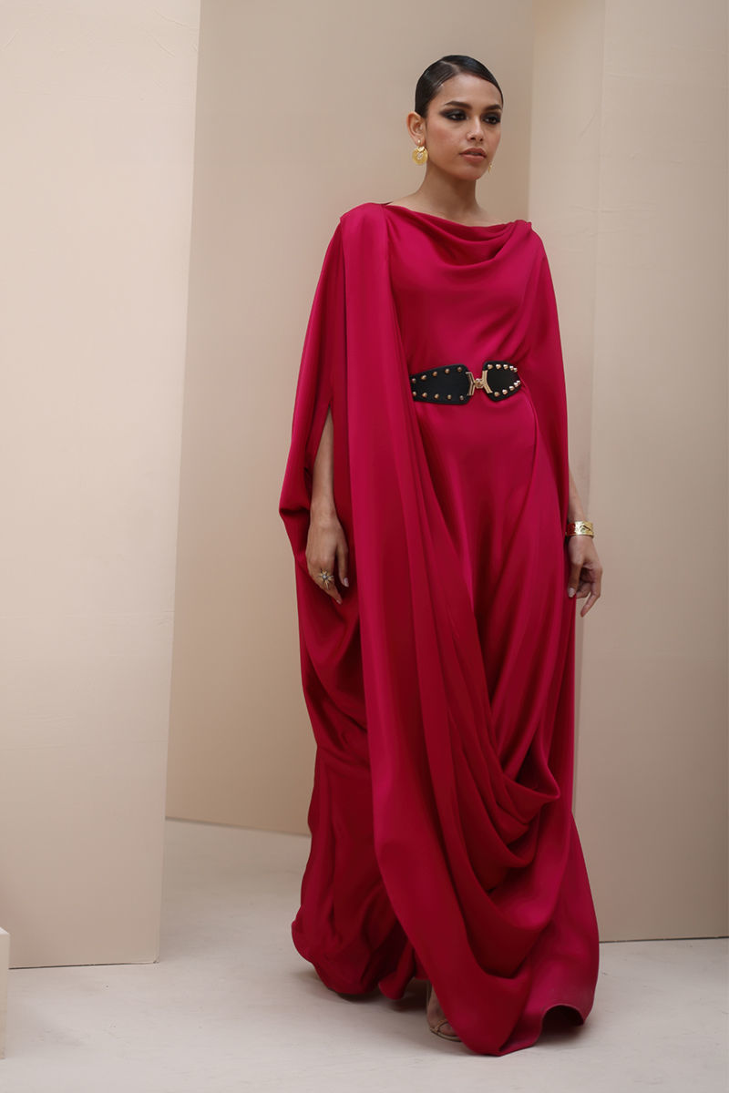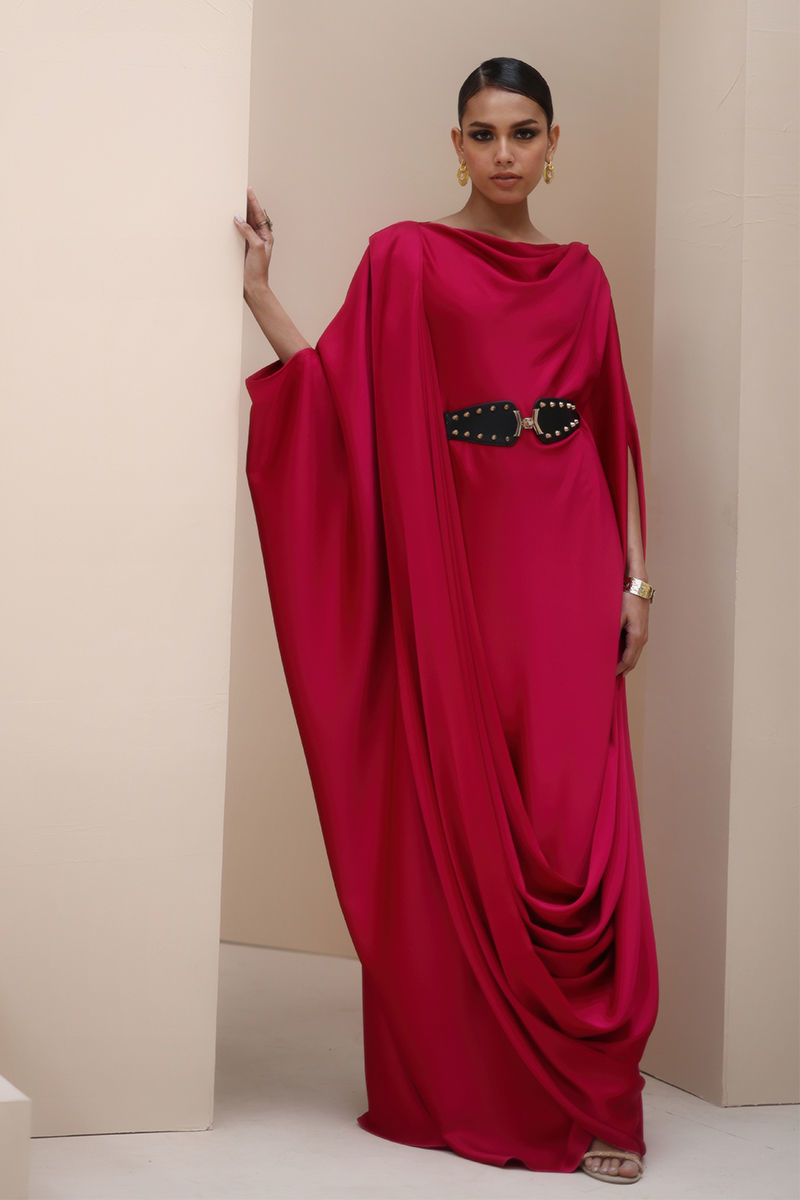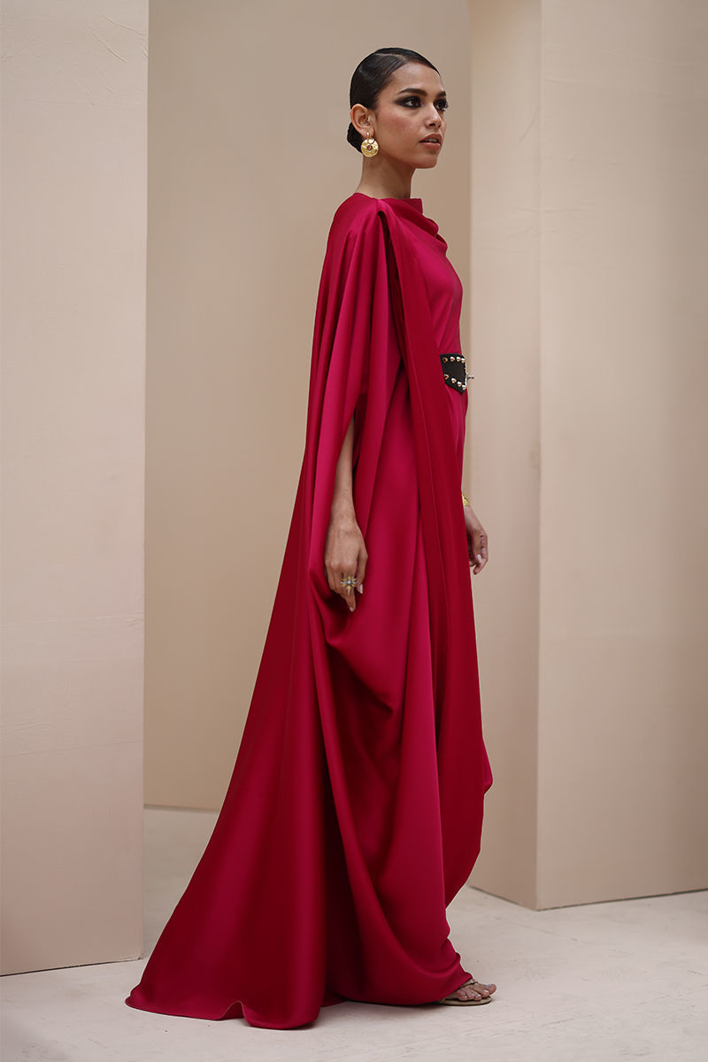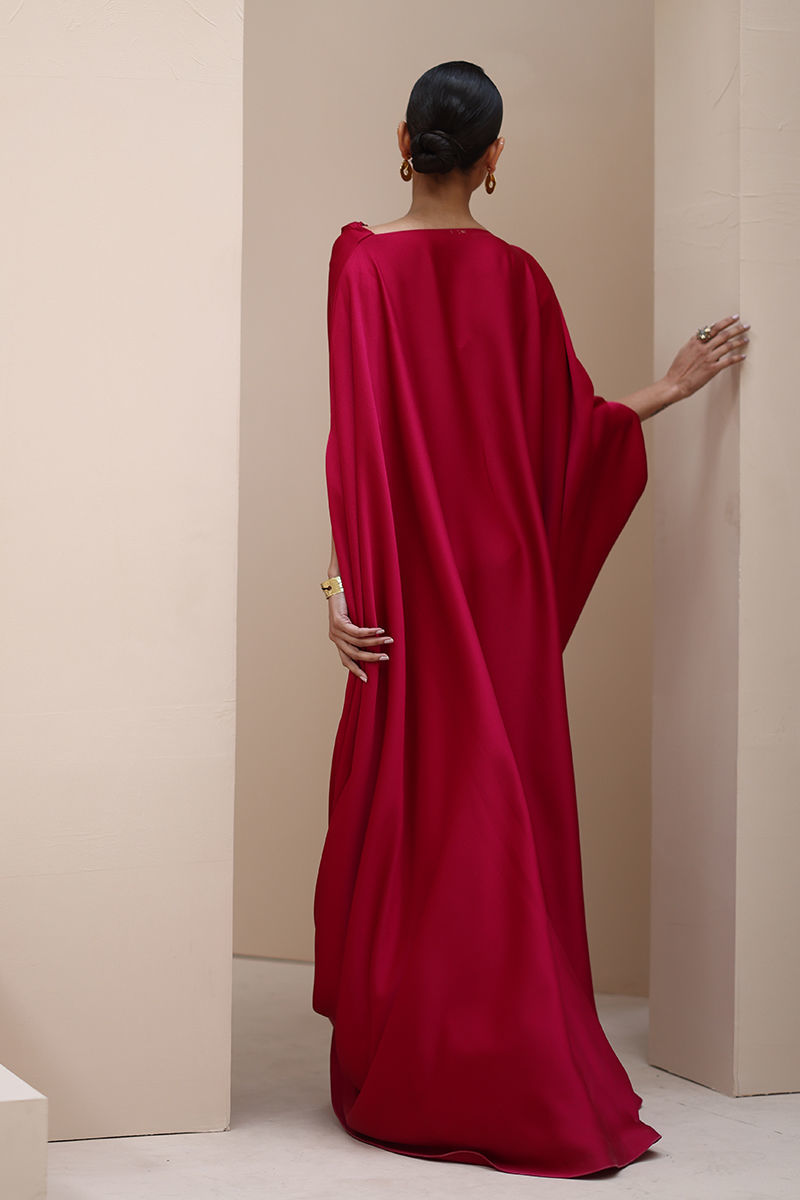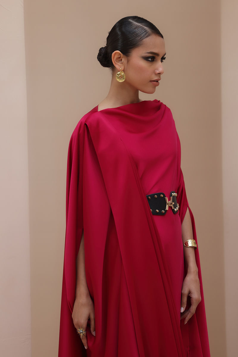 Bold Sophistication in Persian Red – This stunning kaftan, crafted from luxurious Textured Silk, is designed to make a statement. It is elegantly cinched at the waist with a chic belt, creating a graceful silhouette that blends effortless glamour with timeless charm.