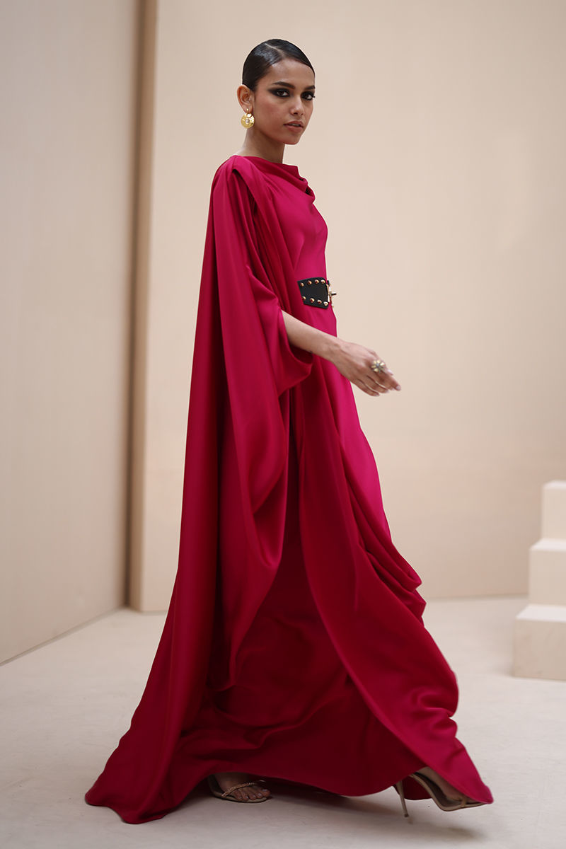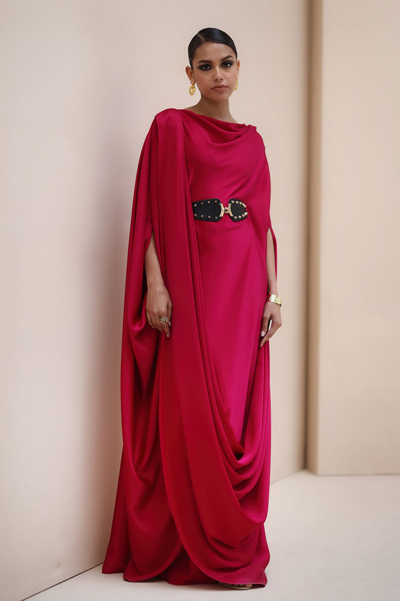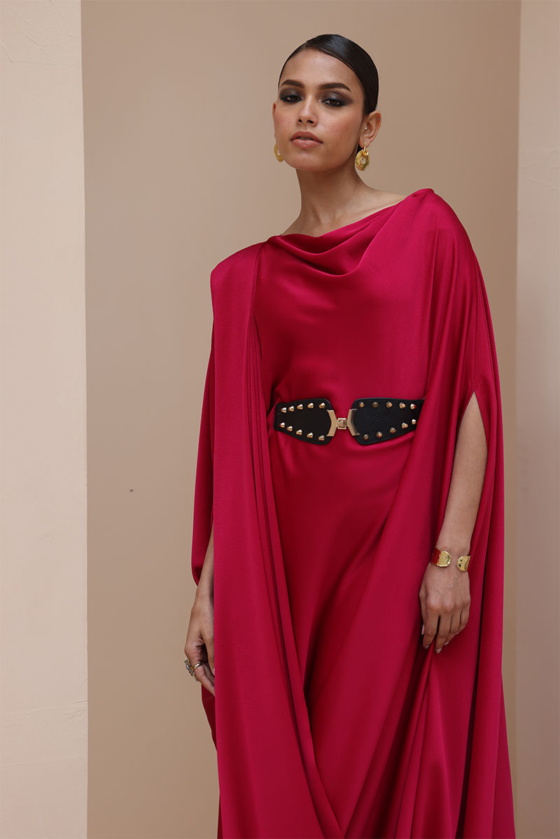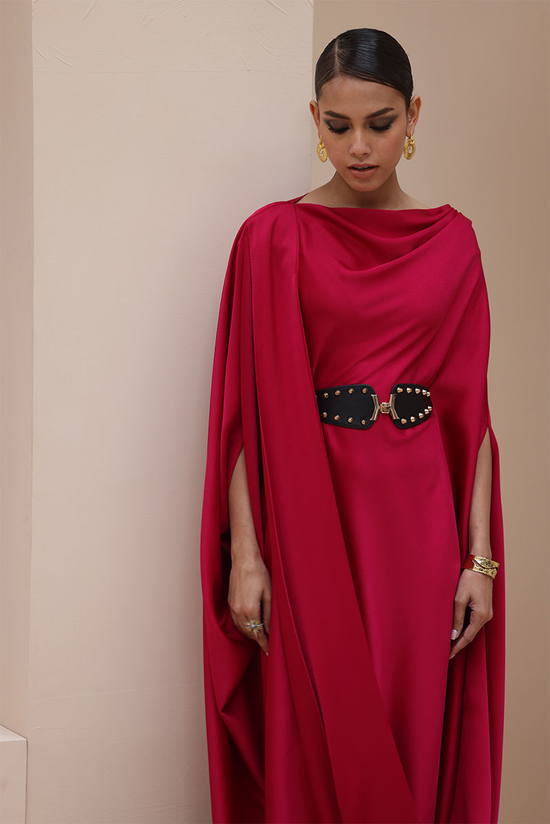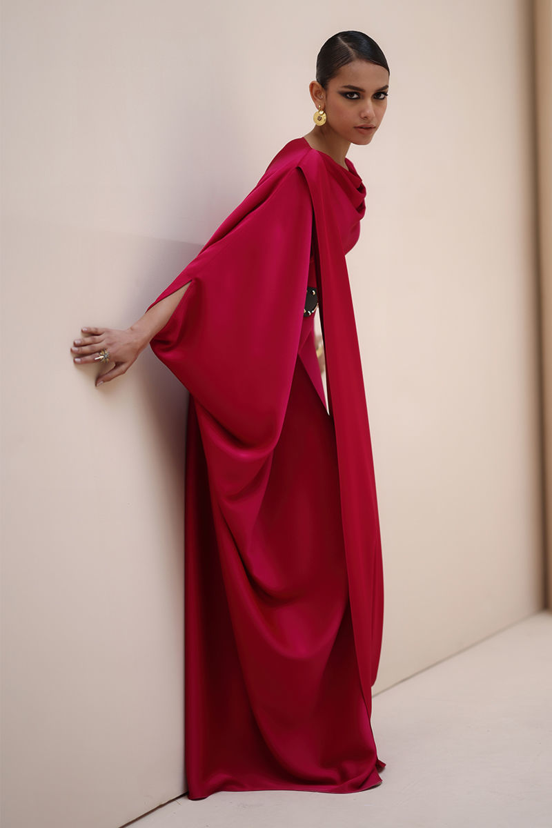 Bold Sophistication in Persian Red – This stunning kaftan, crafted from luxurious Textured Silk, is designed to make a statement. It is elegantly cinched at the waist with a chic belt, creating a graceful silhouette that blends effortless glamour with timeless charm.