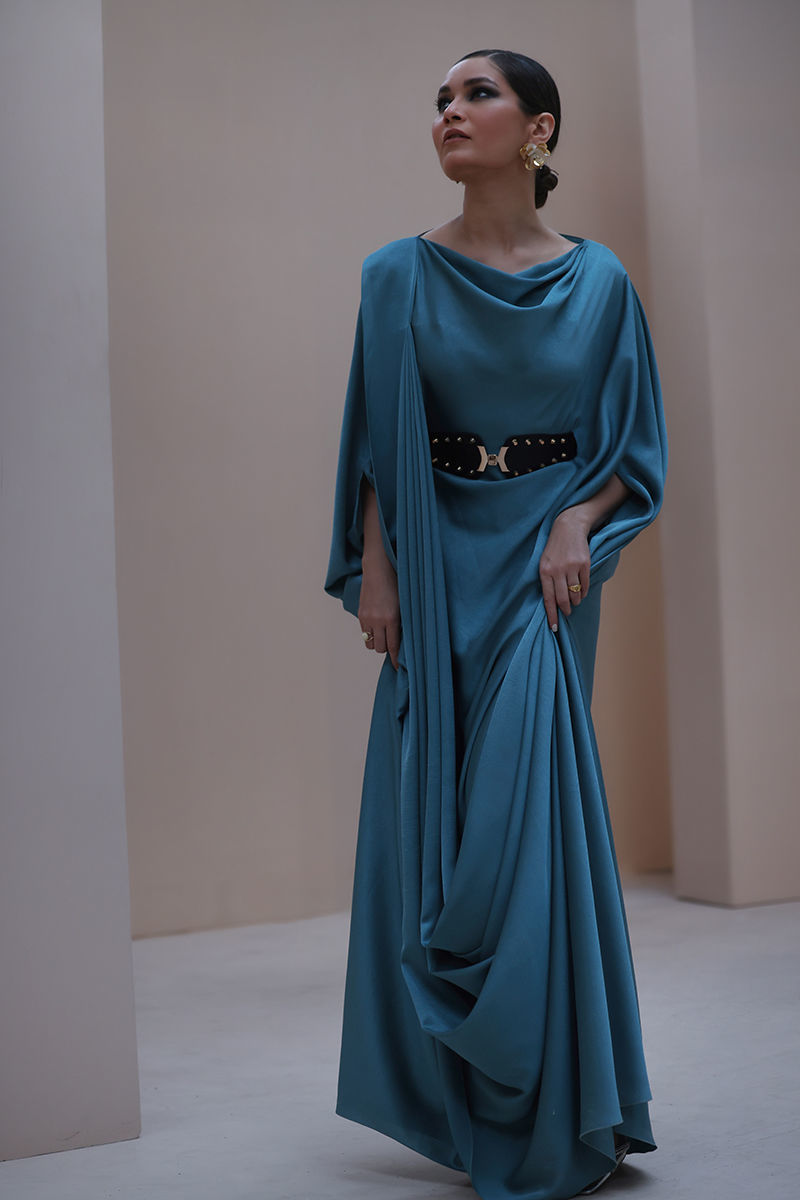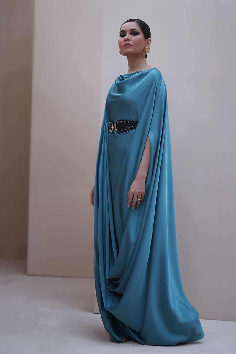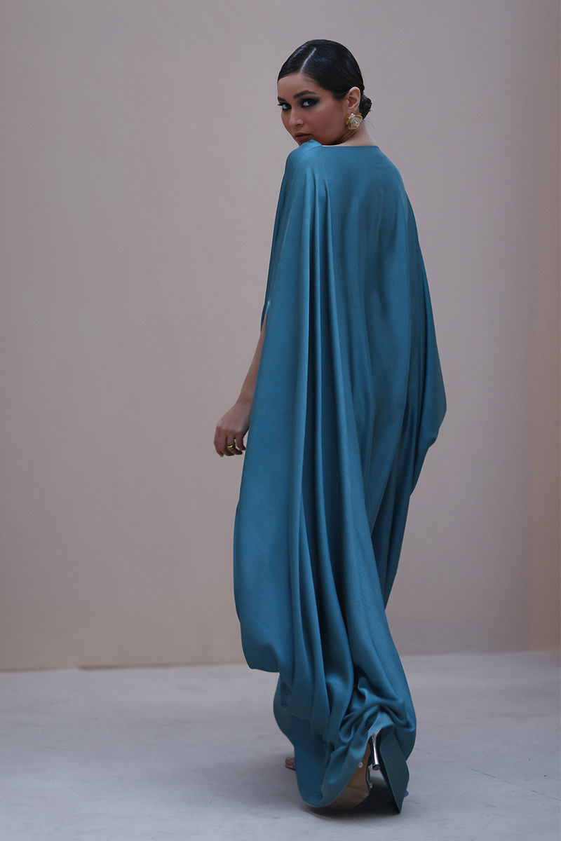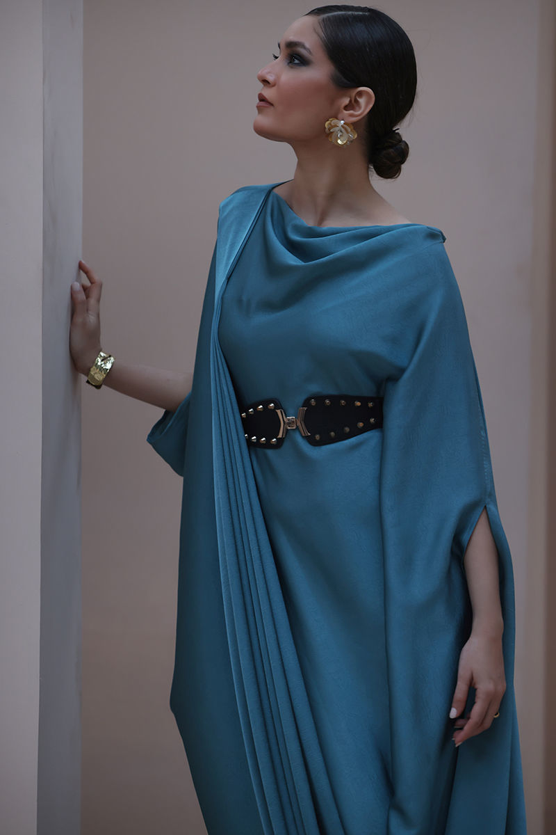 Graceful Allure in Wasabi Green – Crafted from luxurious Marble Silk, this elegantly kaftan exudes effortless sophistication. Designed with a flattering belt at the waistline, it beautifully enhances the silhouette, making it a perfect blend of modern style and timeless elegance.