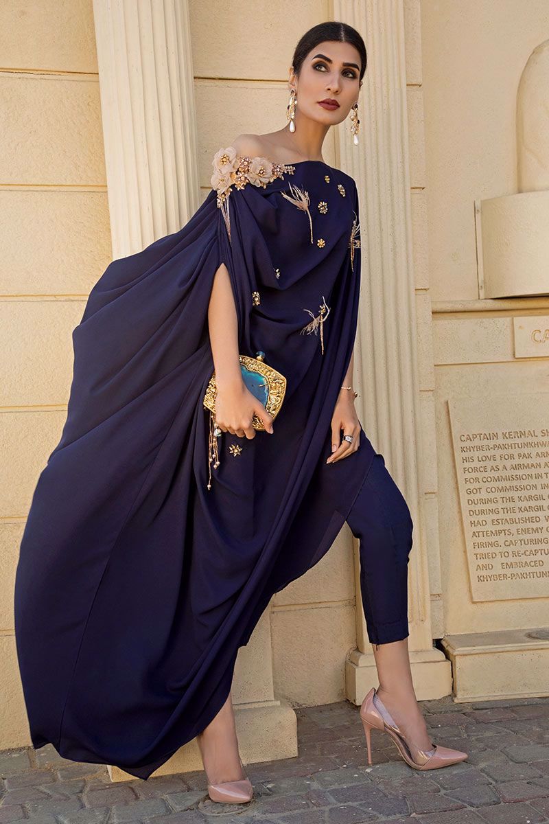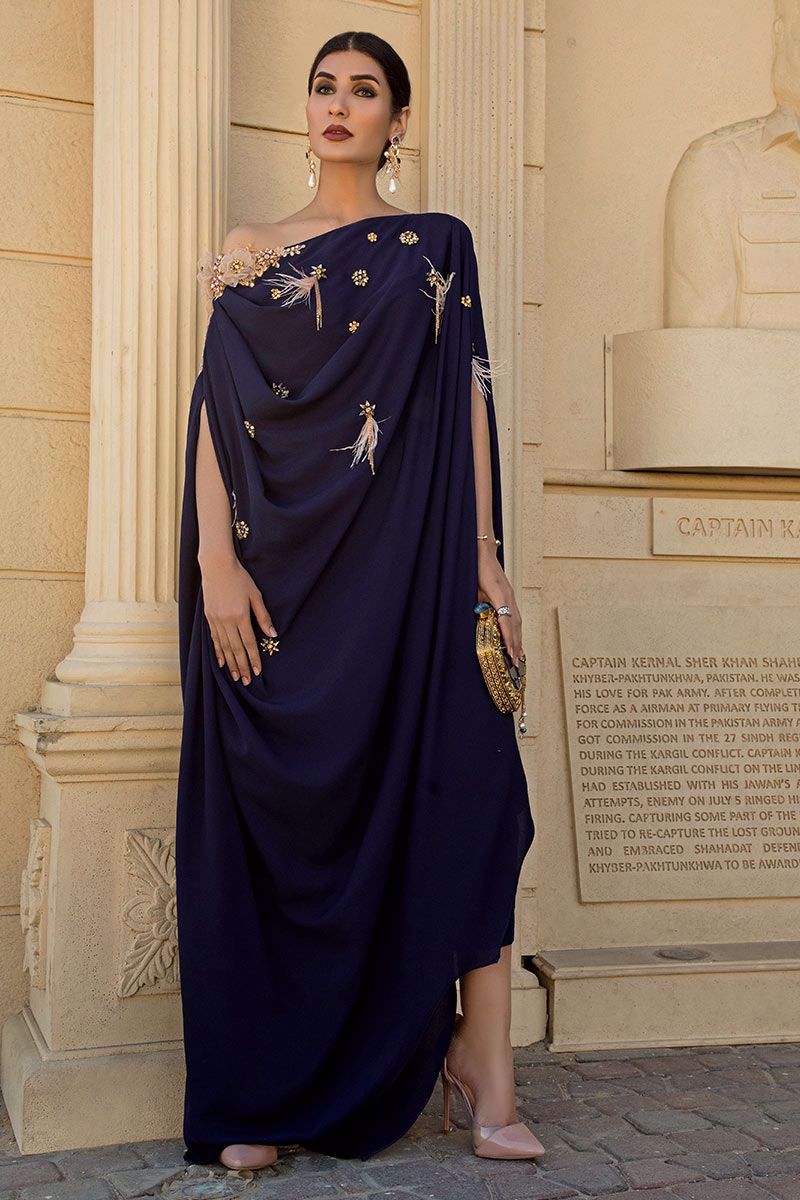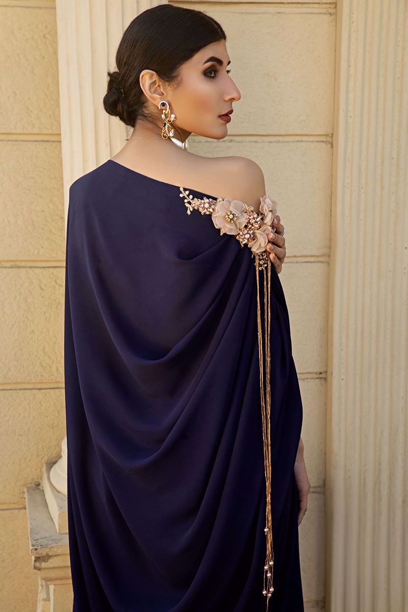 Navy blue ensemble timeless off-shoulder Kaftan in double georgette embellished with jeweled that includes 3D jeweled flowers, stones, feather finishing's, metallic chains, cut dana and pearl hangings. Same color Pants can be bought to complete the look.