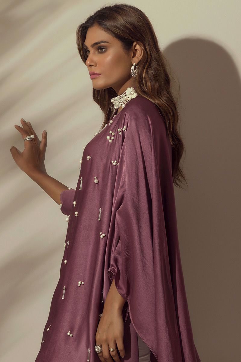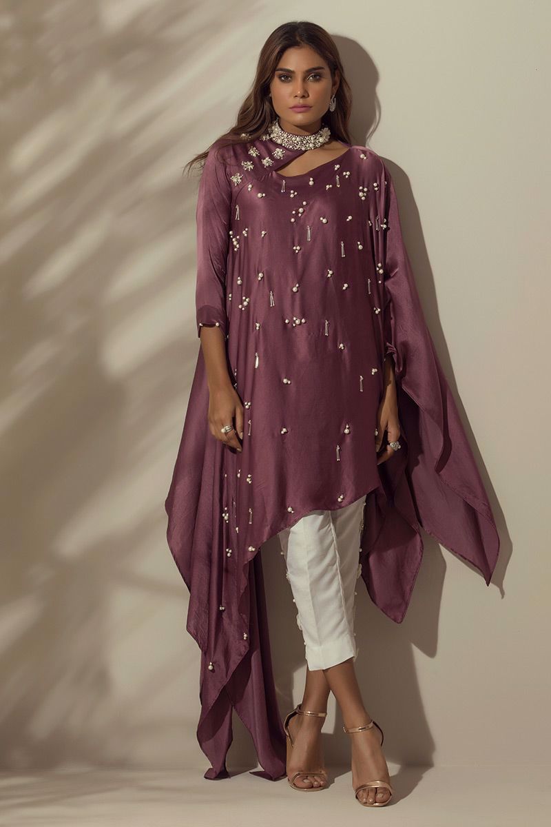 Purple pure charmeuse Top in a trendy cut hand worked with pearls, cut dana, sticks, stones and flowers.