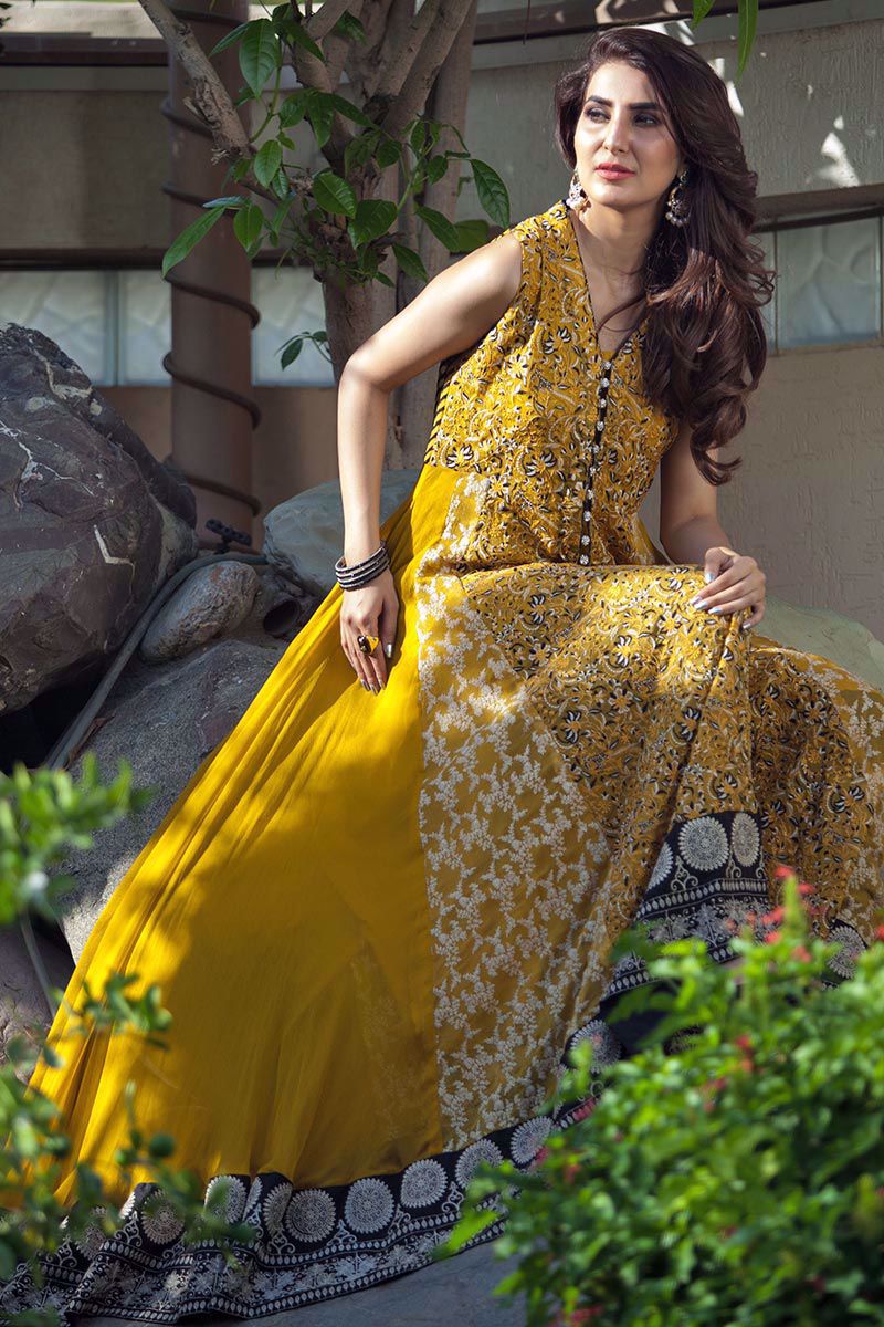 Mustard embroidered flare in front open style with stone balls. Embroidered yoke on back and black and beige embroidered border on daaman.