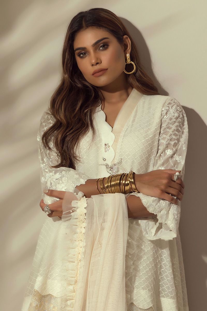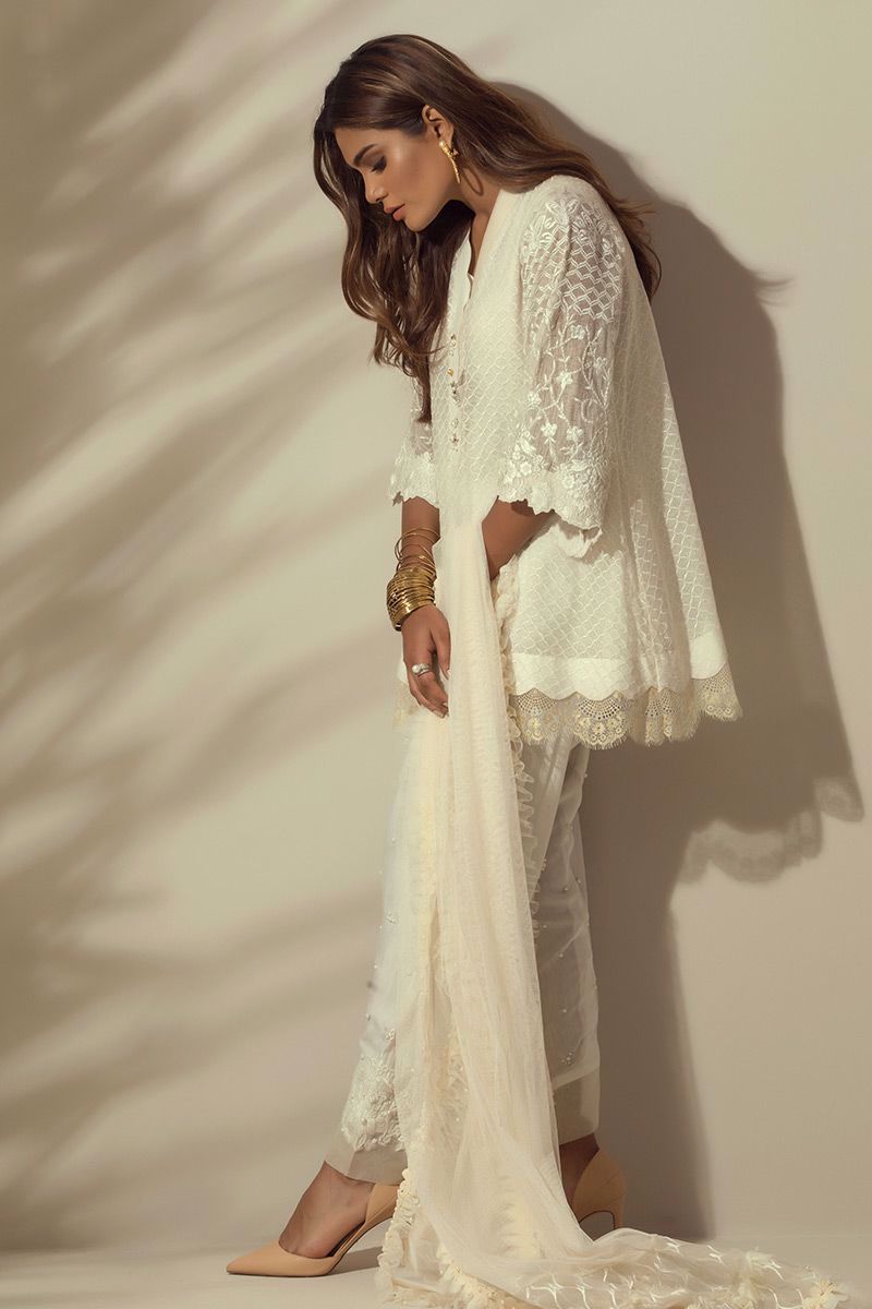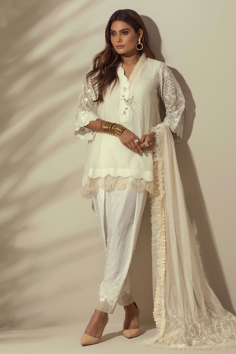 An elegant White colored self-embroidered Top with stylish sleeves and Chantilly border.