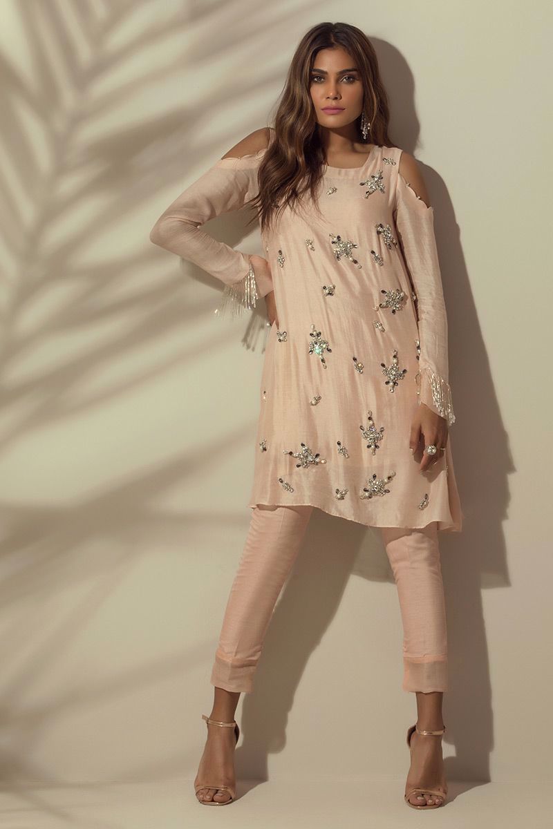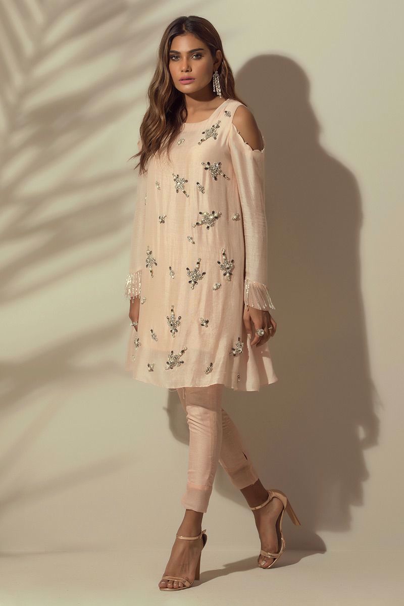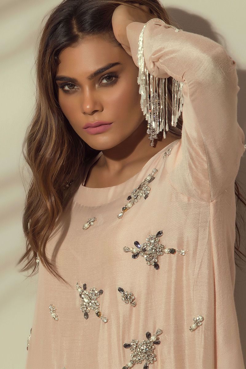 Light Peach khaadi Top beautifully hand worked with different sizes of stones and beads with lining.