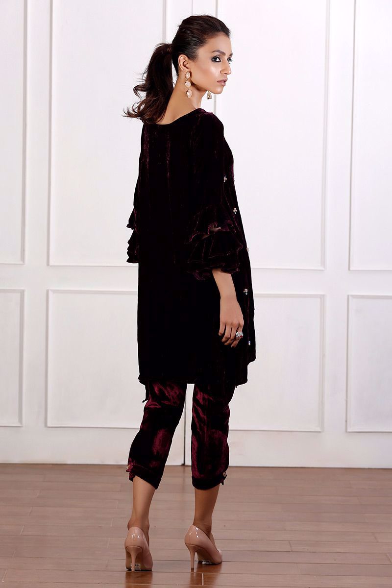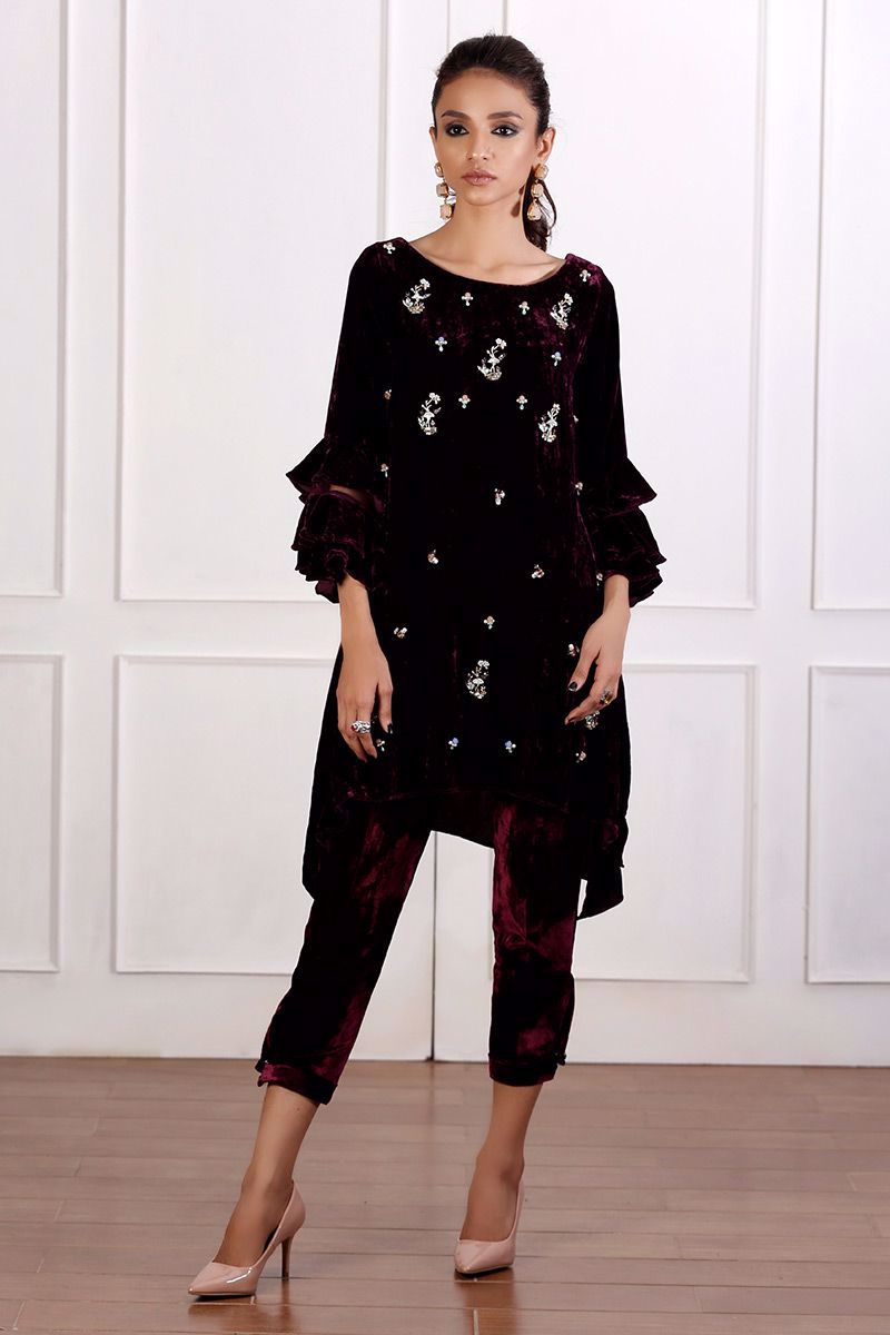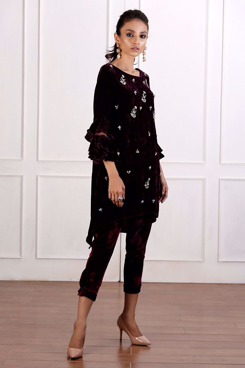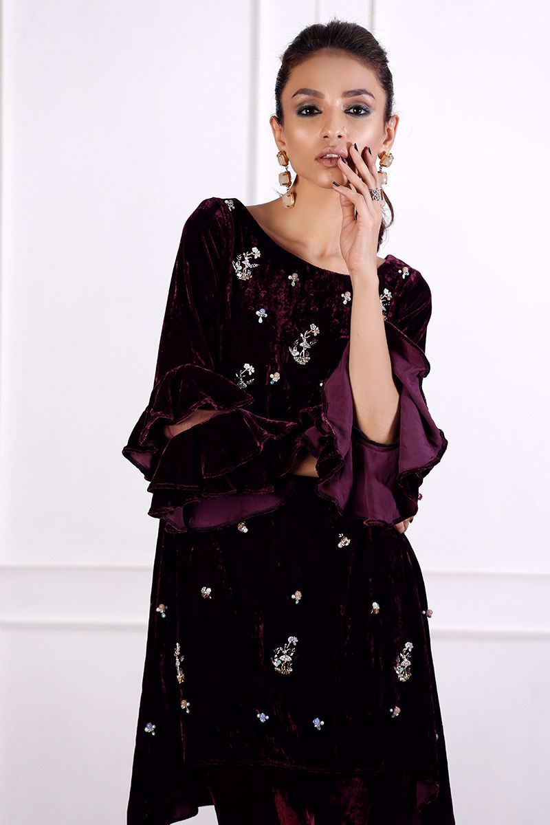 Pure velvet plum top is gorgeously hand worked with trendy detailing of different materials like crystals, pearls, cut dana and stones.