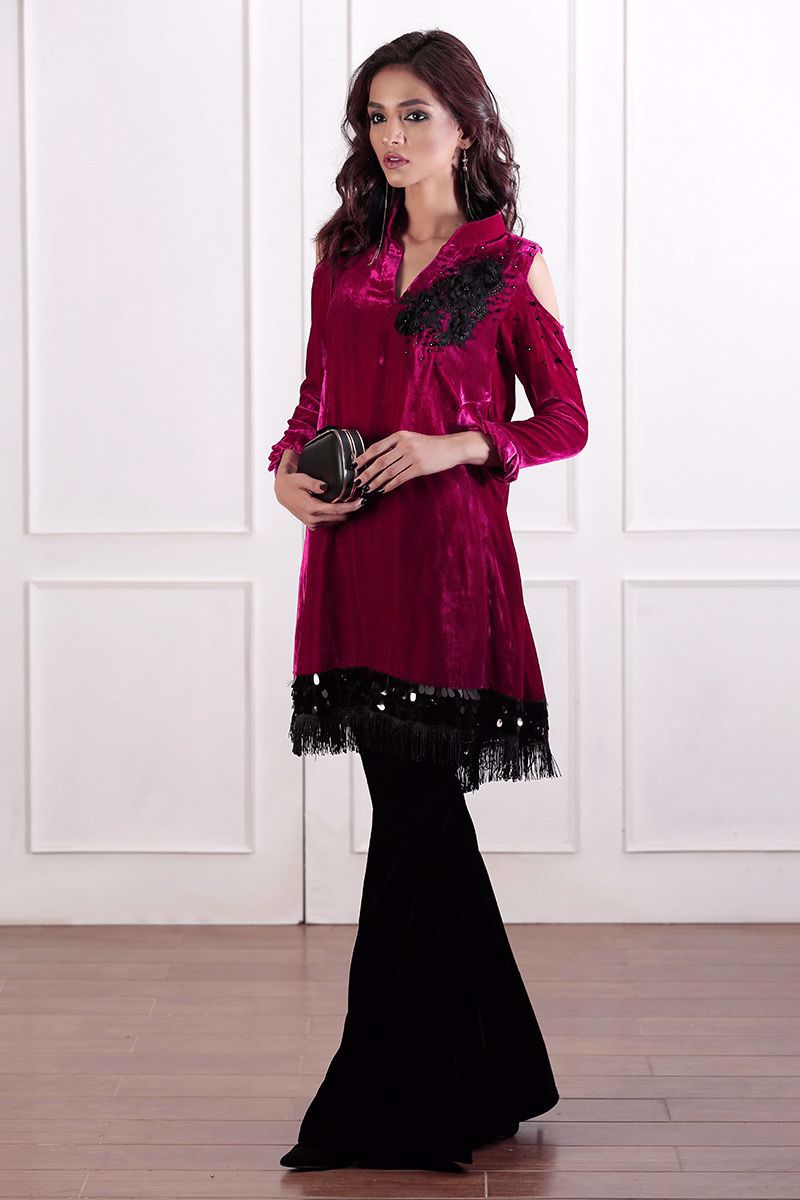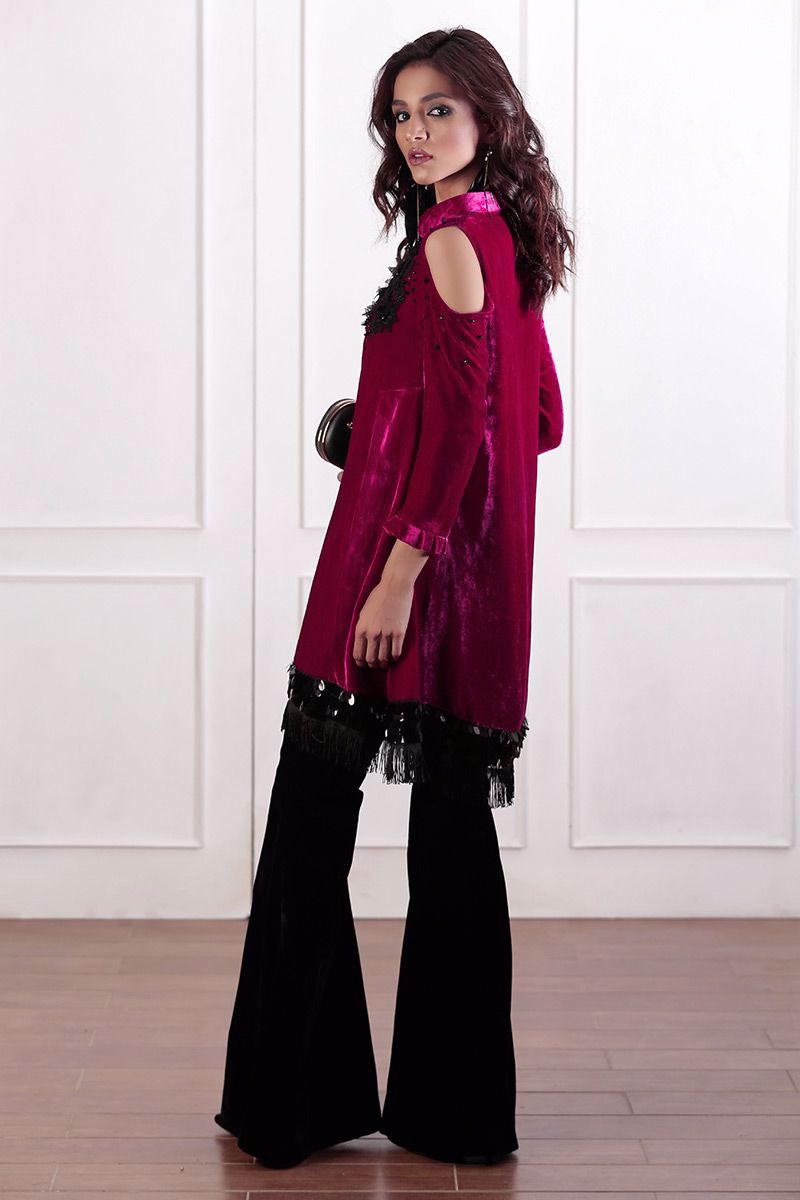 Shocking pink pure velvet cutout sleeves top with 3D flowers and hand worked crystals. Top is more enriched by giving sequins and tassels detailing on hem.