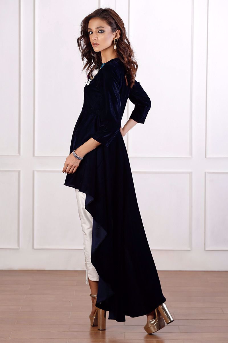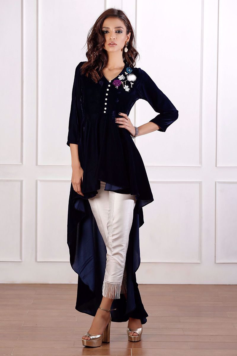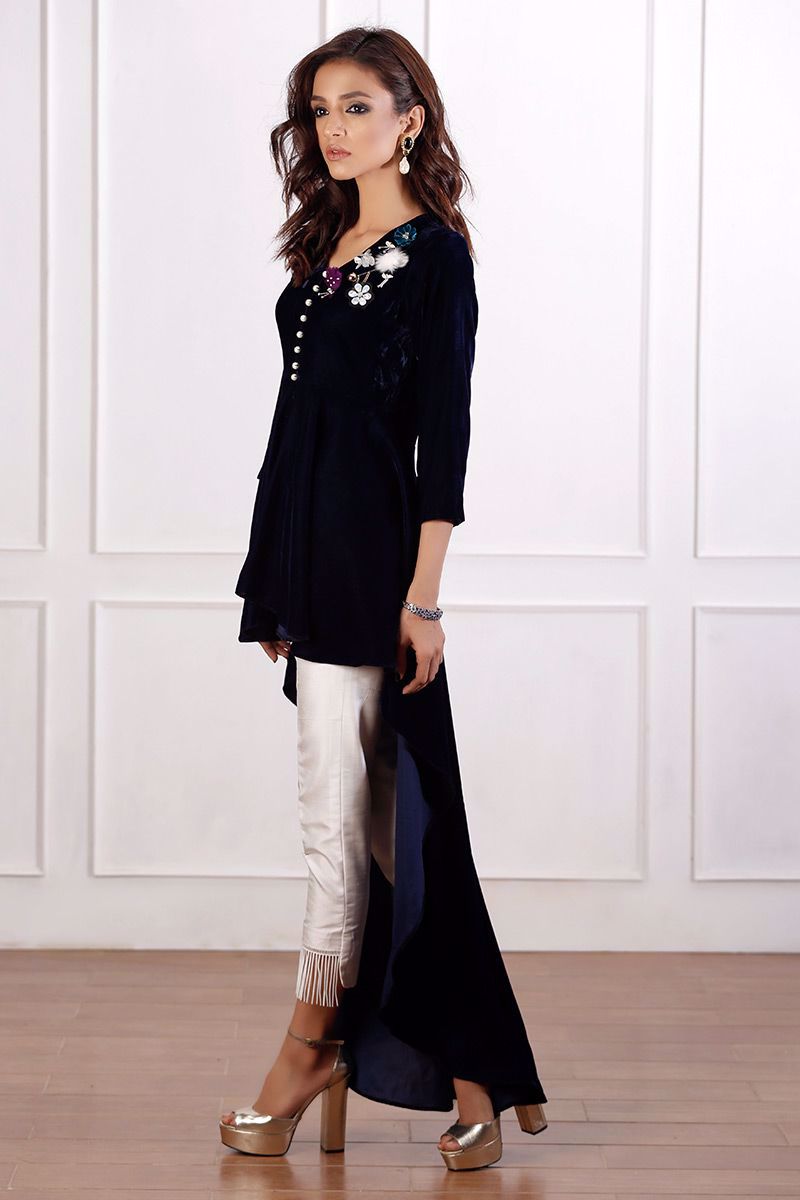 Voguish high low navy blue velvet peplum with v-neckline and loops buttons. Detailing of fur, flower and hanging is given to revamp the look.