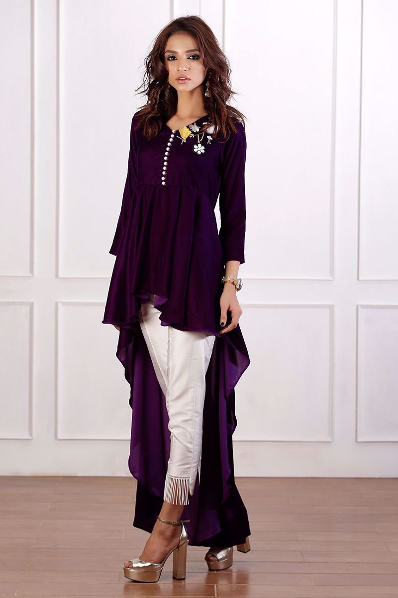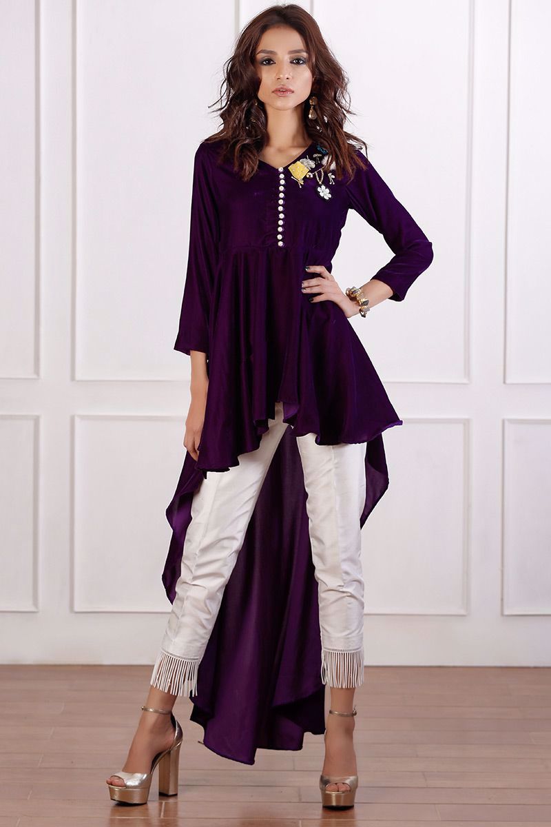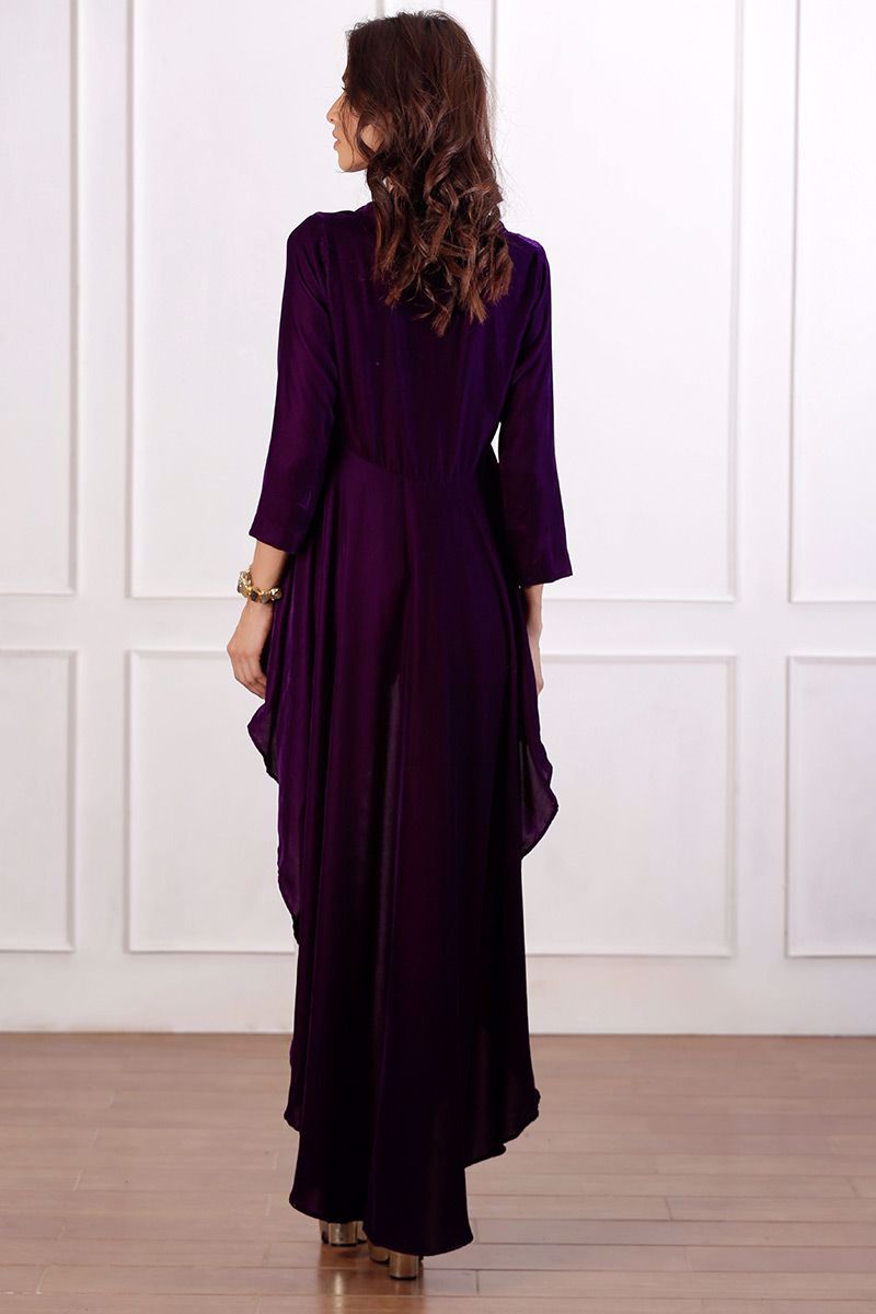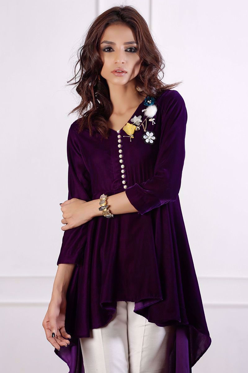 Trendy high low Purple velvet peplum with v-neckline and loops buttons. Detailing of fur, flower and hanging is given to revamp the look.