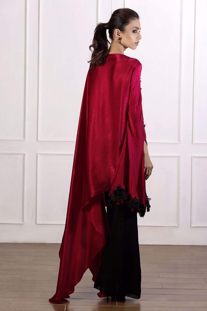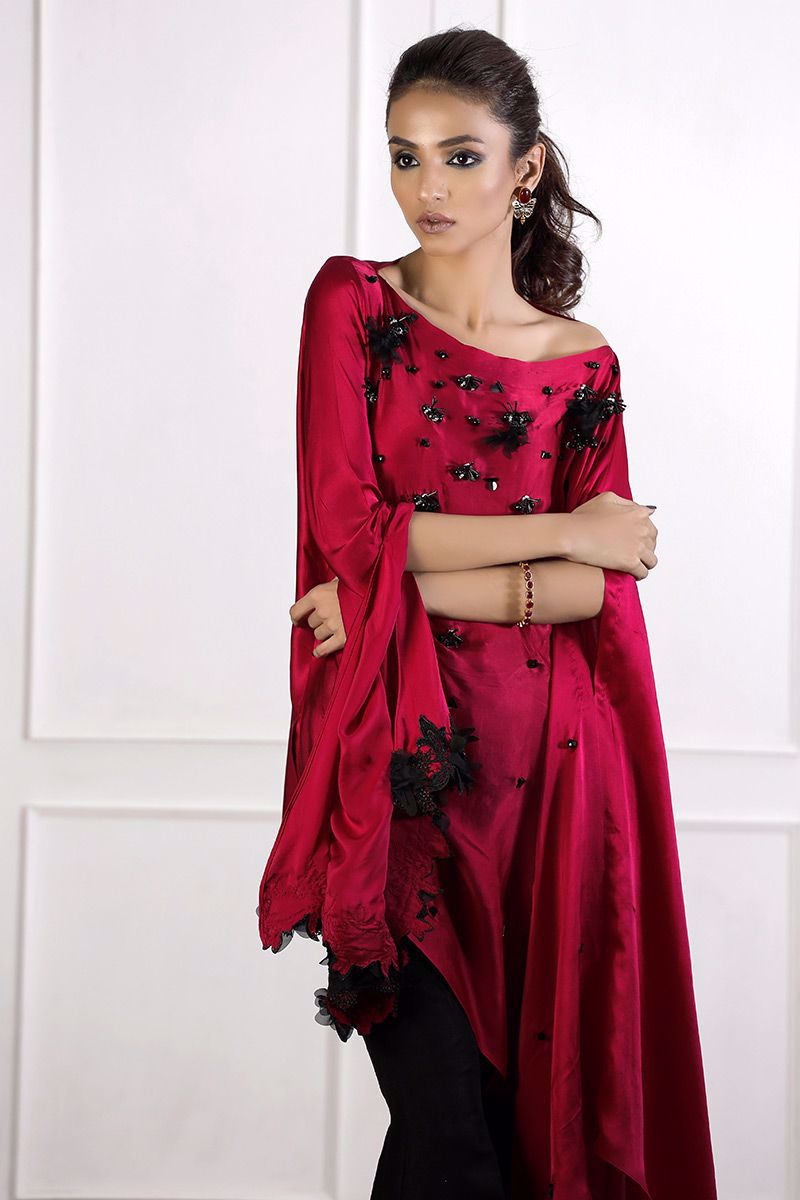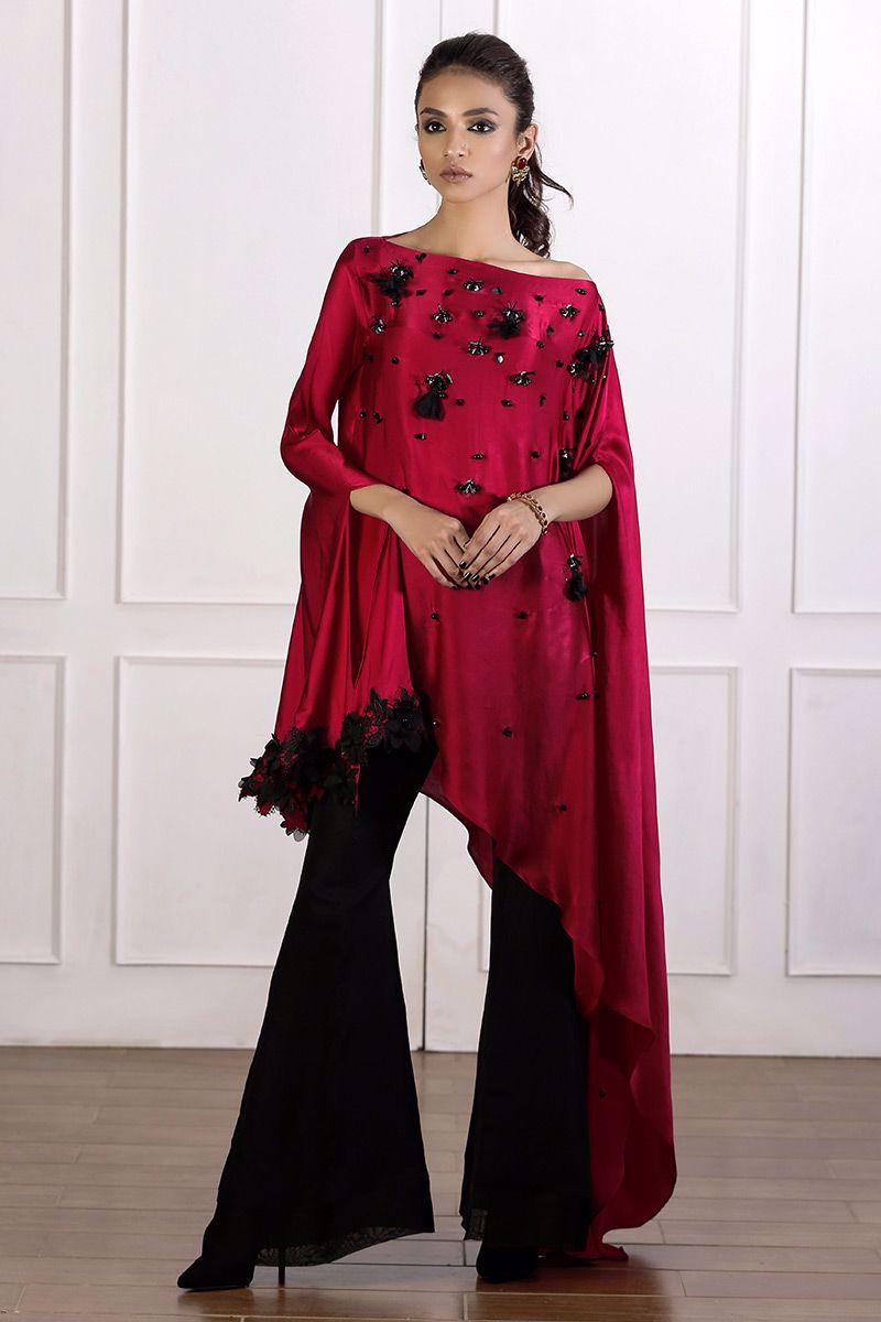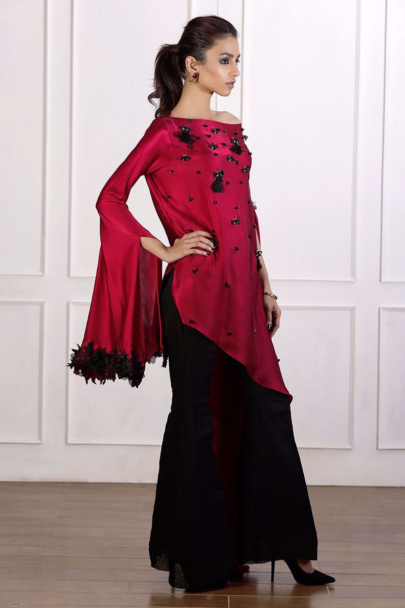 Voguish rose red pure charmeuse asymmetrical trendy cut top with striking hand worked booti and chan. One side sleeve with trendy floral detail and drop style from the other side gives it a flawless look.
