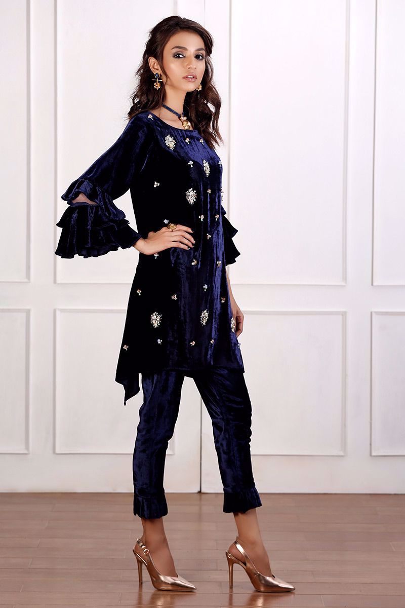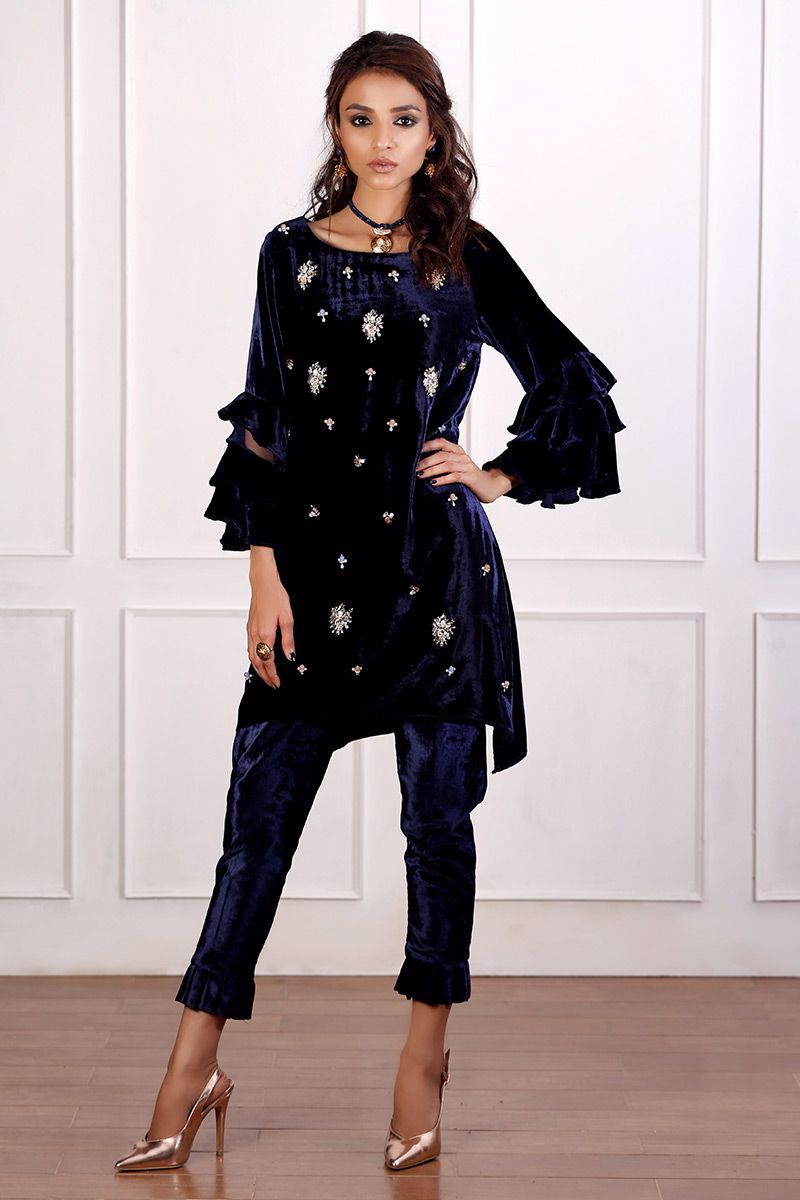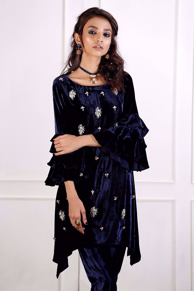 Pure velvet navy blue top is gorgeously hand worked with trendy detailing of different materials like crystals, pearls, cut dana and stones.