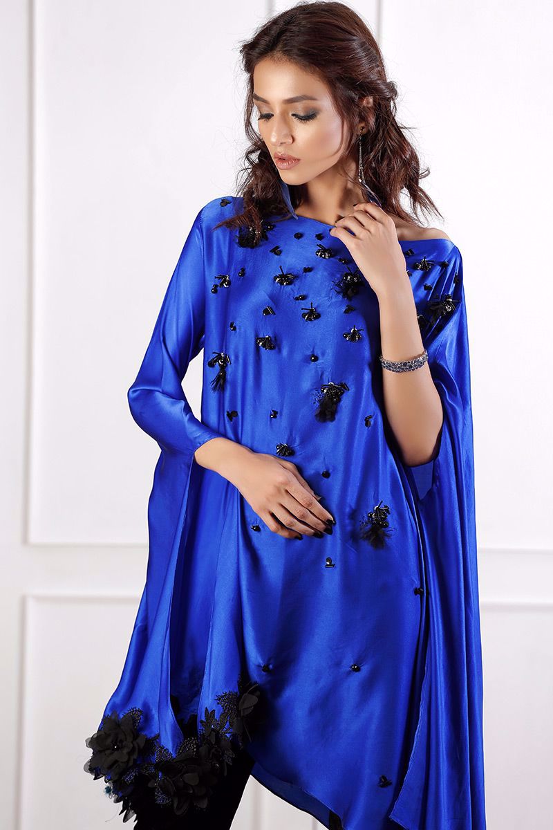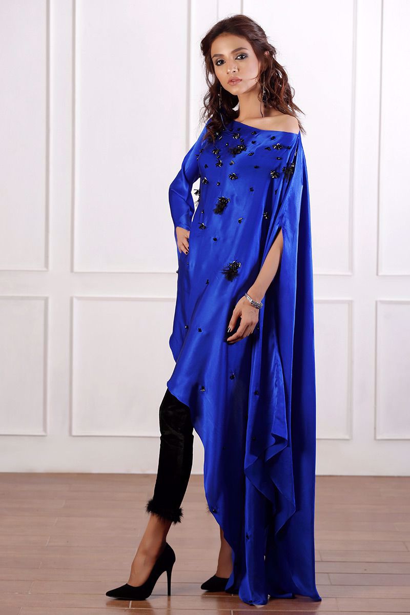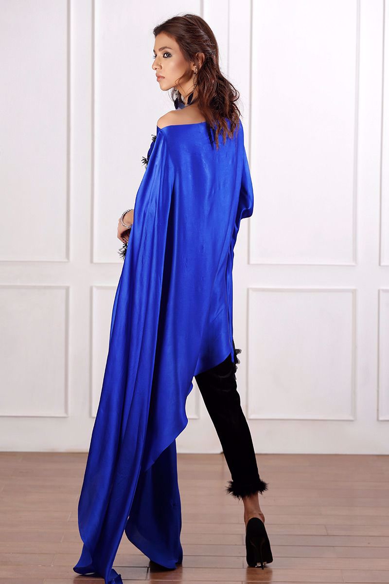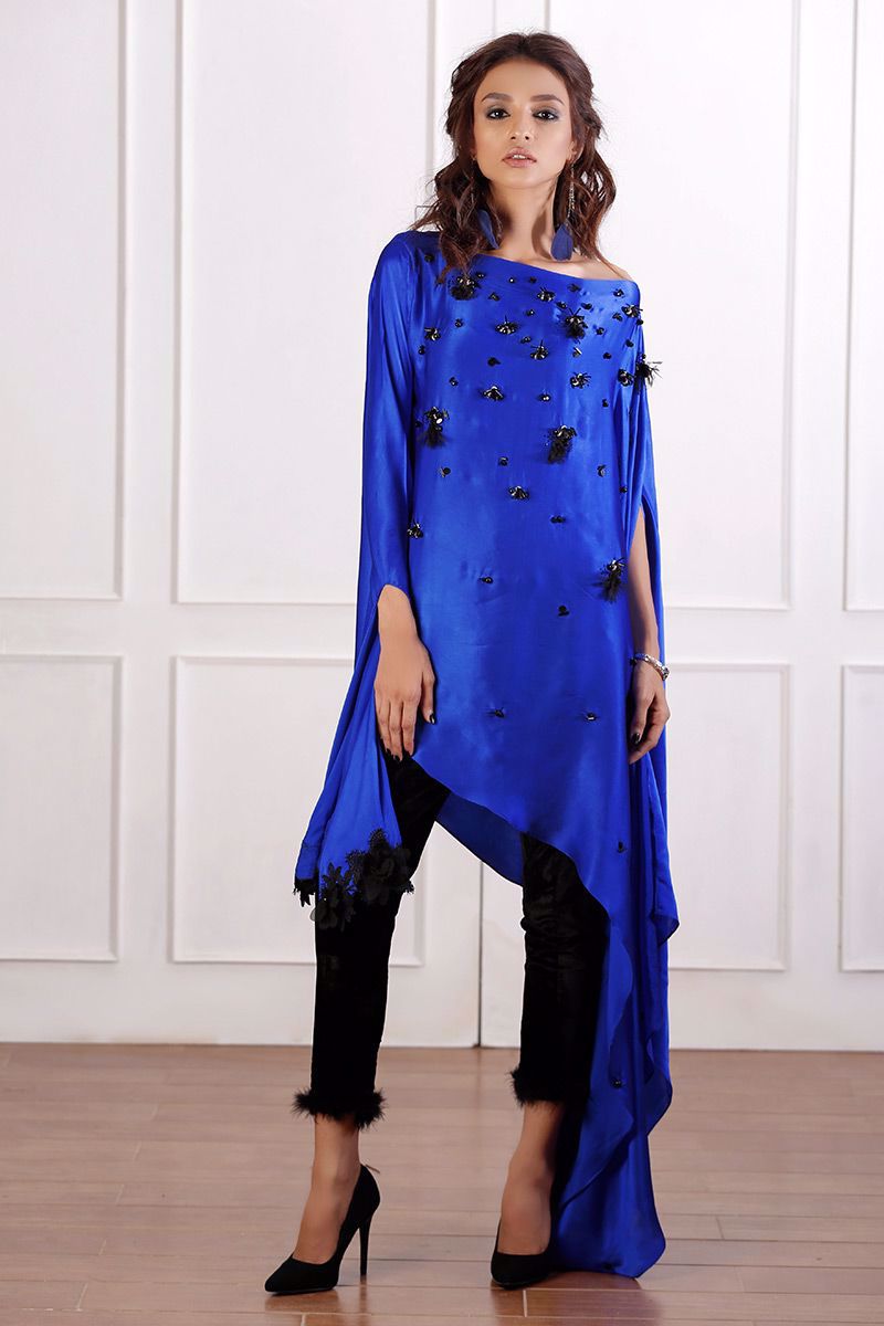 Modish electric blue pure charmeuse asymmetrical trendy cut top with striking hand worked booti and chan. One side sleeve with trendy floral detail and drop style from the other side gives it a flawless look.