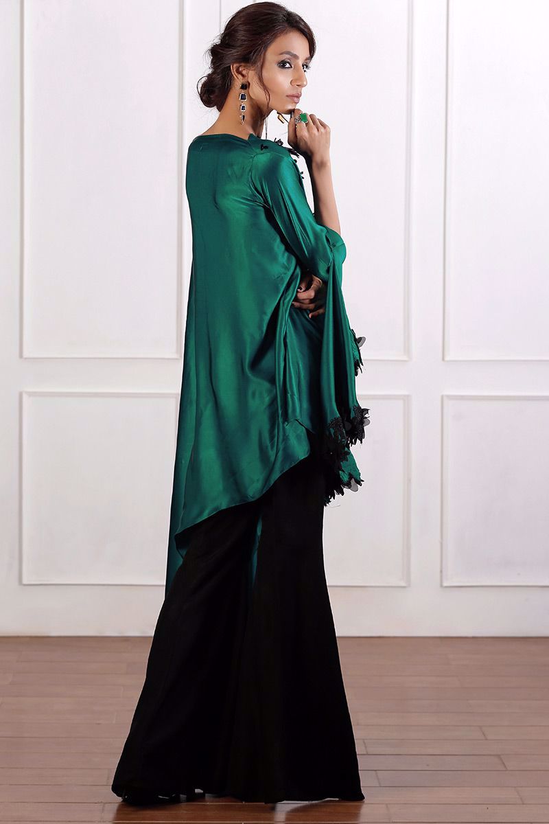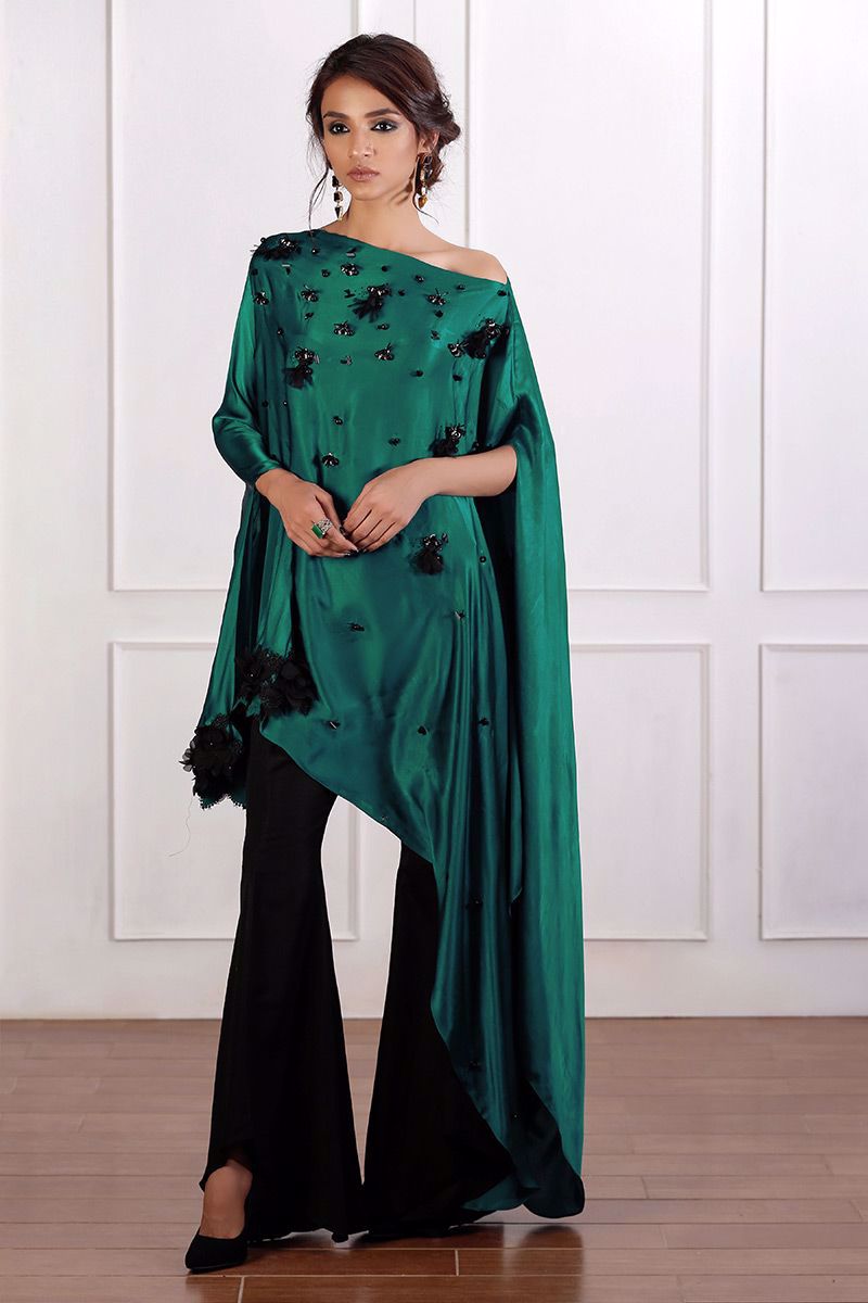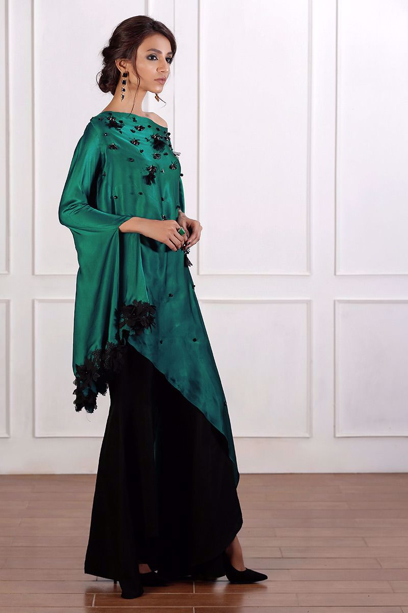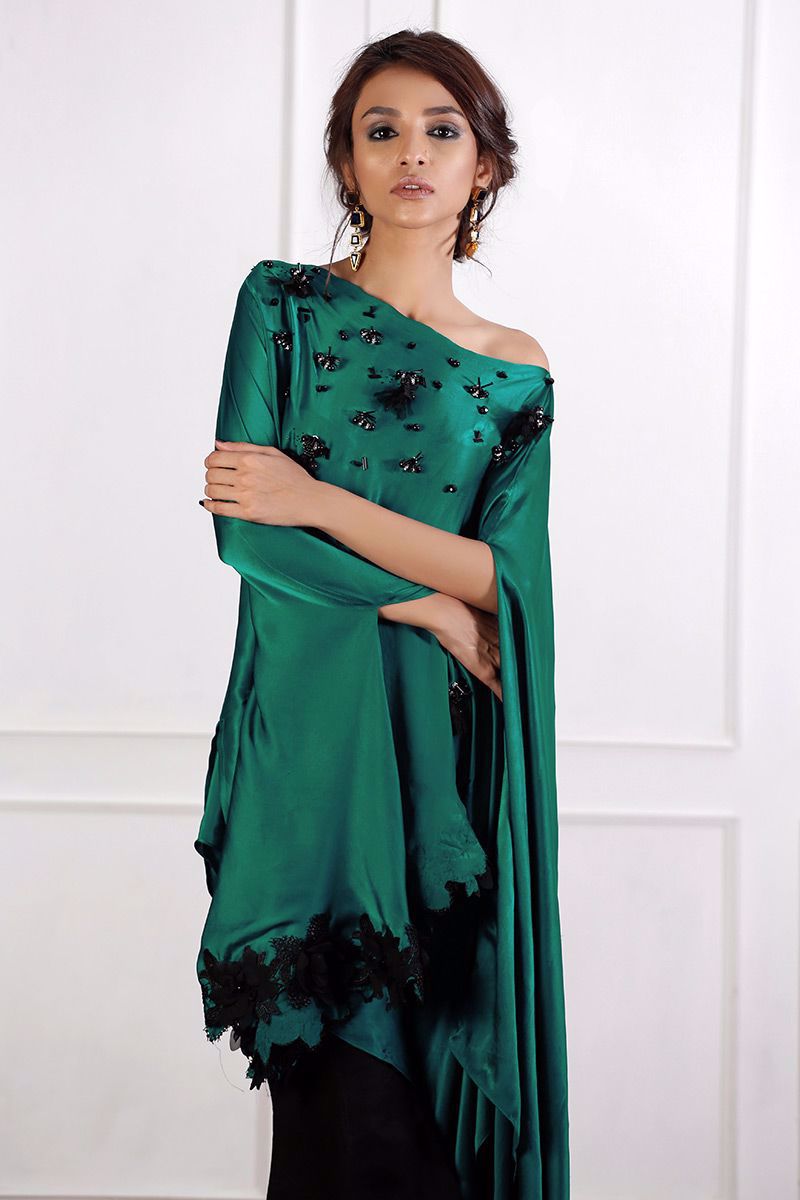 Traditional emerald green pure charmeuse trendy cut top with striking hand worked booti and chan. One side sleeve with trendy floral detail and drop style from the other side gives it a flawless look.