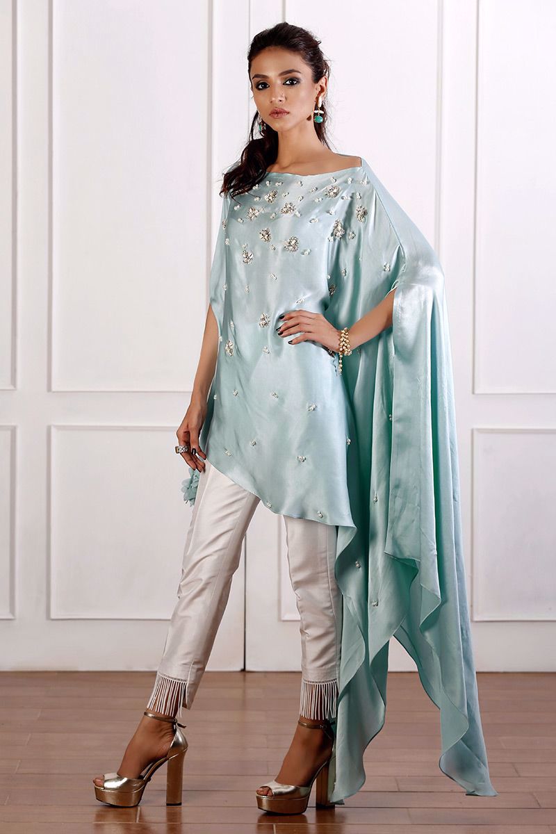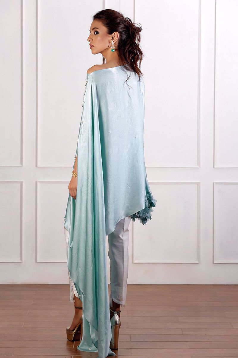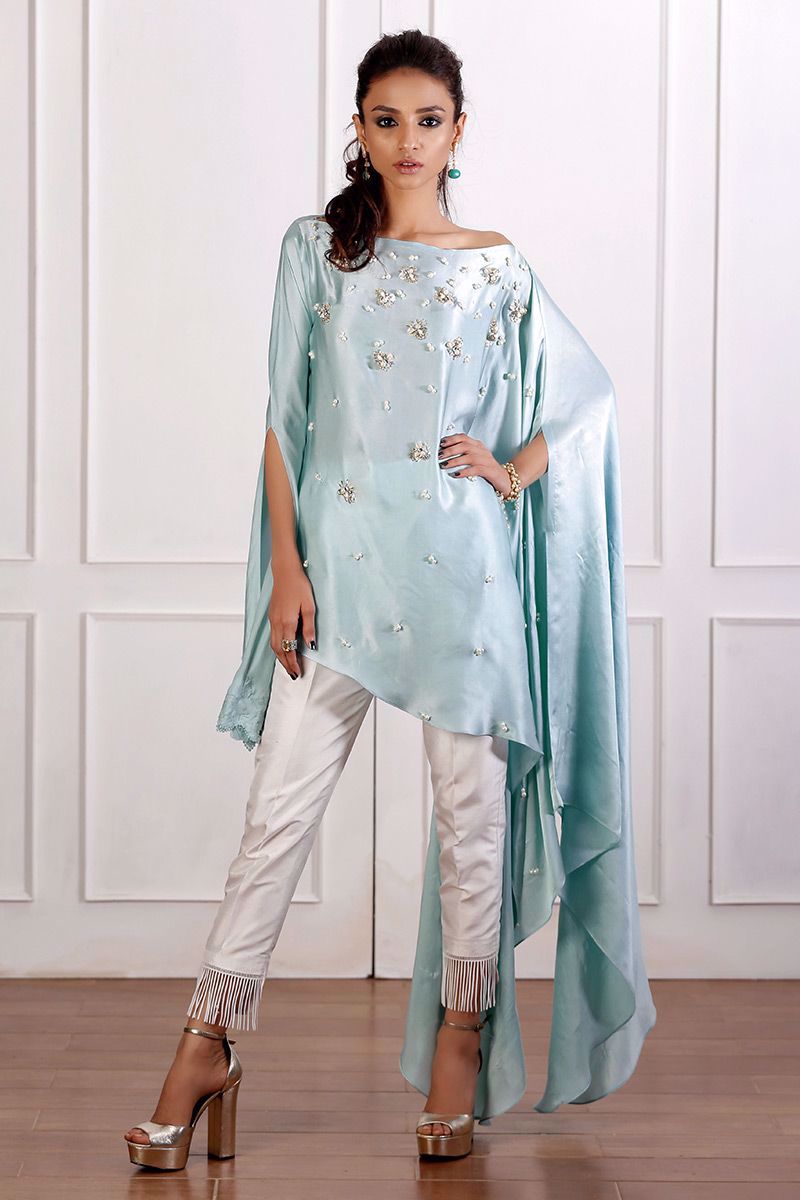 Elegant asymmetrical powder blue pure charmeuse top with floral details on one side sleeve and drop from the other side. Design is enriched with handwork of pearls, stones, cut dana, sequins booti and chan.