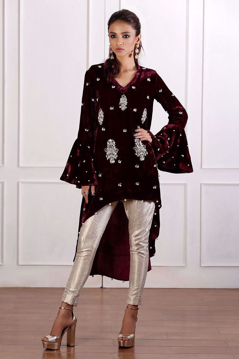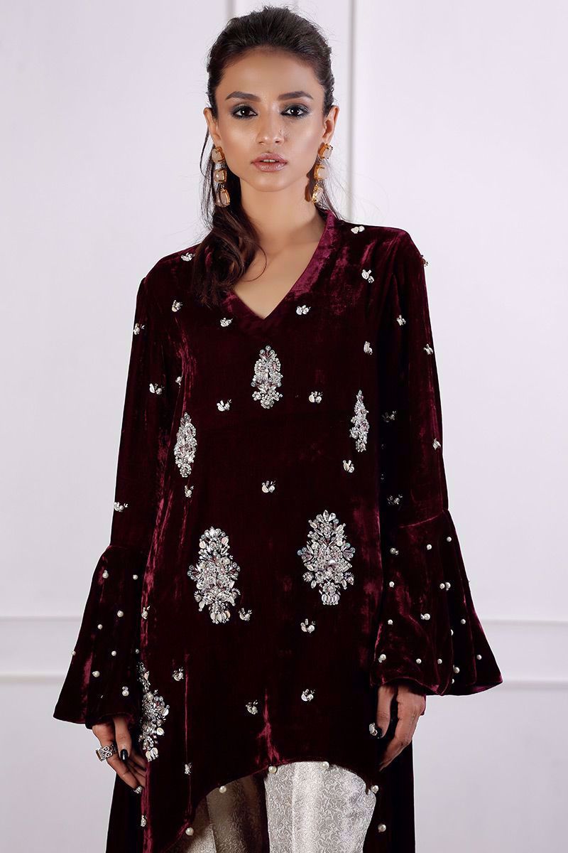 Stunning pure velvet plum top elegantly hand worked with pearls, stones and sequence. Bell sleeves are designed to make it look more striking. Chan all over the top enhances the beauty.