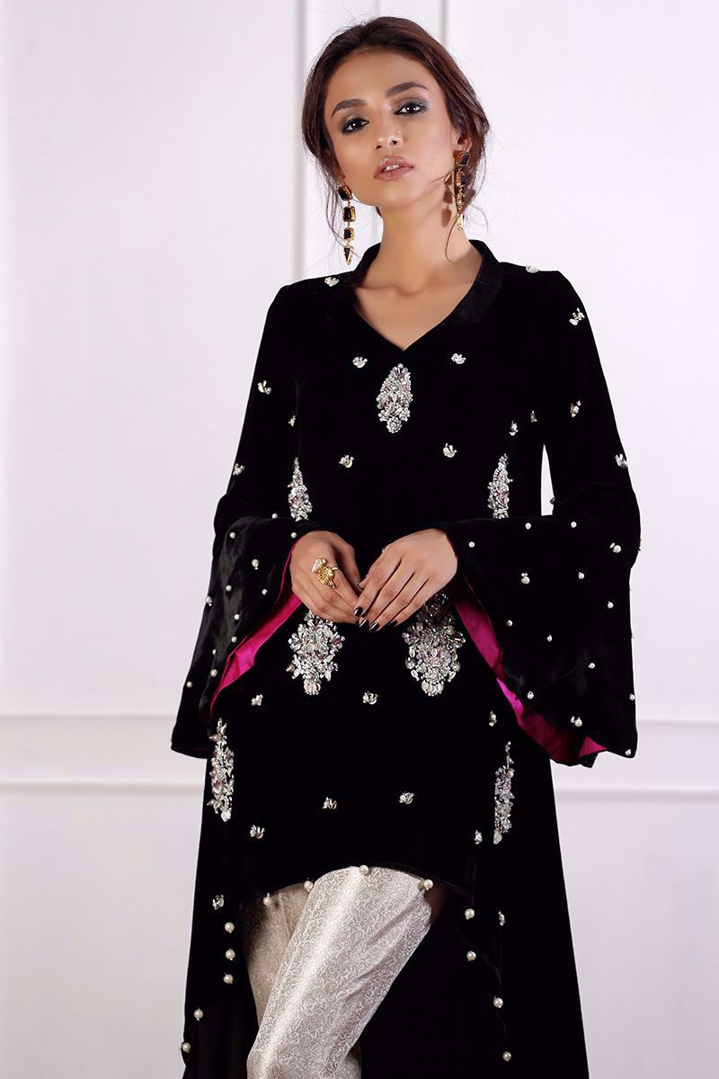Gorgeous black velvet top elegantly hand worked with crystals, cut dana, naqshi, pearls, stones and sequence. Bell sleeves are designed to make it look more striking with contrasting lining. Chan all over the top enhances the beauty.