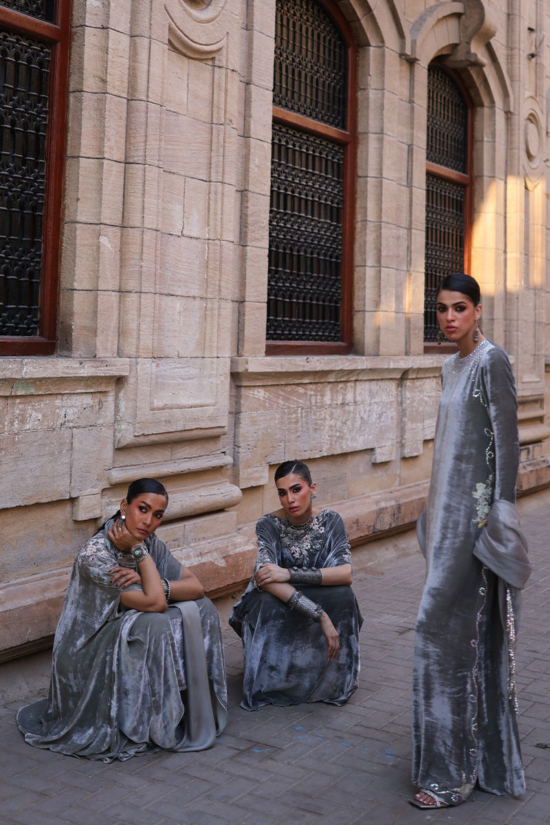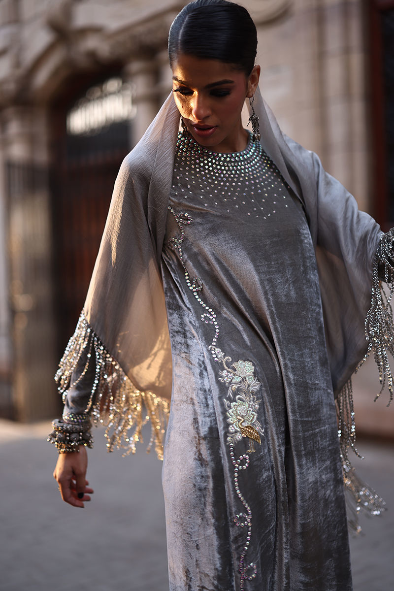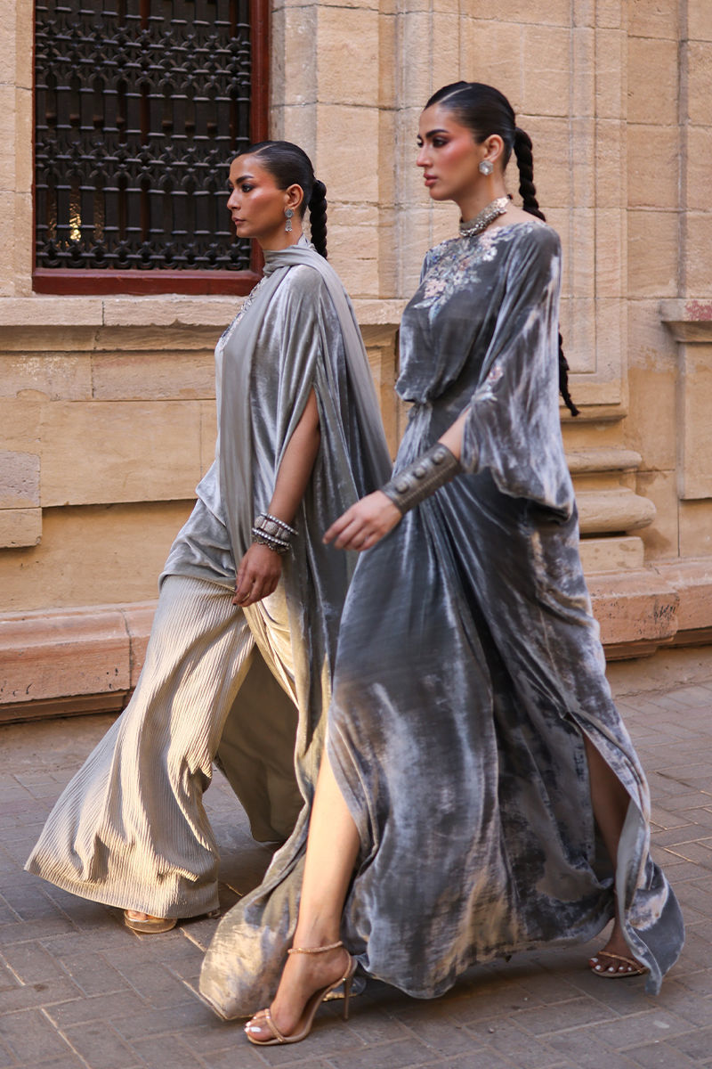 An elegant Desert Sage kaftan crafted from pure velvet, adorned with exquisite hand-stitched stonework featuring zari, resham, cutdana, sequins, dabka, and nakshi detailing on the front, back, and sleeves. The silhouette is thoughtfully designed with functional pockets for added ease. Paired with a refined shrug in diamond silk and culottes or pants tailored from soft cotton charmeuse, this ensemble blends luxurious craftsmanship with understated sophistication—a perfect choice for timeless festive charm.
