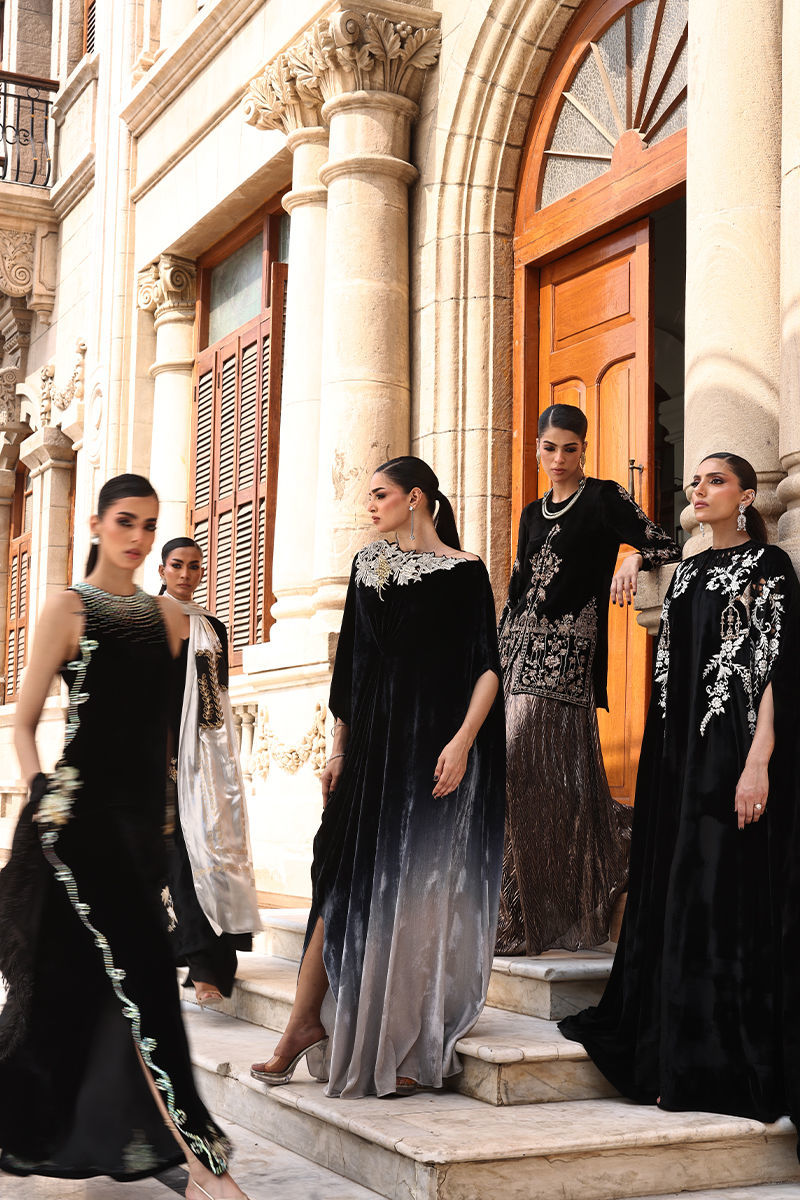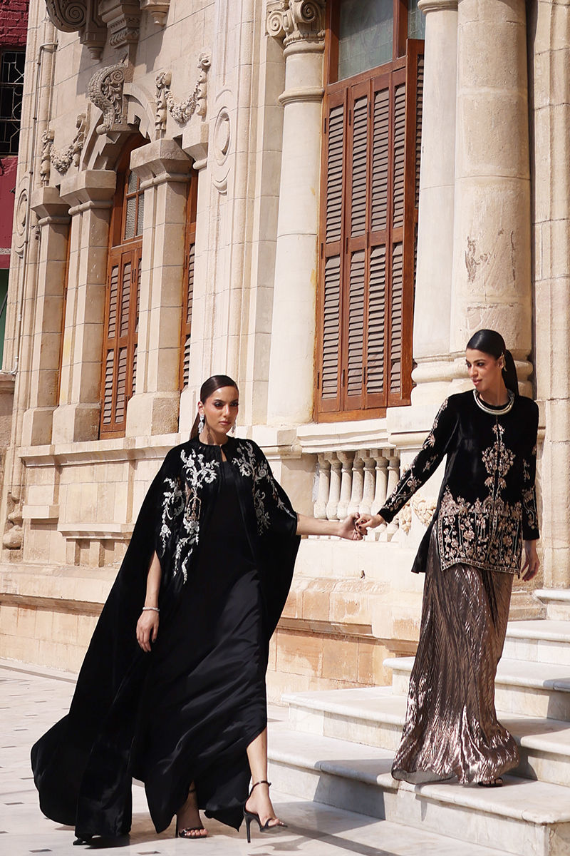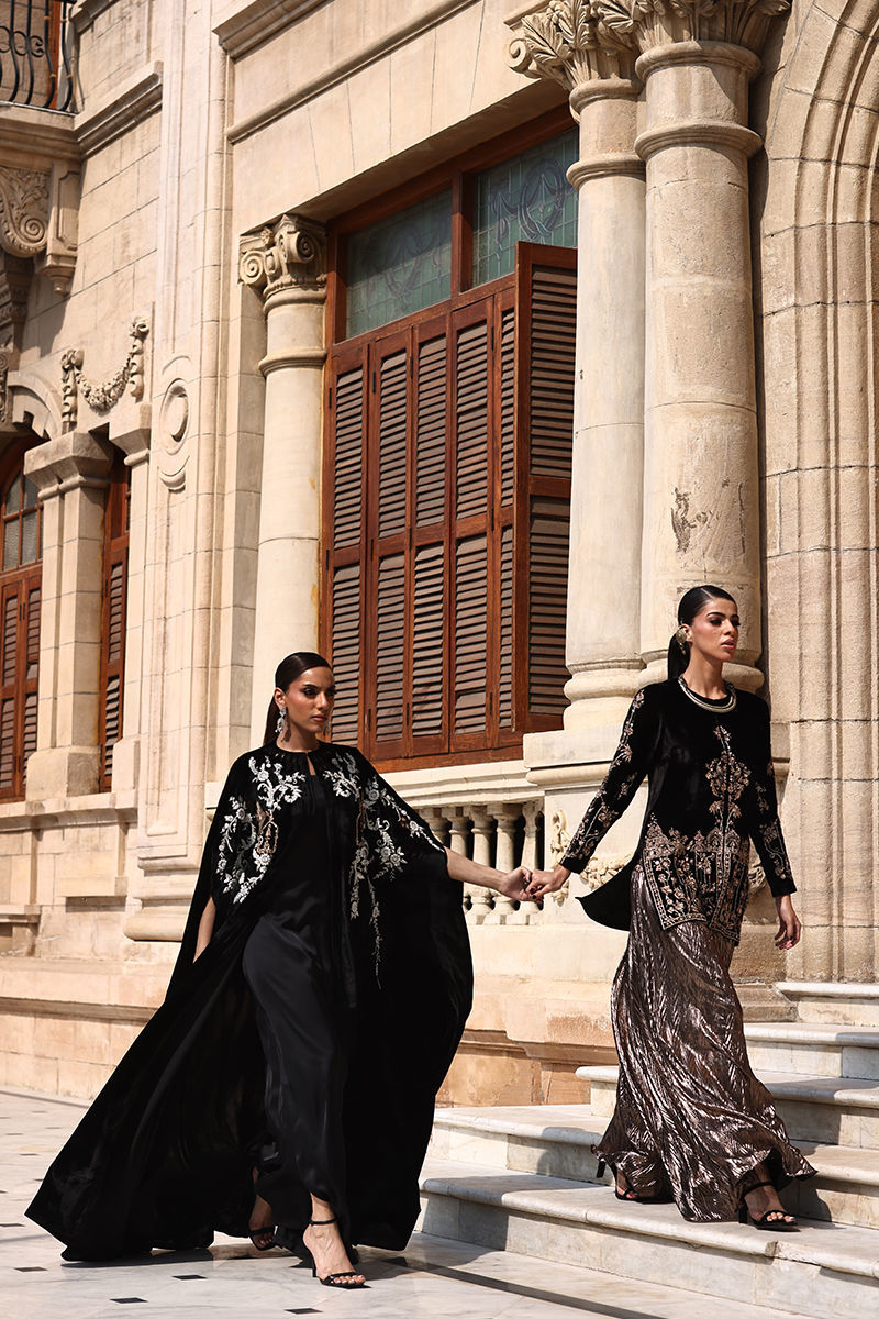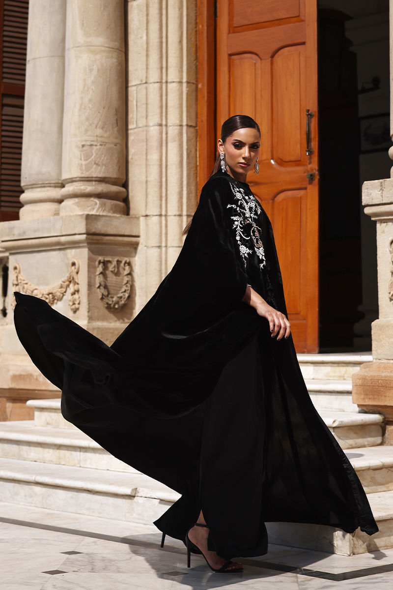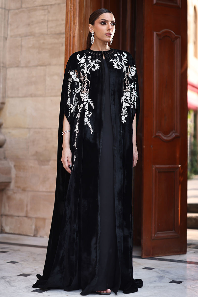 Color: Black Fabric: Cape: Pure Velvet and Inner: Cotton Charmeuse Work Details: Embroidered and Embellished