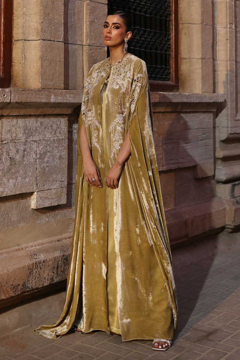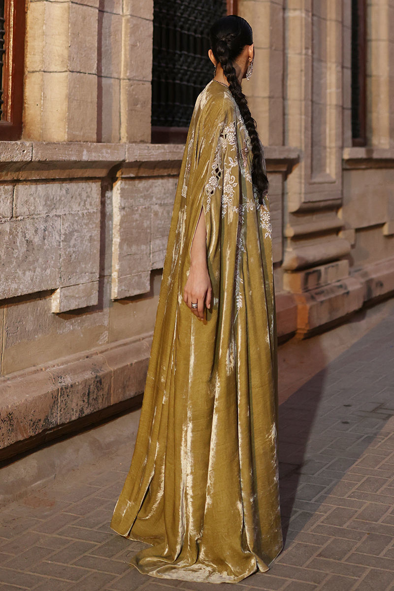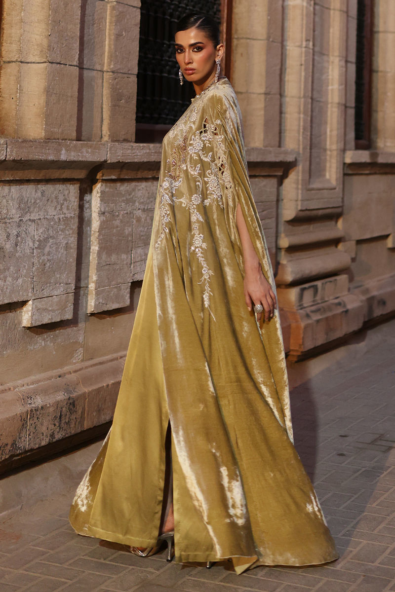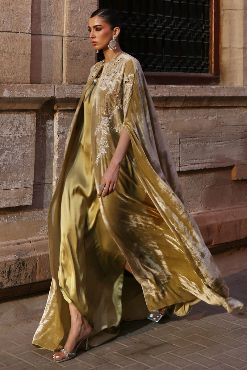 Color: Lime Bean Fabric: Cape: Pure Velvet and Inner: Cotton Charmeuse Work Details: Embroidered and Embellished