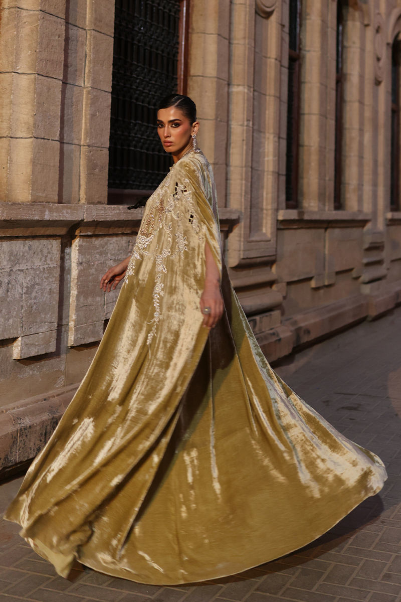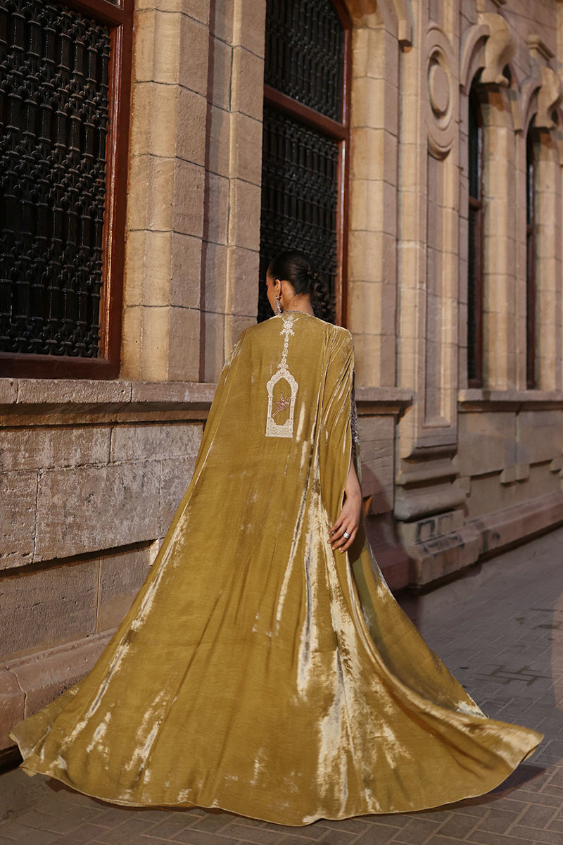A statement of elegance in lime bean velvet, this cape features intricate gold zari embroidery and delicate cutwork across the front and back. The design is enriched with silver zari, lorex, white resham, stones, and fully rose gold handwork motifs, complemented by handcrafted patels for a luxurious, artisanal finish. Lined with cotton charmeuse for comfort, it effortlessly blends sophistication with meticulous craftsmanship.