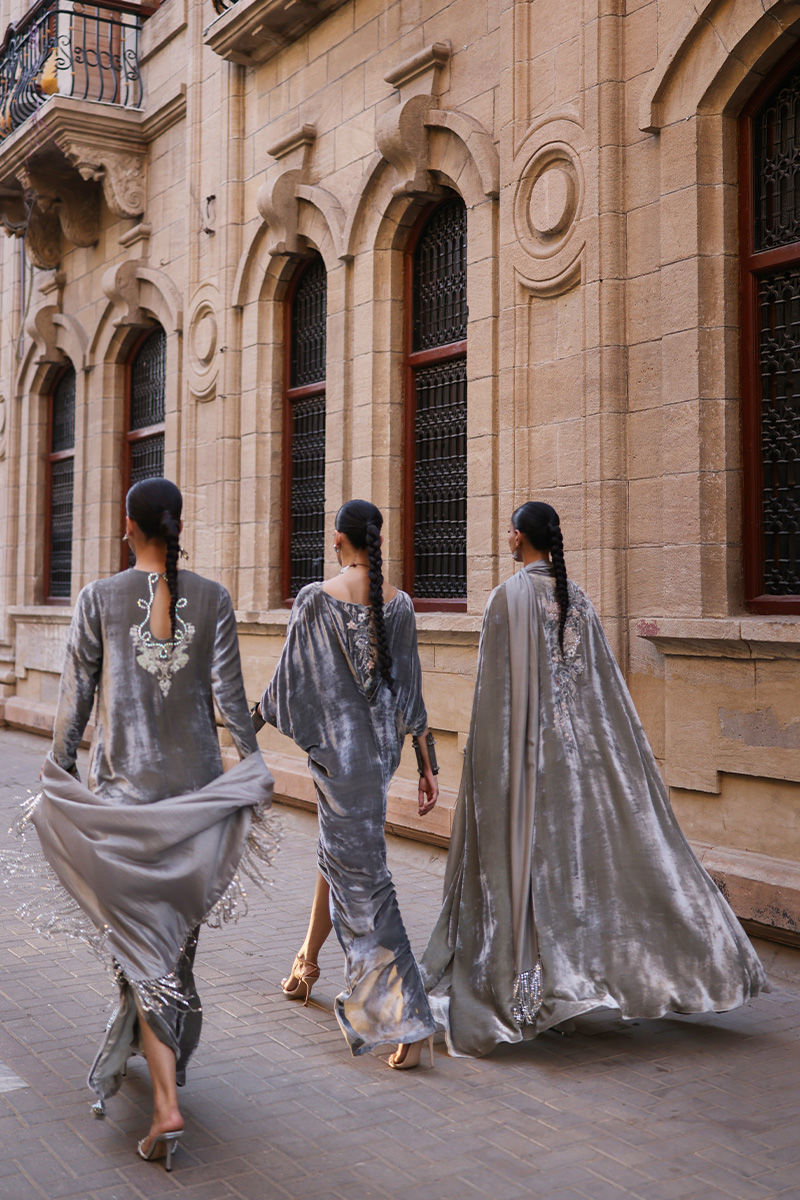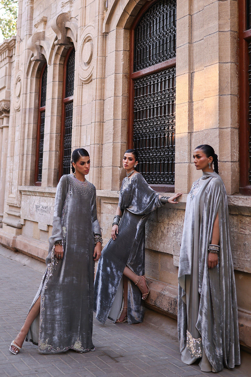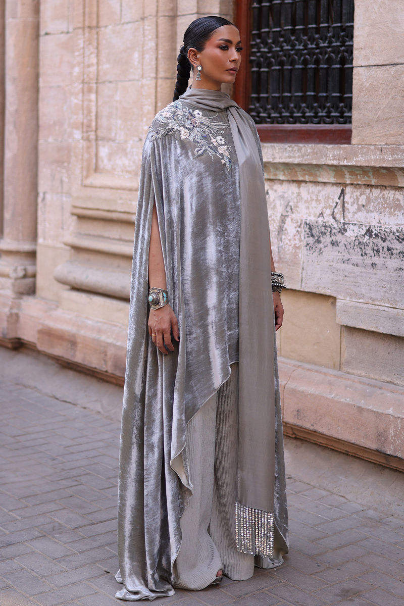Color: Moss Grey Fabric: Shirt: Pure Velvet and Stole: Pure Medium Silk Work Details: Embroidered and Embellished