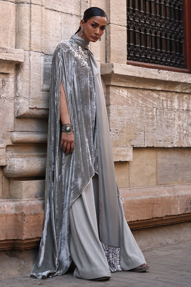 This high-low silhouette in luxurious pure velvet exudes contemporary elegance, paired with pleated culottes for a modern, flowing look. The ensemble features an attached stole in pure medium silk, adding grace and sophistication. Both the front and back are adorned with intricate zari and colored resham embroidery, enhanced with sequins, moti, pearls, cutdana, and crystals, showcasing meticulous handwork and timeless artistry.