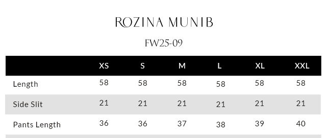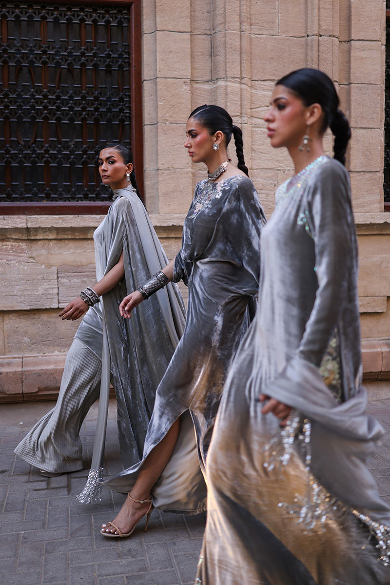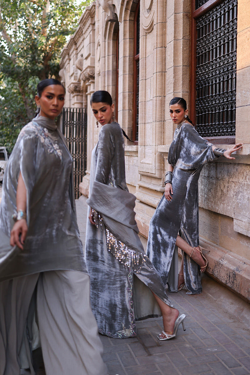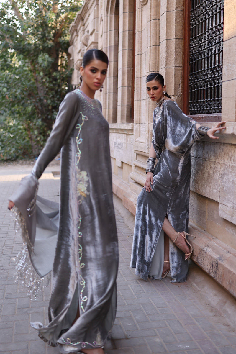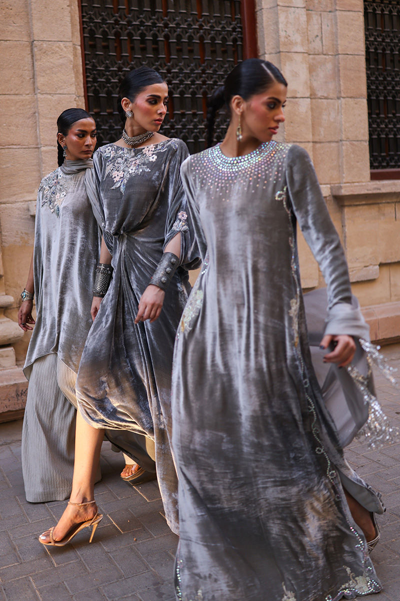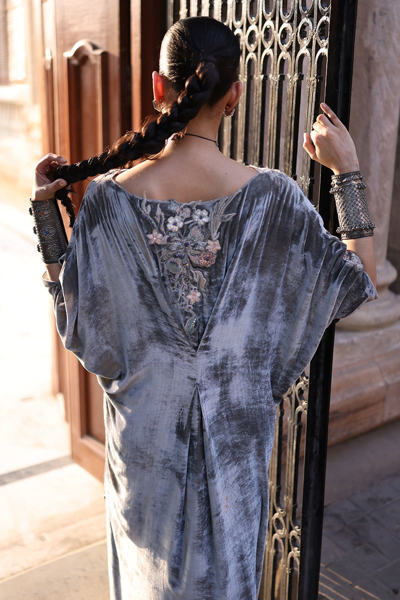 A sophisticated kaftan in luxurious pure velvet, paired with cotton charmeuse pants for comfort and elegance. The ensemble is adorned on the front, back, and sleeves with intricate silver zari and colored resham embroidery, enhanced with delicate cutdana, sequins, pearls, and crystals, showcasing exceptional handwork and timeless craftsmanship.