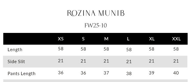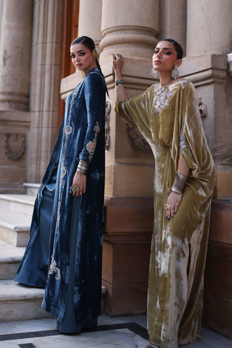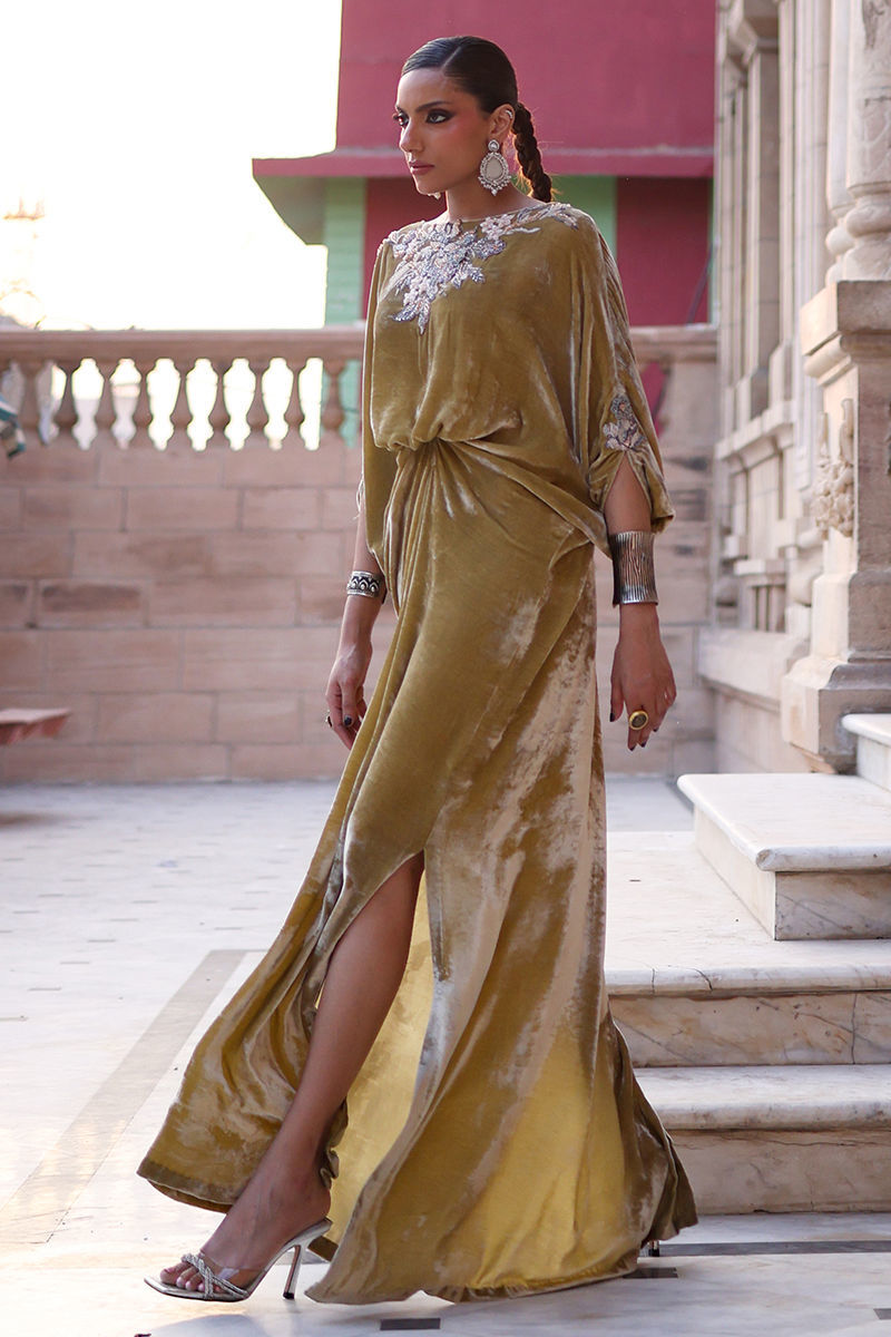This elegant Sugar Cane-colored kaftan is crafted in luxurious pure velvet, paired with cotton charmeuse pants for comfort and sophistication. The front, back, and sleeves are adorned with intricate silver zari and colored resham embroidery, enhanced with cutdana, sequins, pearls, and crystals, reflecting exquisite handwork and timeless elegance.