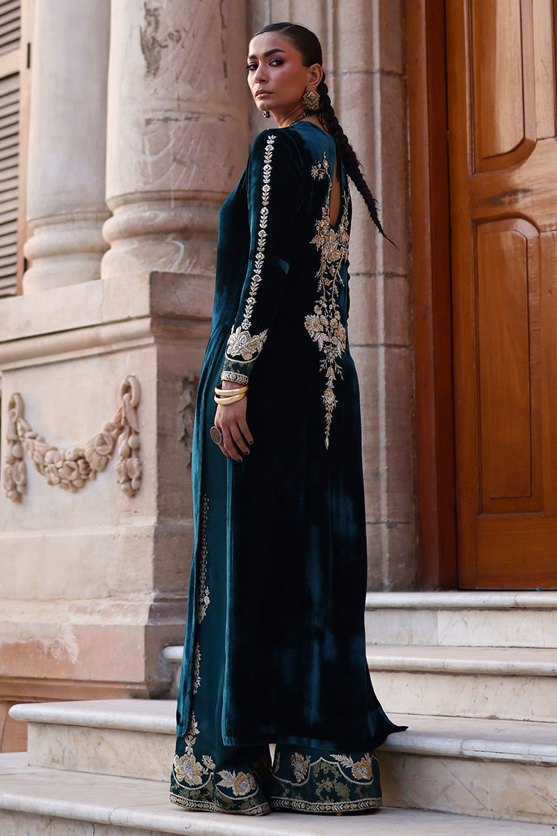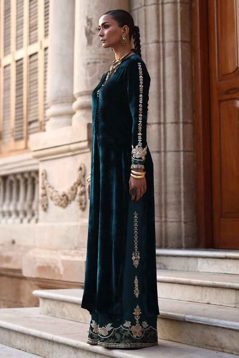 An exquisite emerald green straight long shirt crafted from pure velvet, richly adorned with silver and gold zari embroidery and heavy zardozi work. The intricate detailing features kora, dabka, cutdana, stones, pearls, nakshi, and sequins on the front, back, and sleeves, reflecting timeless craftsmanship. Paired with cotton charmeuse culottes in matching emerald green, enhanced with silver, gold zari, lorix embroidery, and Banarasi appliqué. The look is beautifully completed with a fog beige lame chiffon dupatta, delicately embroidered in gold, silver, and lorix, adding a graceful contrast and regal finish.