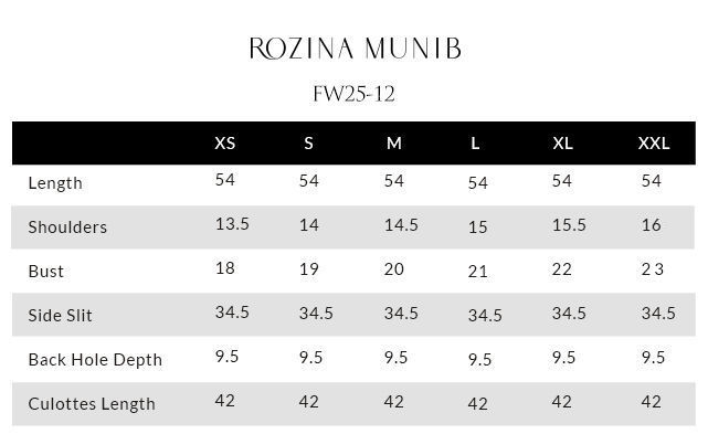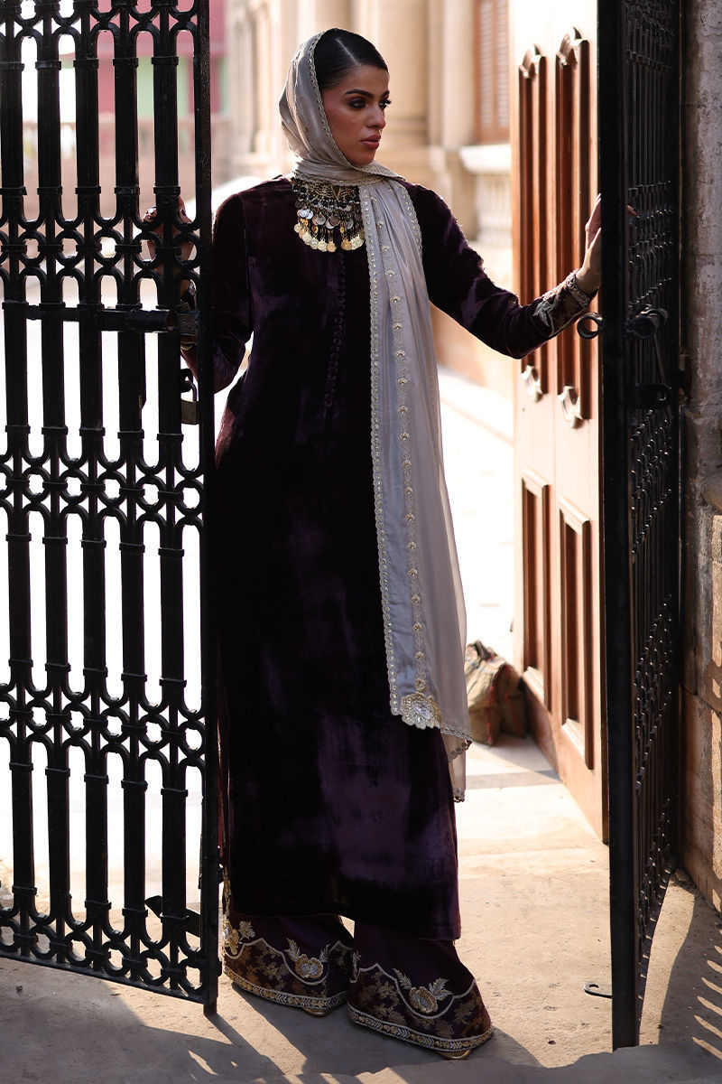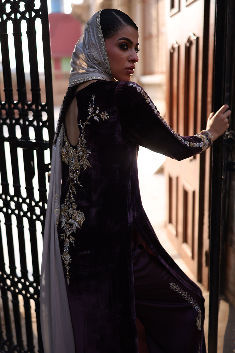 A timeless straight long shirt crafted in luxurious pure velvet, adorned with silver and gold zari embroidery and heavy zardozi work. The intricate embellishments—kora, dabka, cutdana, stones, pearls, nakshi, and sequins—grace the front, back, and sleeves, reflecting refined craftsmanship. Paired with cotton charmeuse culottes featuring silver and gold zari, lorix embroidery, and Banarasi appliqué, adding depth and detail. The ensemble is completed with a fog beige lame chiffon dupatta, delicately embroidered in gold, silver, and lorix, creating a perfect balance of elegance and sophistication.