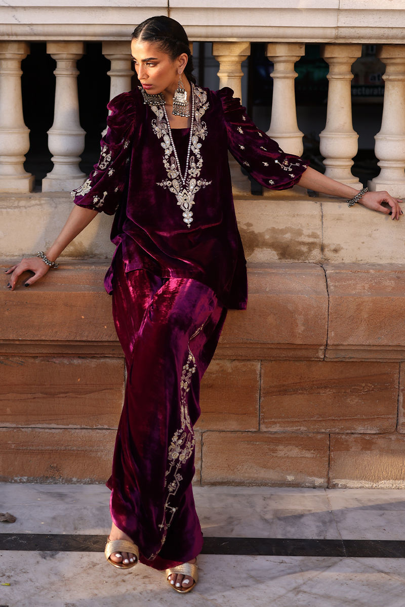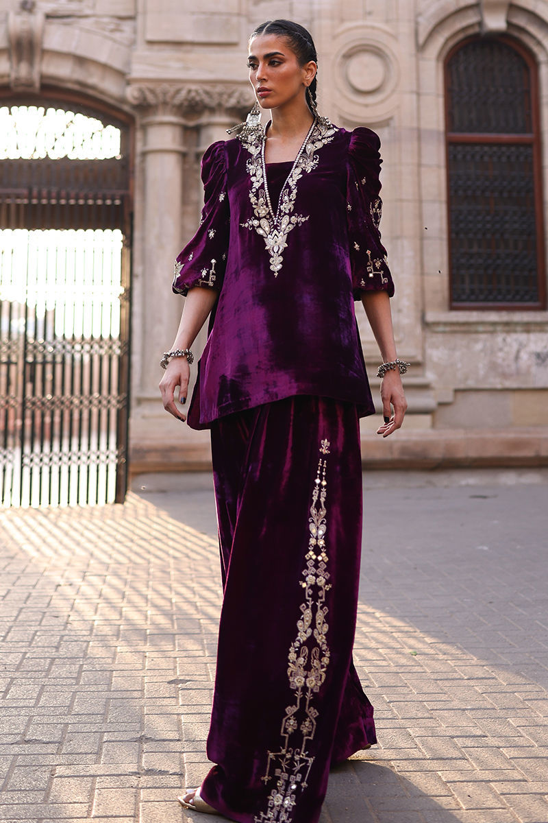 Color: Magenta Haze Fabric: Pure Velvet Work Details: Embroidered and Embellished