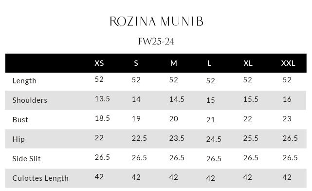 An opulent prince panel crafted in luxurious pure velvet, featuring side pockets for a modern touch. The design is adorned with silver and gold zari embroidery, enriched with heavy antique zardozi work including kaamdani, dabka, nakshi, stones, cutdana, moti, and crystals on the front, back, and sleeves, reflecting exquisite craftsmanship. Paired with cotton charmeuse culottes for elegance and comfort, and complemented with a fog beige lame chiffon dupatta embellished with gold, silver, and lorix embroidery, this ensemble perfectly balances regal sophistication with contemporary style.