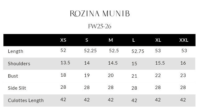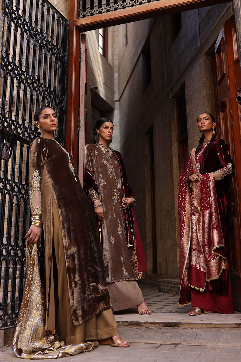 A Wood Smoke-colored Chogha-style shirt in pure velvet, intricately embroidered with gold, antique, and rose gold zari threads. The heavy zardozi work is a celebration of craftsmanship — featuring imported crystals, dabka, nakshi, stones, cutdana, sequins, and moti across the front, back, and sleeves. Completing the ensemble are cotton charmeuse culottes and a pure velvet shawl in rich mahroon, detailed with gold and antique sequins for a luxurious finish.